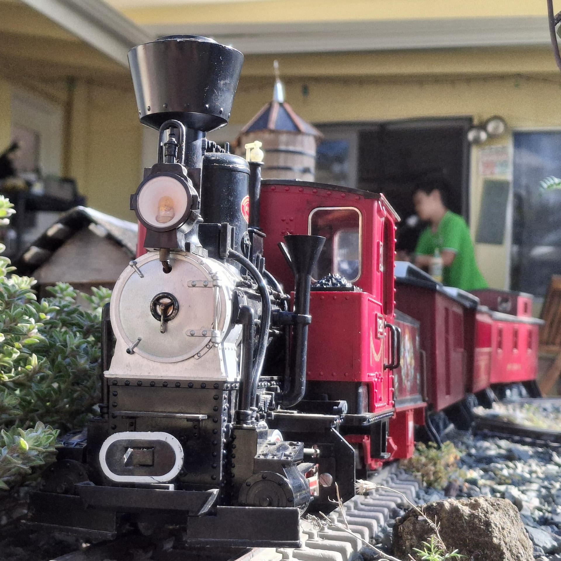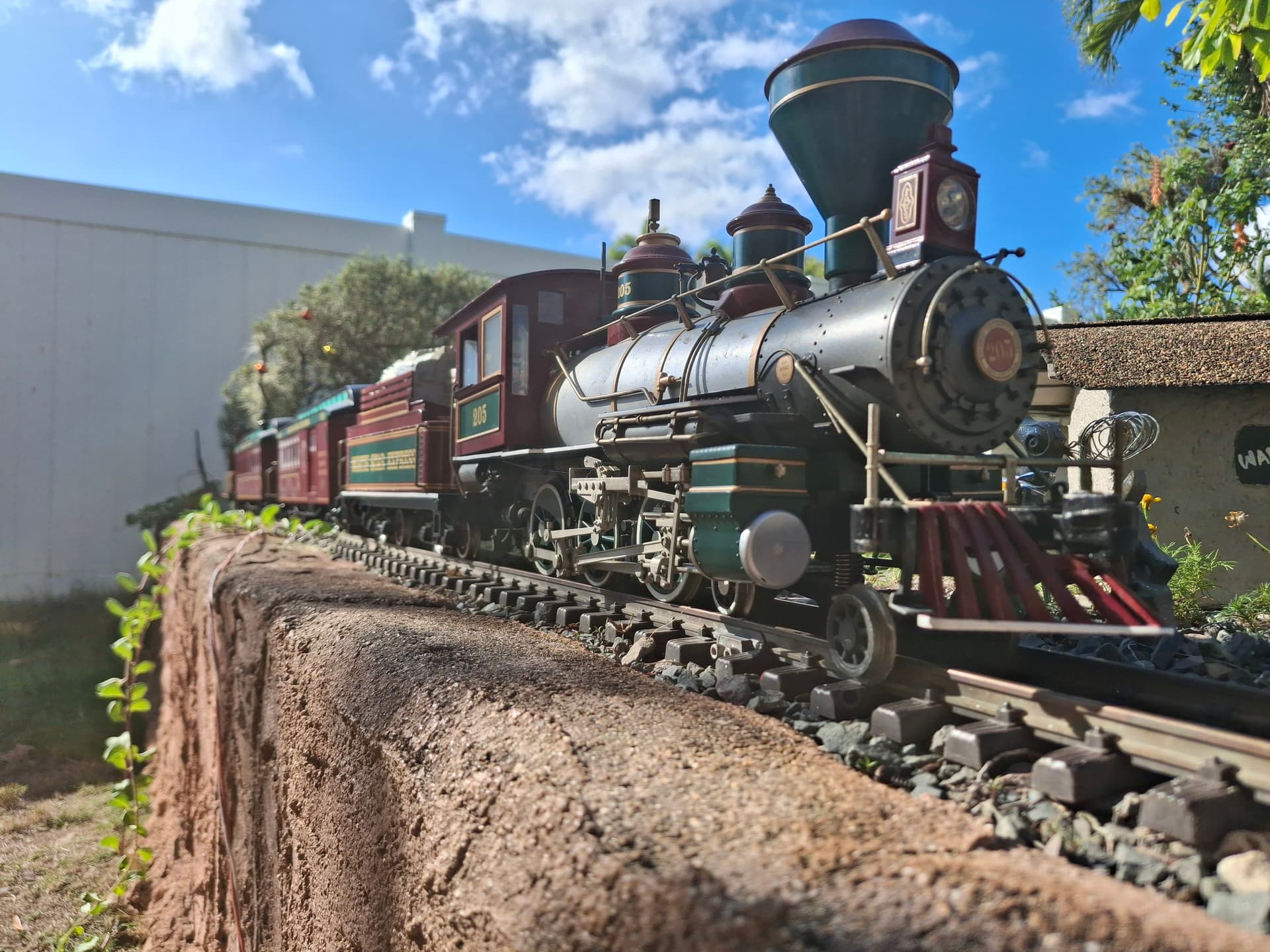This venerable and oft-rebuilt ten-wheeler and her Christmas gloss will serve discriminating revelers throughout Advent and Christmas on round-island tours (Whoops! Didn’t notice that pilot wheel before I snapped that photo!).