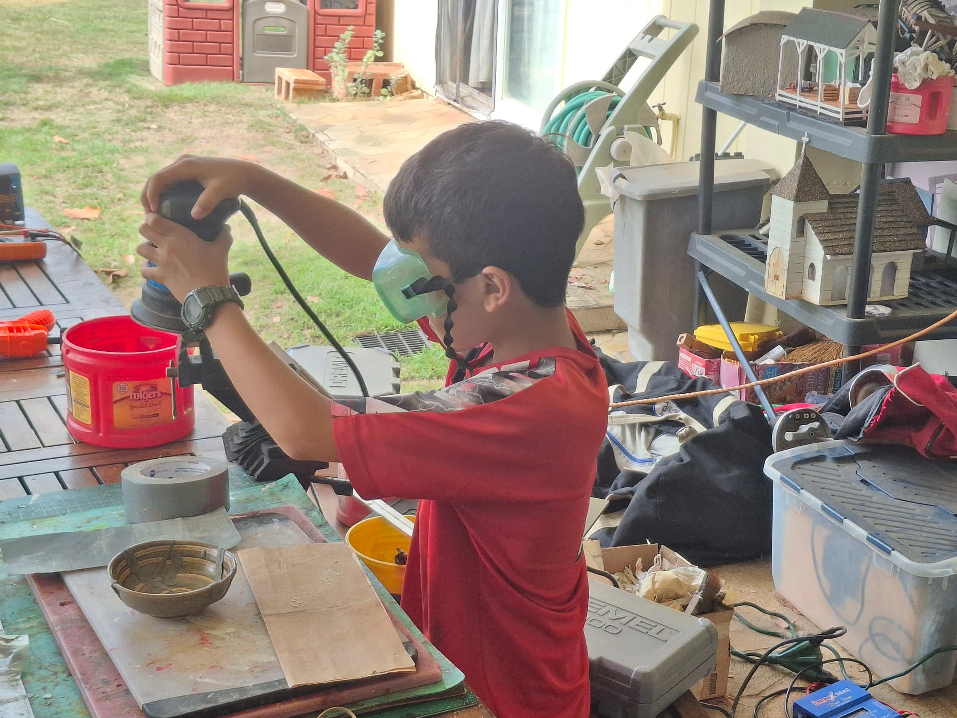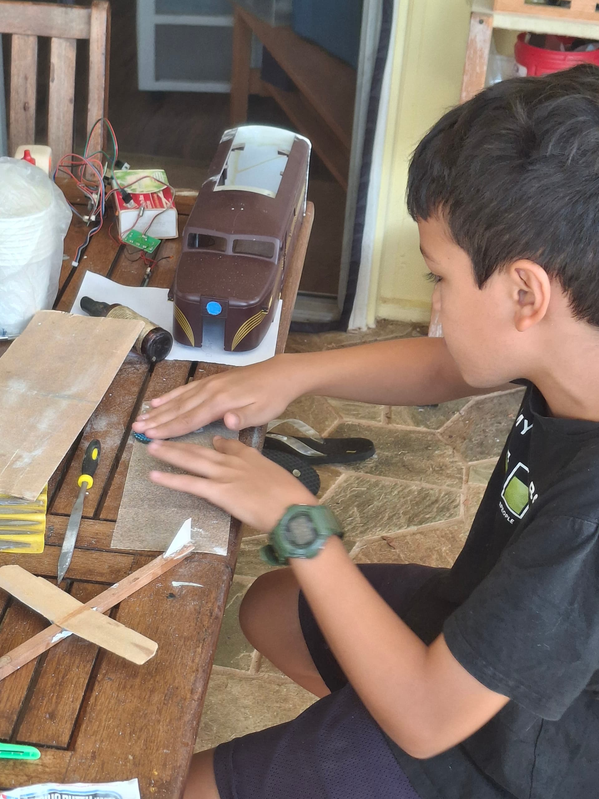 In between this activity, I caught him modifying the shell interior to allow the weight to center over the powered driver.
