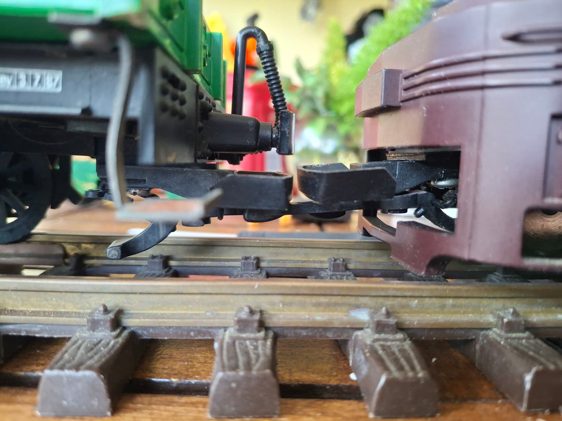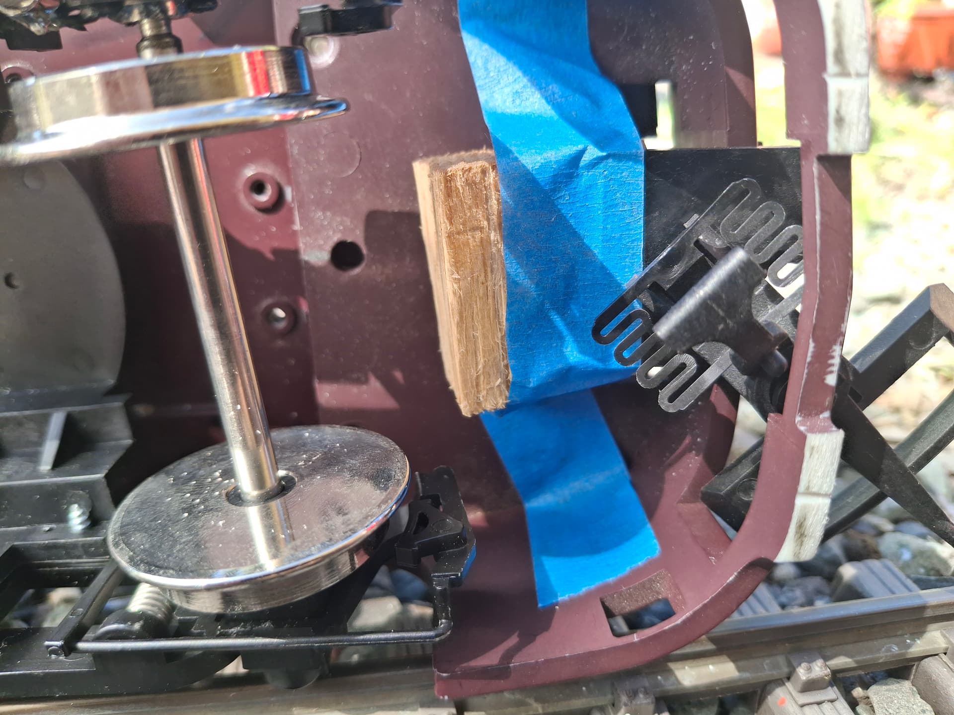 Flush with victory, we took a pair of hook-and-loops from the bit-box, and had a good “think.” I noted a little screw on the back of the USA Trains motor block. He rifled through my box of leftover home improvement doodads, and he found a picture hangar. I bent it to an “L” for him…