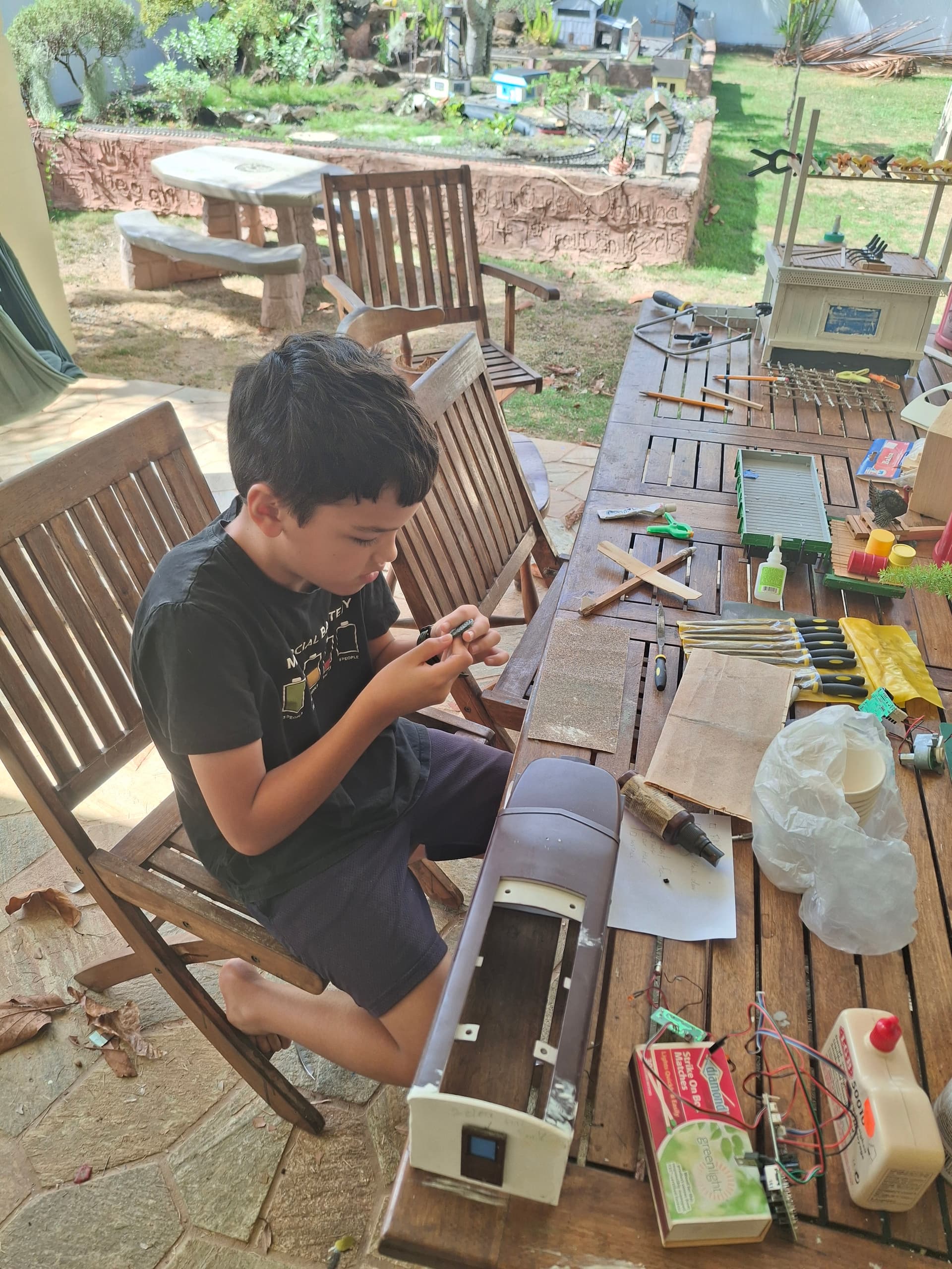 Somewhere over the weekend, we puttered with some electronics. Rooster had provided a smoke generator; I am sorry, but, courtesy of a recent reorganization of the bit-boxes, I do not recall who sent the sundry wires and boards with which we tinkered. Mea culpa, and thank you. My lack of consideration for the generosity of others aside, after I smoked an LED, we figured out how to give AM-critter lights and a smoke generator. As a consequence, Kid-zilla decided to leave off the screws that hold the roof in place. He is busily fashioning a piece of plastic to serve as the exhaust grill. The part caome from a box of “junk” Pete (@PeterT ) had sent along a couple years back. Now to figure out how to mount the smoke generator, lights and circuit boards…