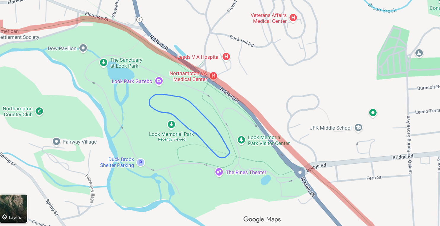 My intention is to create a scene that mimics that which is seen at the local public park here. Sticking with my general theme, the old NYNHH line in this area (red line in map below) used to run right past Look Park, which has their own smaller scale train. (The rough location of the loop is the blue line below.) The original, also below, I believe was 1/4 scale, the newer C. P. Huntington that the park now runs, is larger.