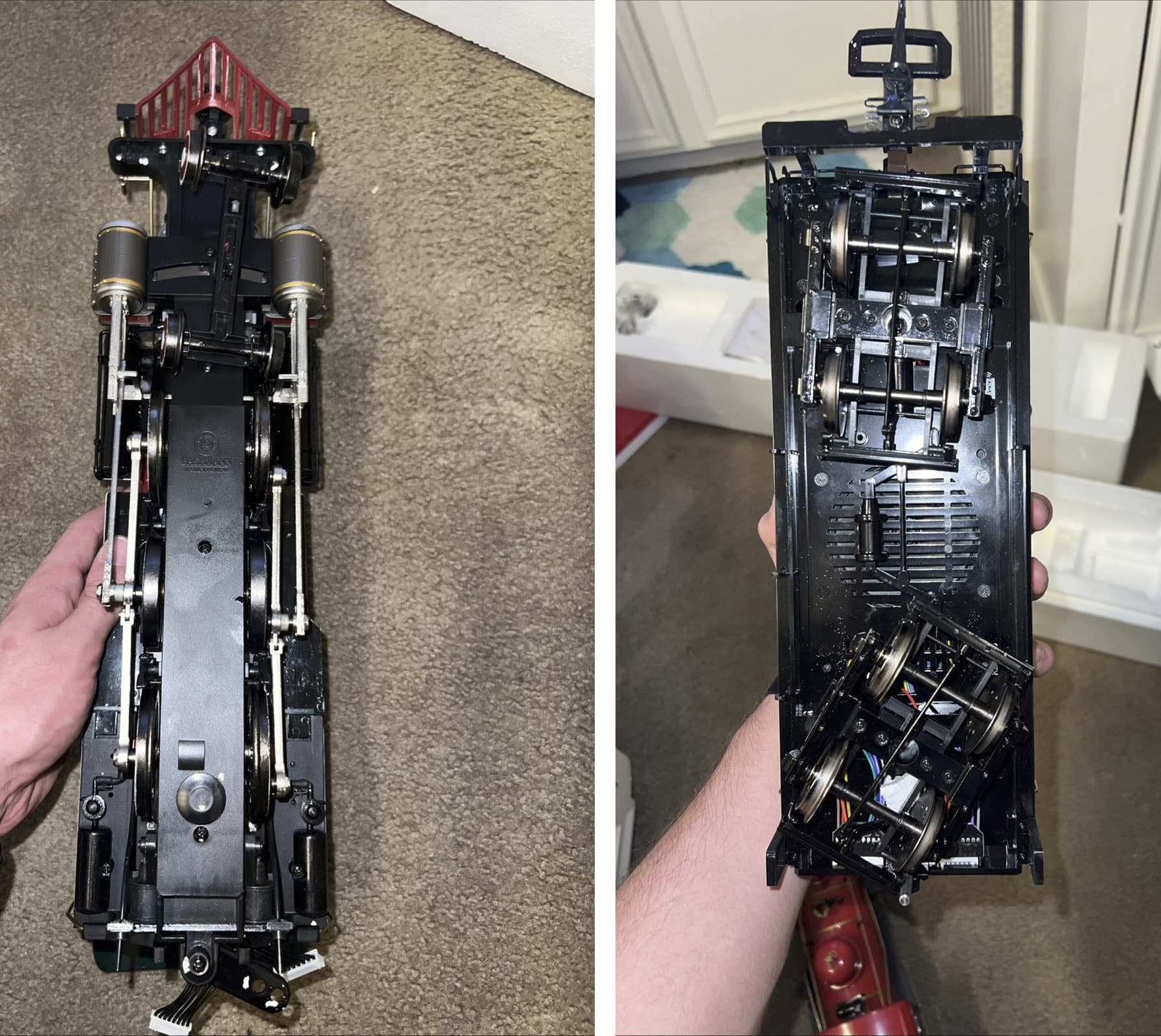 The tender wheels look slightly used, and it has a big hook-and-loop coupler which the prior owner must have added. The loco chassis looks new and never used. All the spare parts are in the box, including the crew and a knuckle coupler.