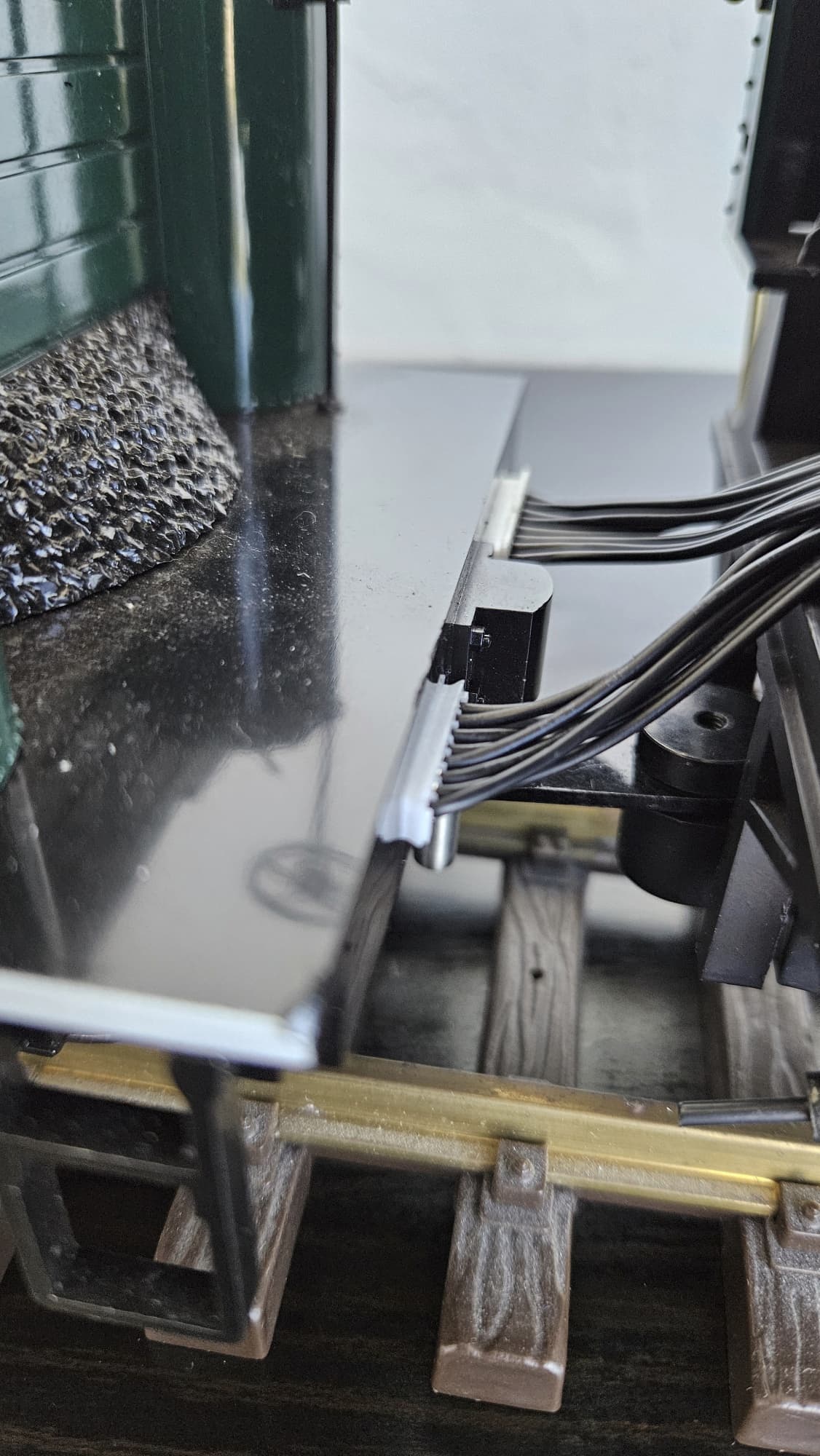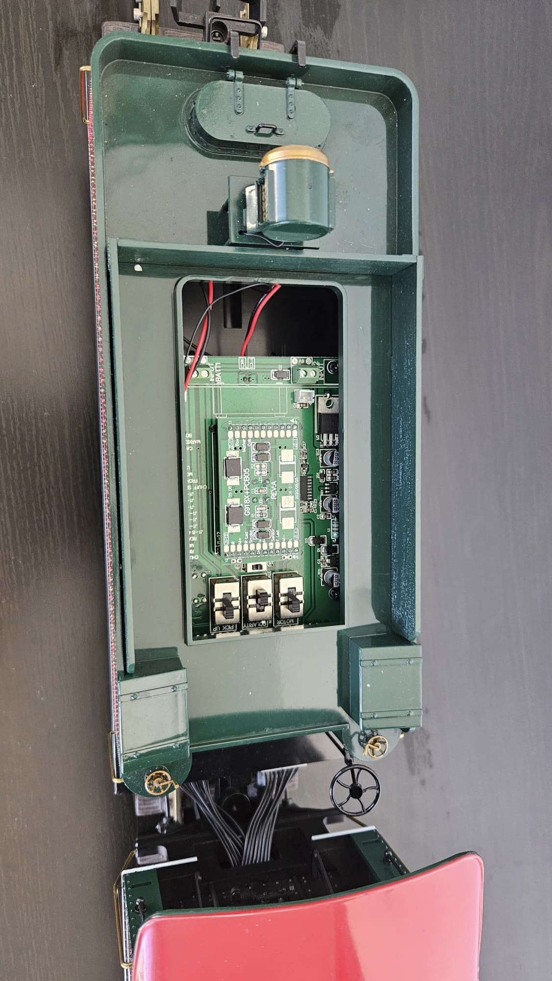 However, someone substituted an Anniversary chassis for the original. The Anniversary models are well-respected and reliable. Whoever did this used the PCB from the original chassis so it still has all the wiring connected to the tender plugs, ready for the control system of your choice. The Anniversary models do not normally have the plug-n-play, and it has Bachmann’s regular basic pnp board installed, which allows it work with conventional track power, plus the ‘pigtail’ board that replaces the basic and allows you to wire in any DCC decoder.