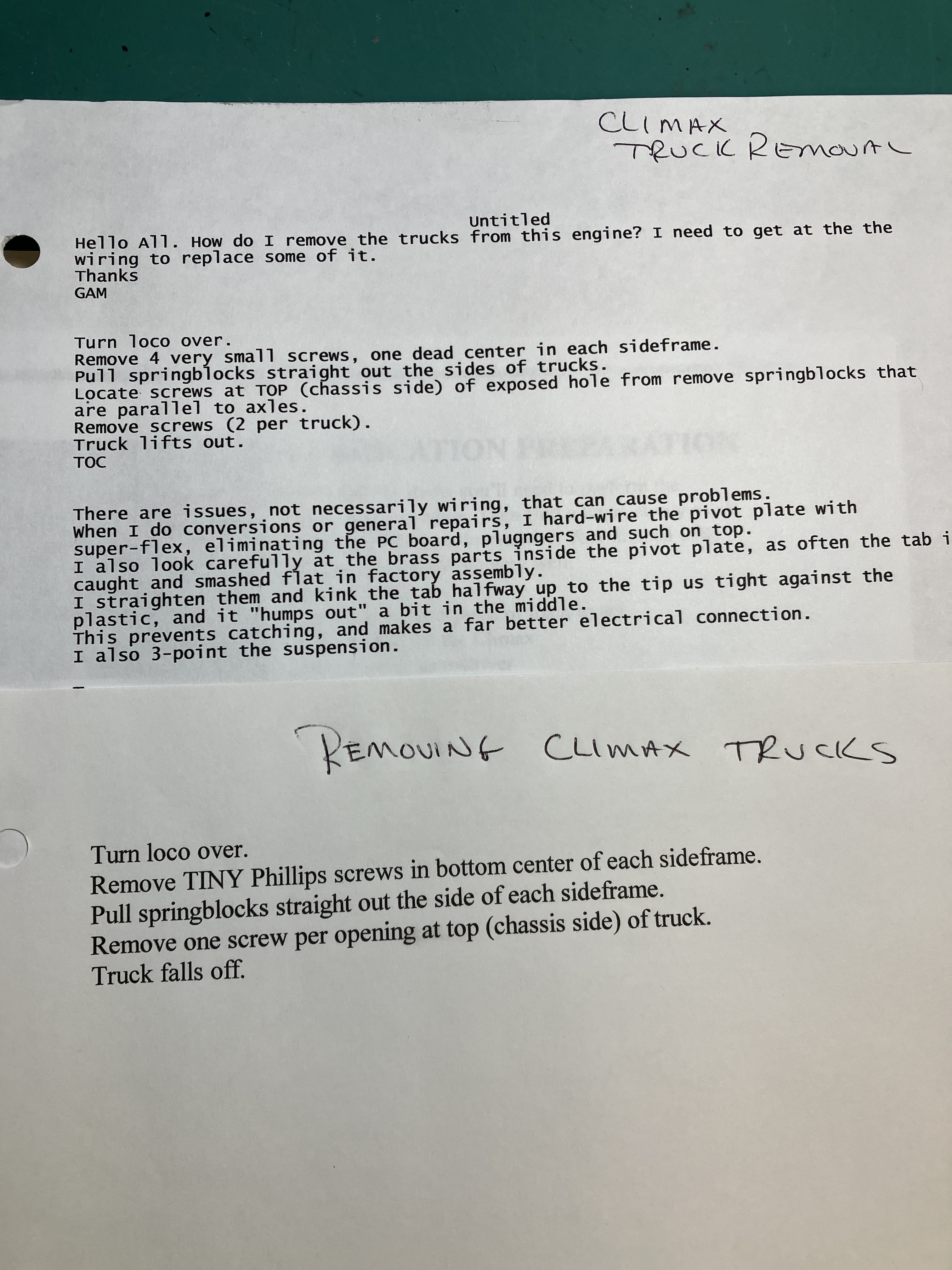 That says it. For an older Bachmann Climax with the, “solid,” rear drive line, I need to replace that with the updated drive line that will spin free. Have the part. One popular site has info, but says to pull out the drive line from the rear truck drive line sleeve to give room to remove the two screws on opposite/yoke end. But that line is intentionally long enough to, “not,” slip out. Do I have to remove the rear truck some to give me enough slack? Foolishly simple little update here, but I’m doing all the homework I can first. Tips appreciated, Dennis