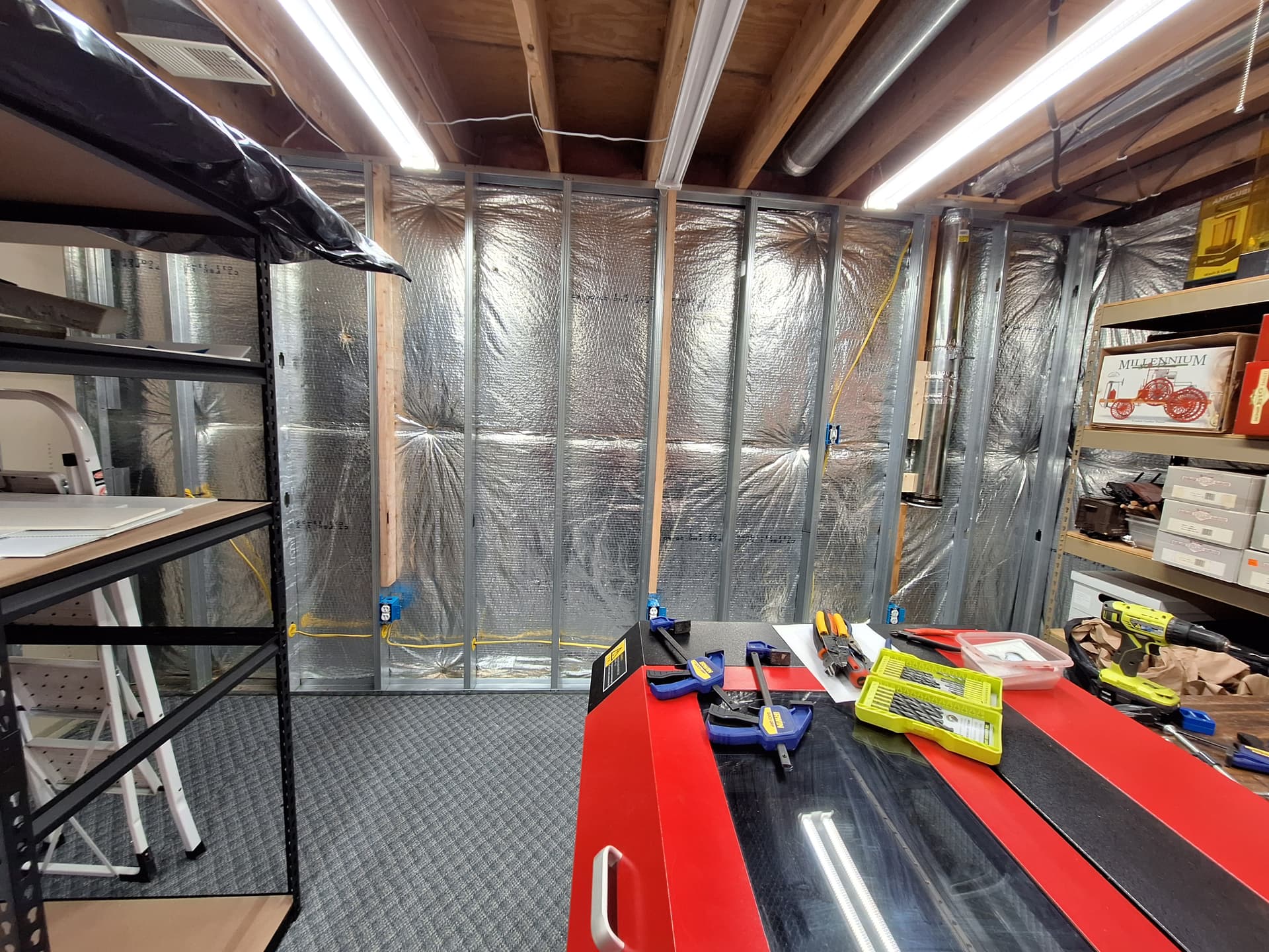 - Finishing the exposed wall of the new laser room with studs and plywood paneling