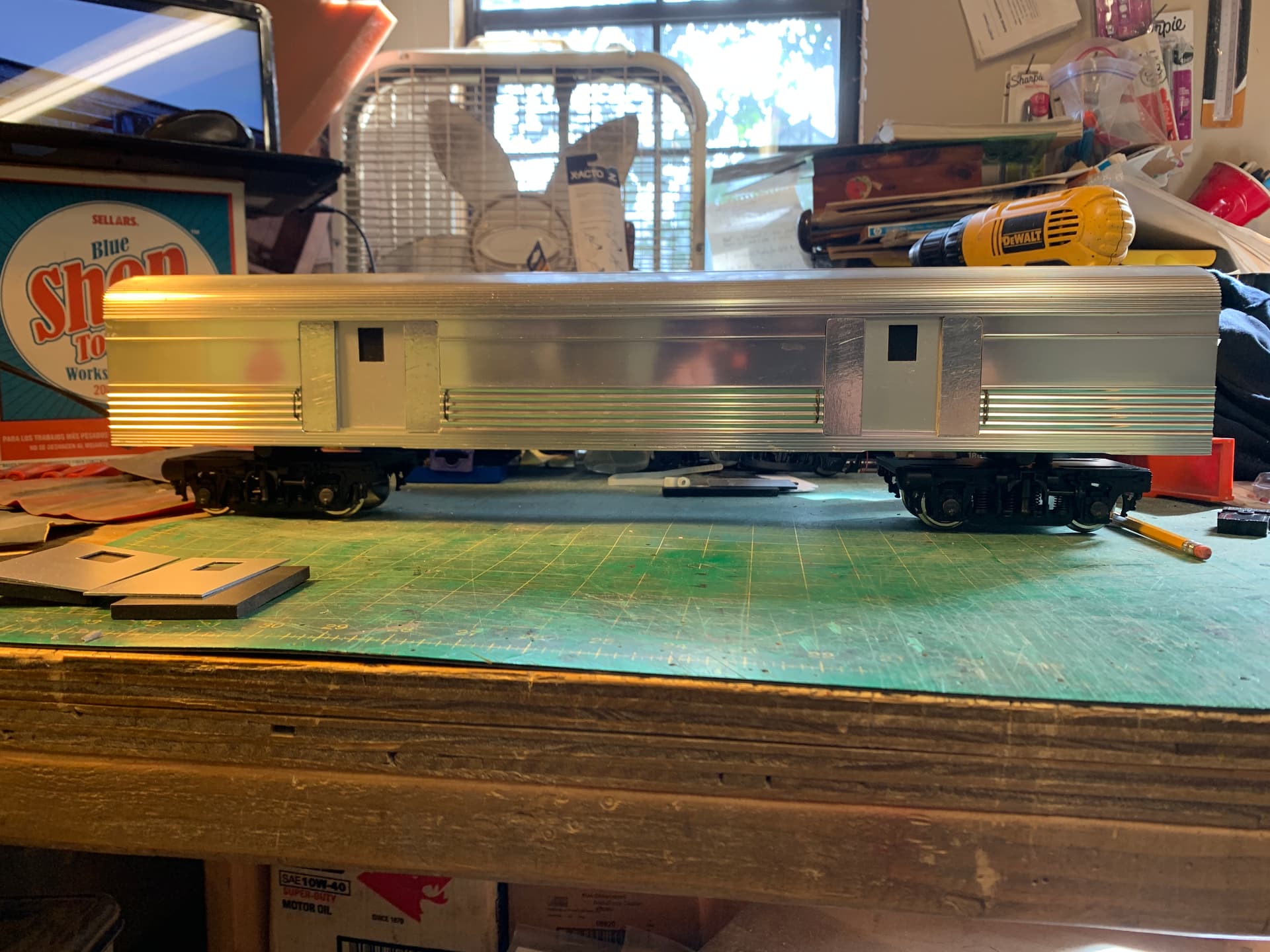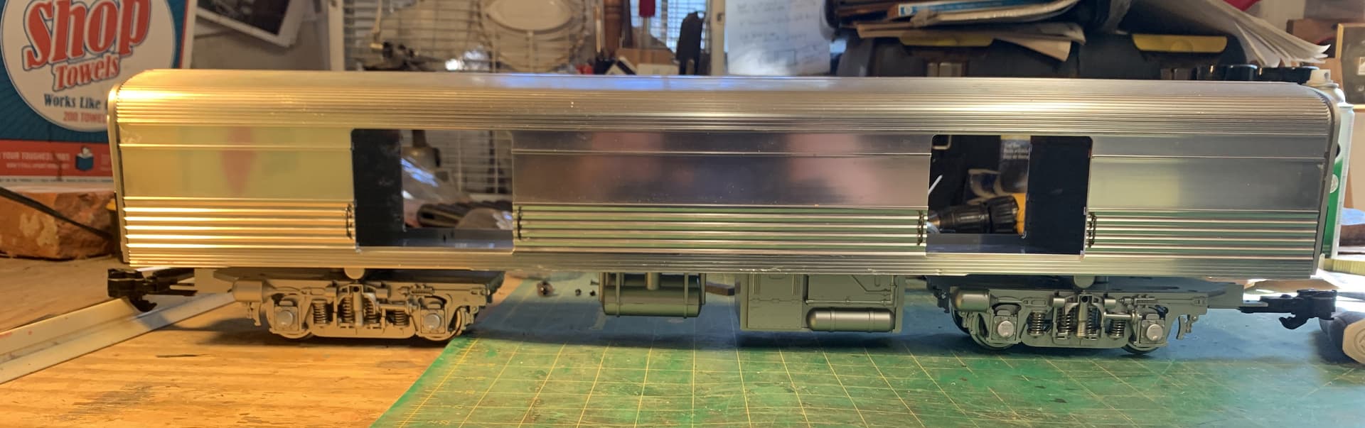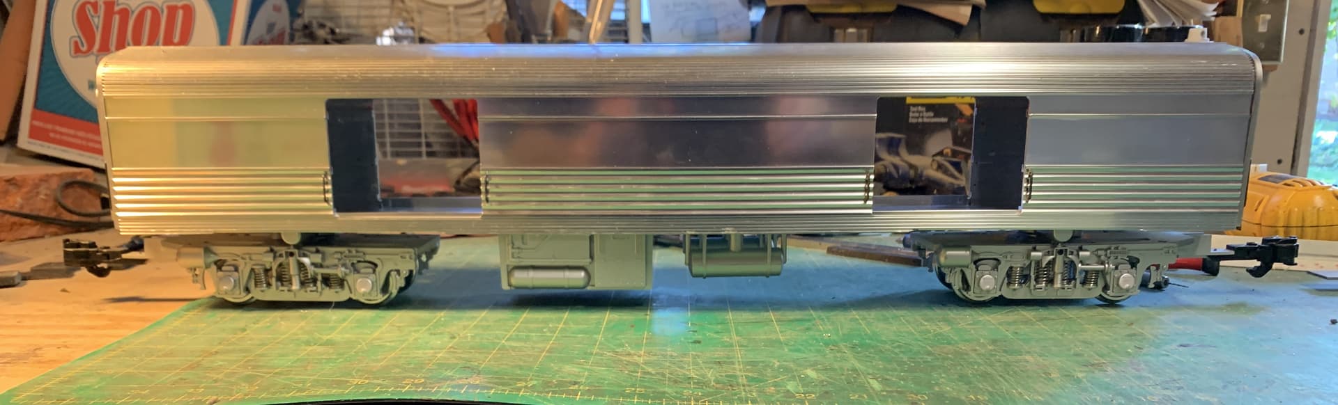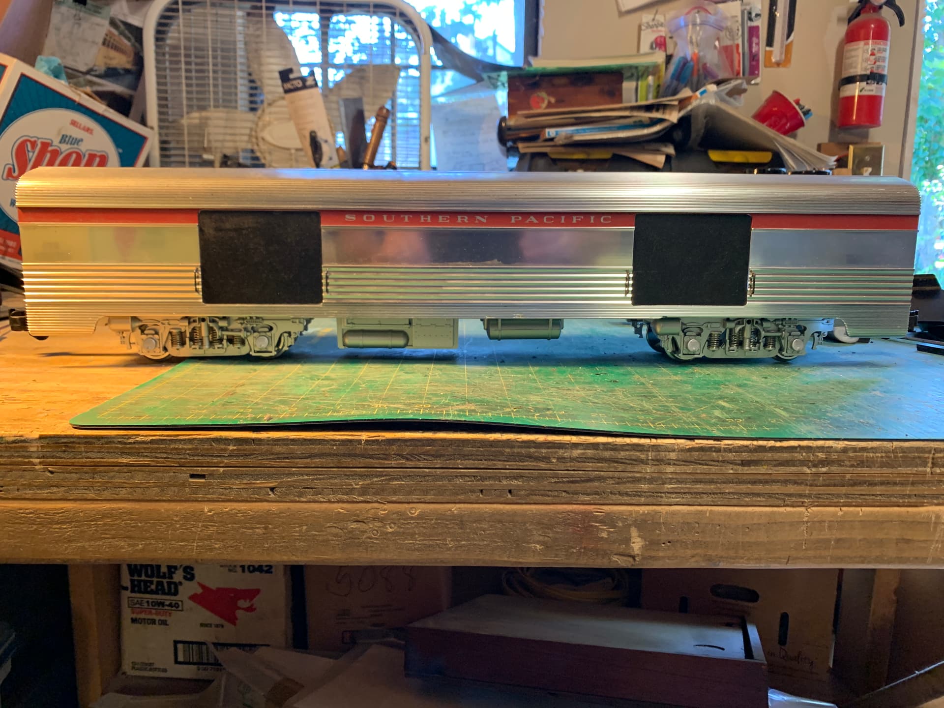 So in Amtrak fashion I cut off the lower skirting (for utilitarian access) this is how the car sits with lower skirting cut and at factory height (which I may have to raise up) and not lower in order to mate with my scratchbuilt and LGB stuff.