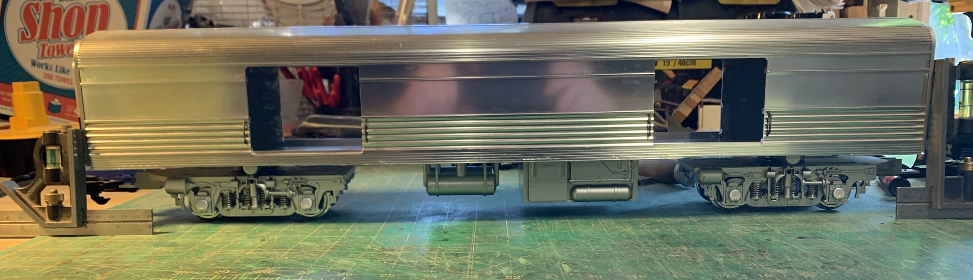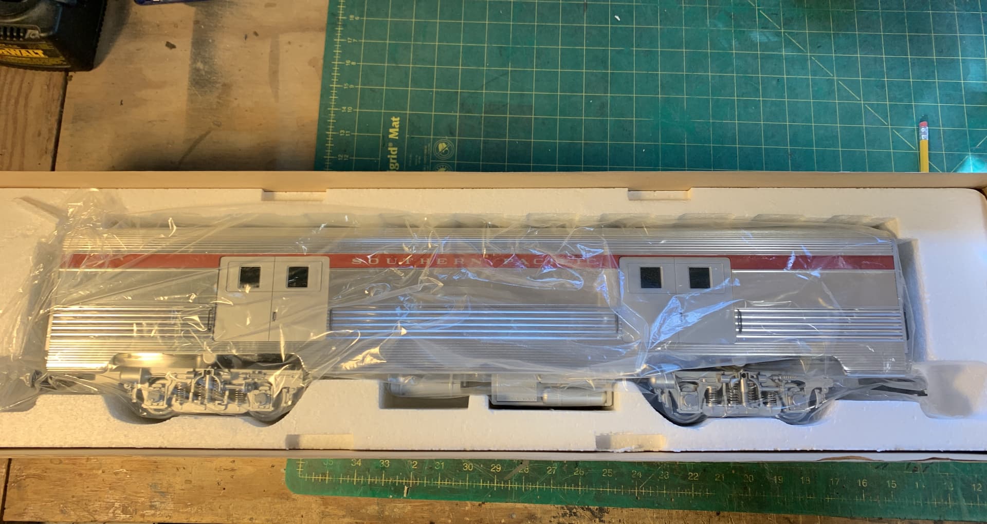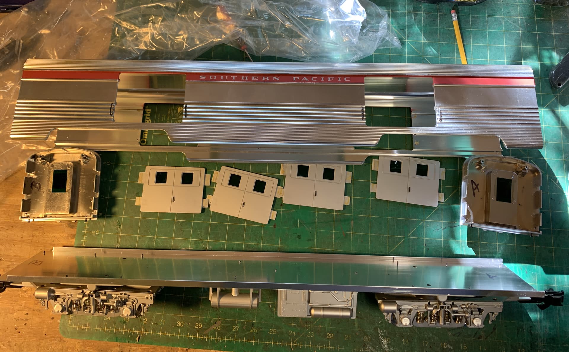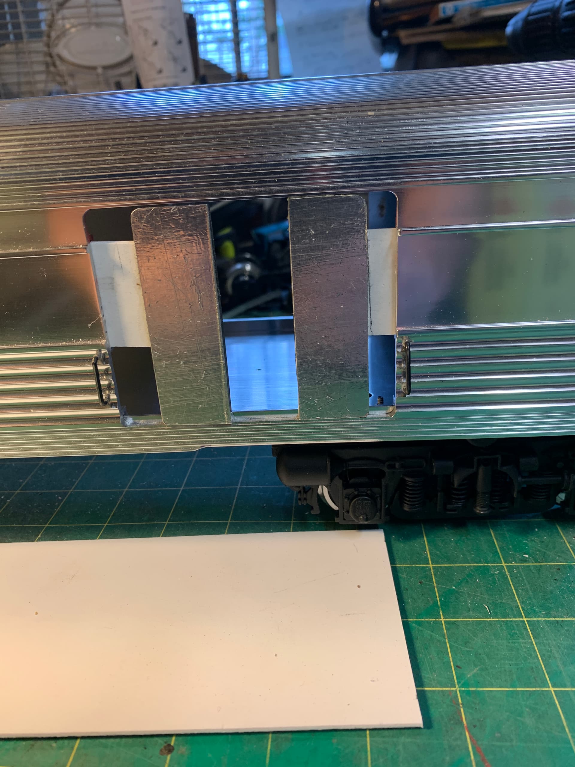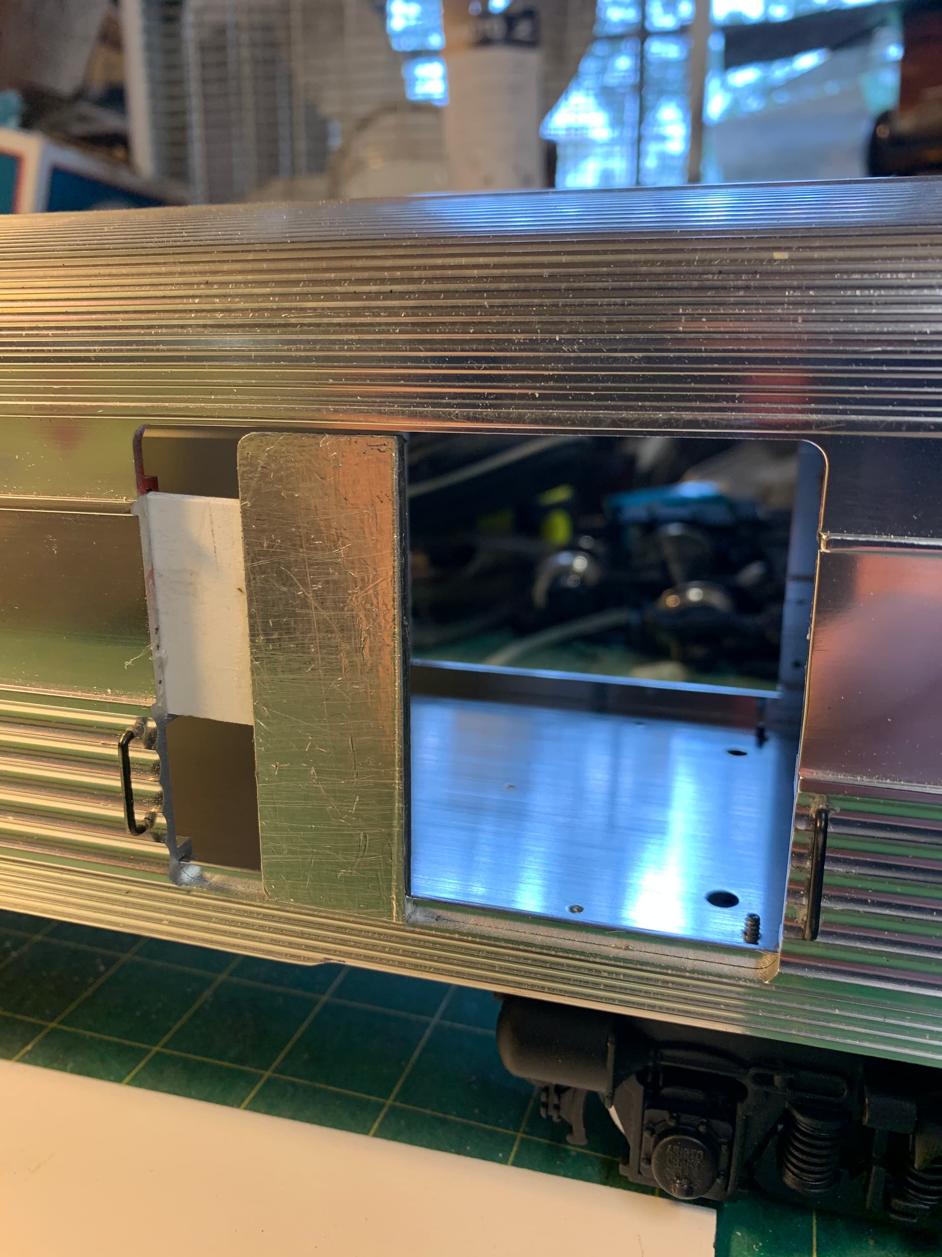 So in Amtrak fashion I cut off the lower skirting (for utilitarian access) this is how the car sits with lower skirting cut and at factory height (which I may have to raise up) and not lower in order to mate with my scratchbuilt and LGB stuff.