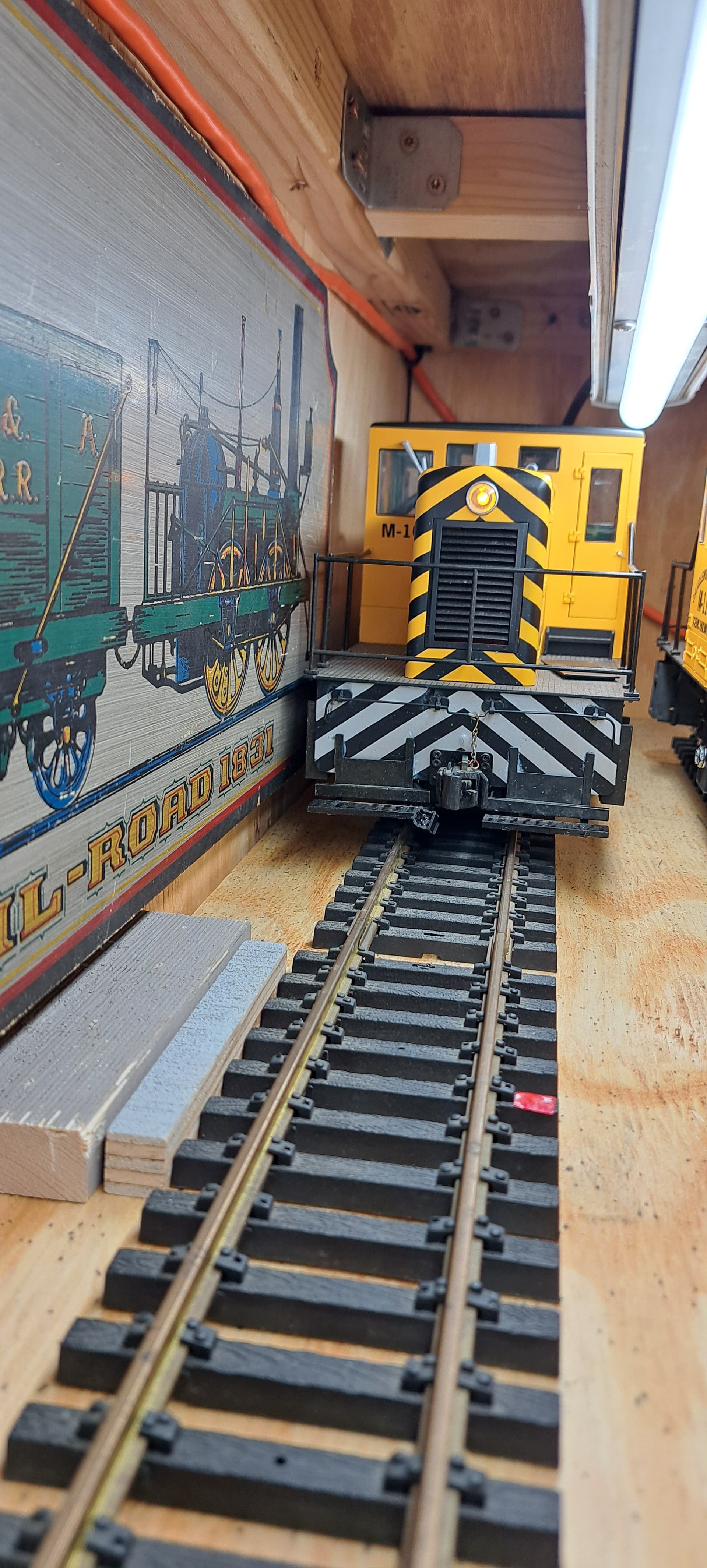 I have one more test to run, but I haven’t located the cars. My Bachmann Murphy Roof box cars are the tallest and widest cars I own, and a bit longer than the diesels. Before I cut plywood and screw down track I need to be sure the curve ends are not too close to the wall.