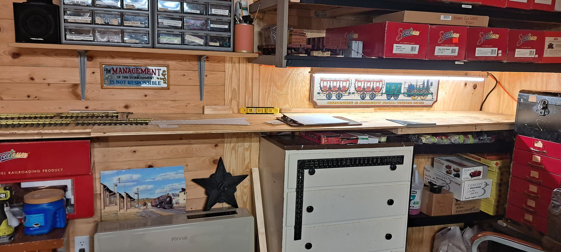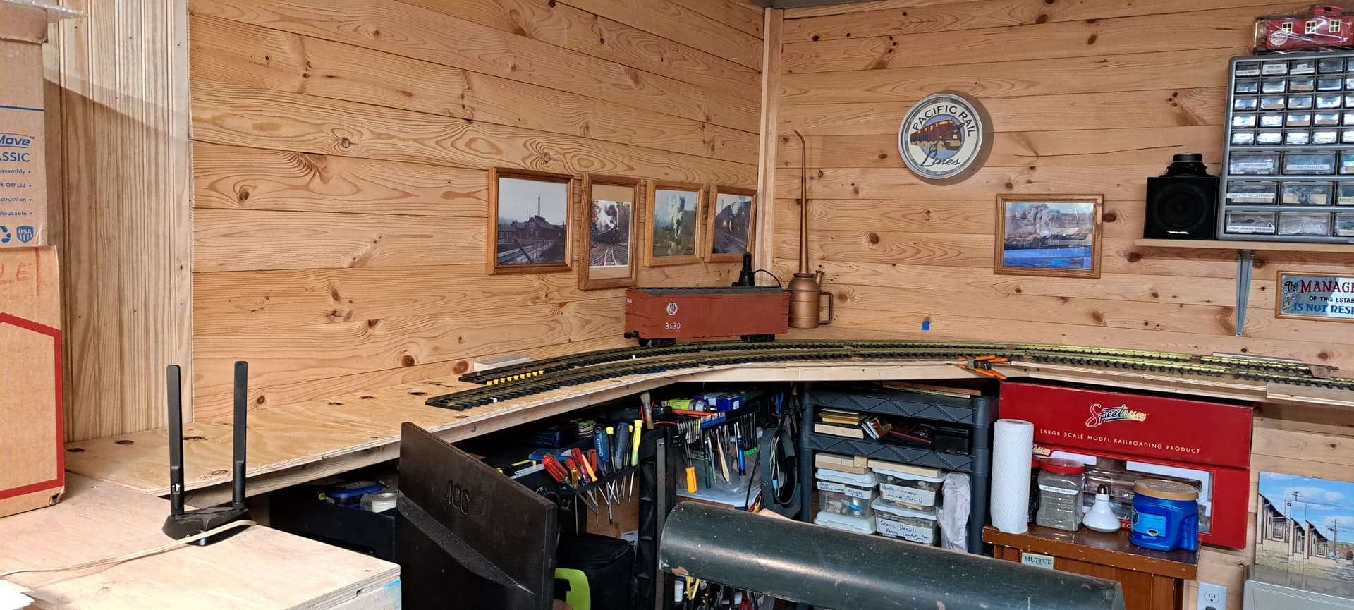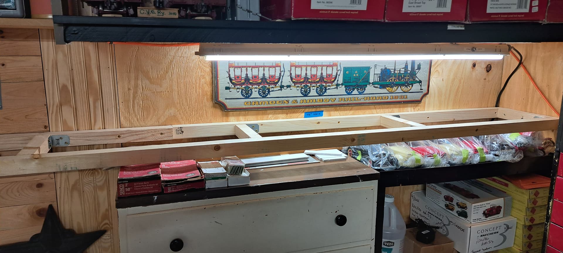 The area at left is above my big toolbox. It will be R1 territory and accessible only via the back track which is a ramp raising 8" between the switches.