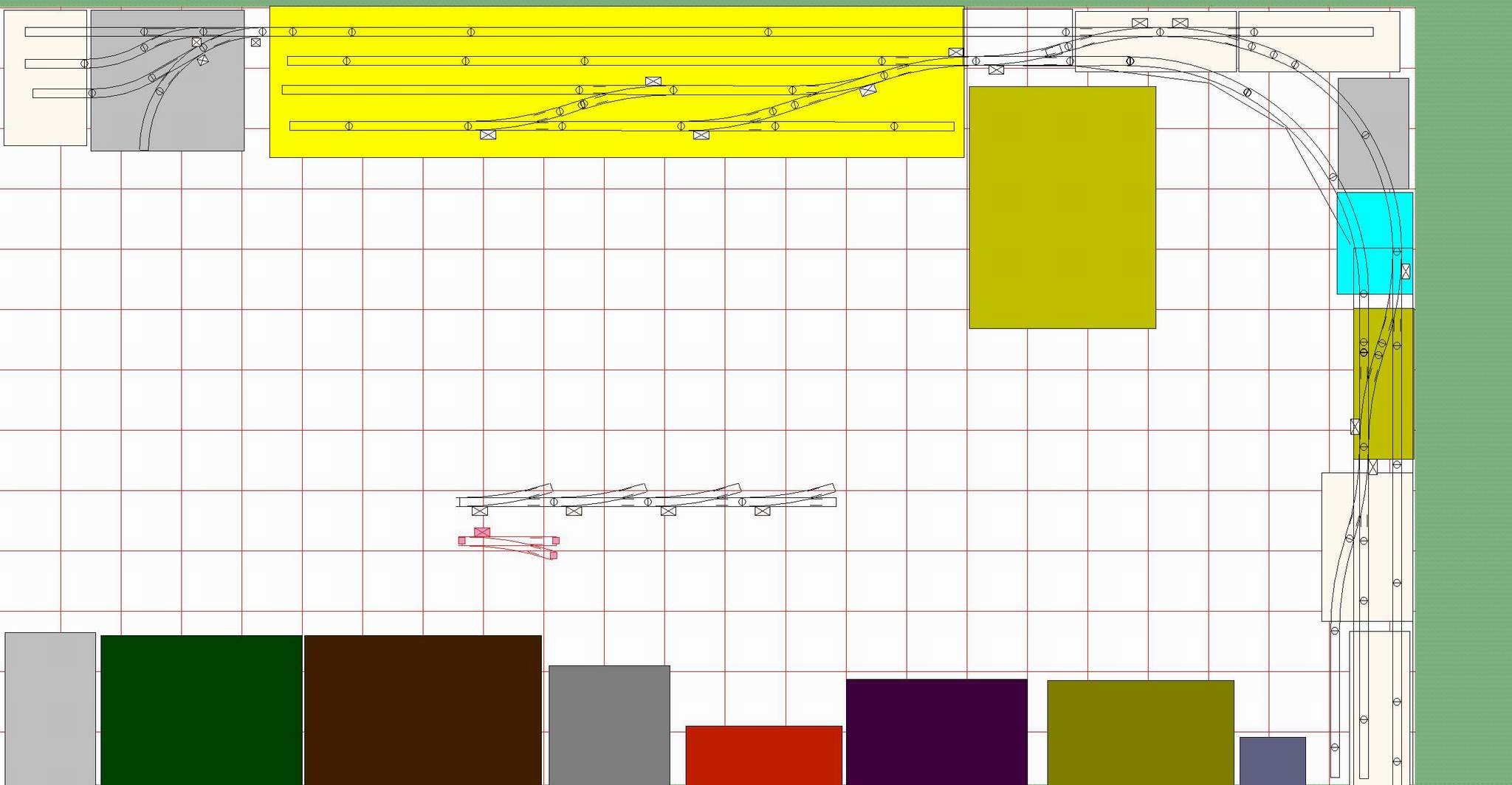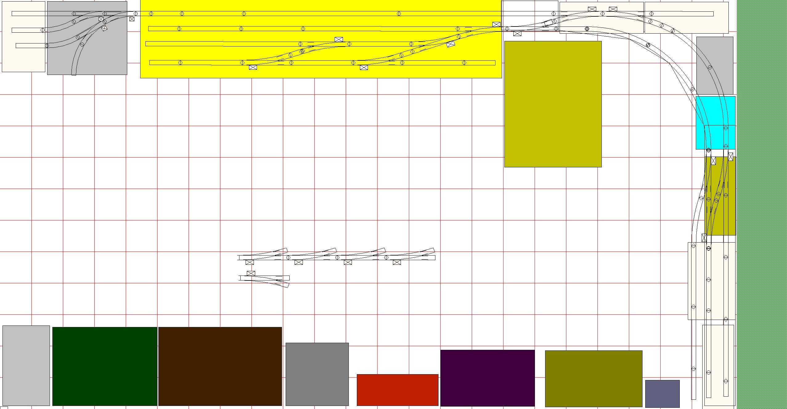 The top most track will be a steep ramp up to the R1 industries. Other than that, the rest is very much in flux. I’ve played around with the yard at the right. I may move the run around up to give it a longer tail at the expense of the outside siding.