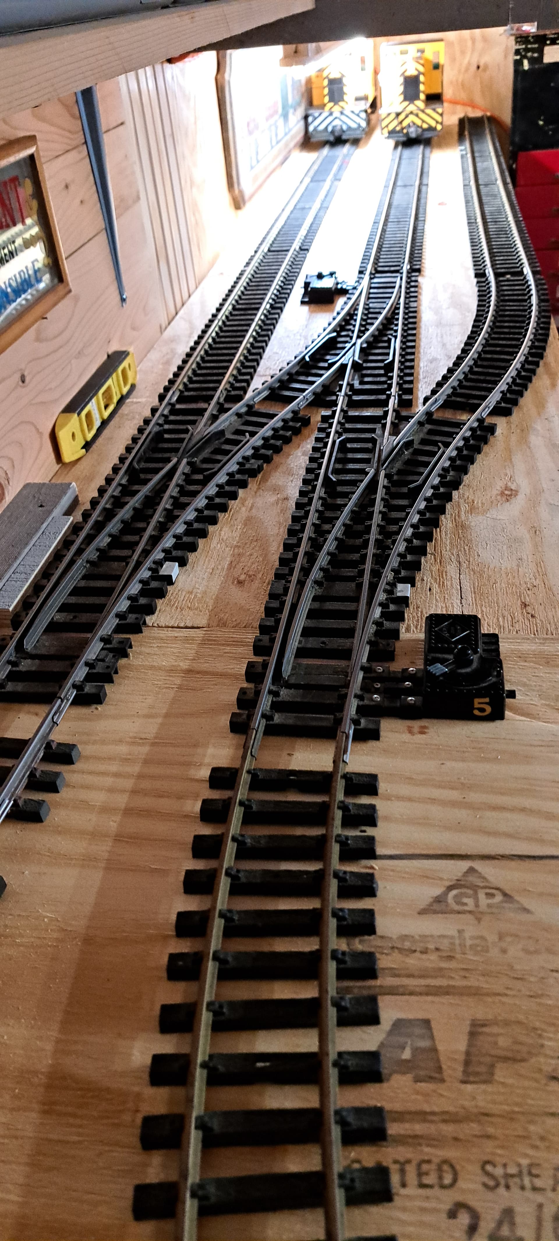 That track center is spaced 4" from the wall. . The center track is set to 7" on center. It’s 6.5 to the outside track The crossover switch creates a pretty tight S curve. My 40 footers get through it. I’m sure my Fn3 coaches will not. I had a similar situation in CT at McCown Freight Forwarding. I just need to go slow and watch light cars.