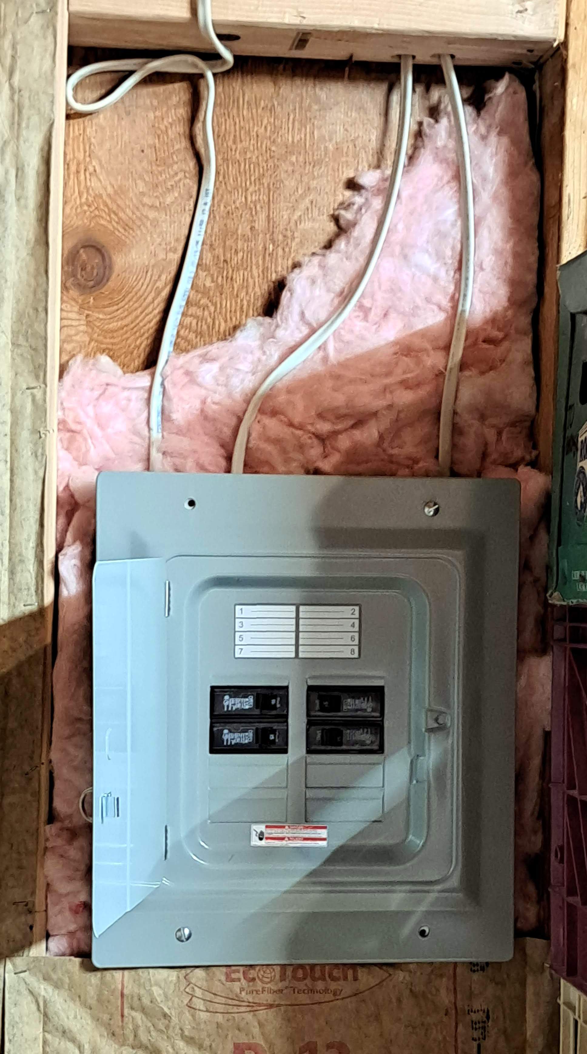 This is the sub panel I installed. The cable that goes over the surface of the framing is for a temporary wall outlet that can now be eliminated…