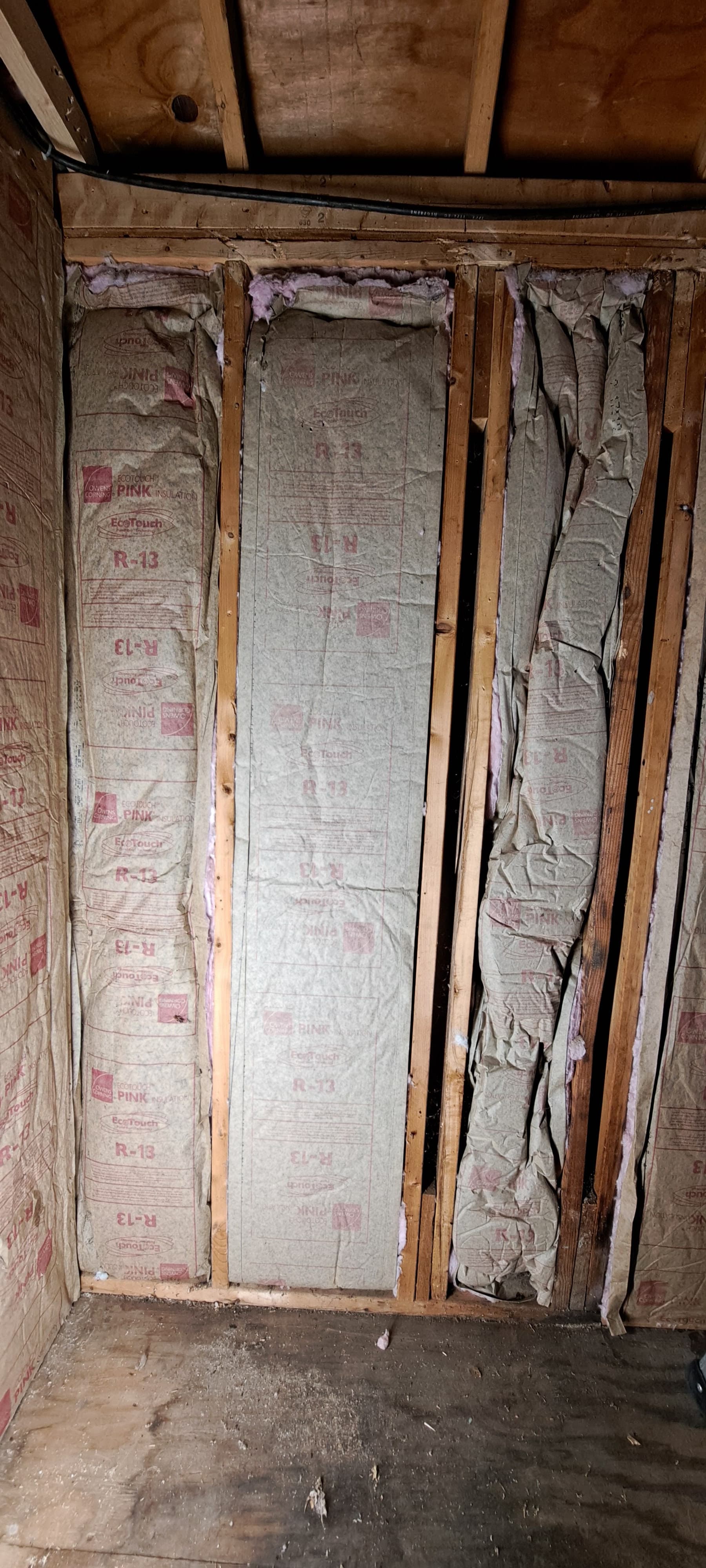 Tomorrow I’ll re-do that insulation I removed and exposed to install the right hand outlet. The original insulation install is not correct with pieces folded and squashed to fit.