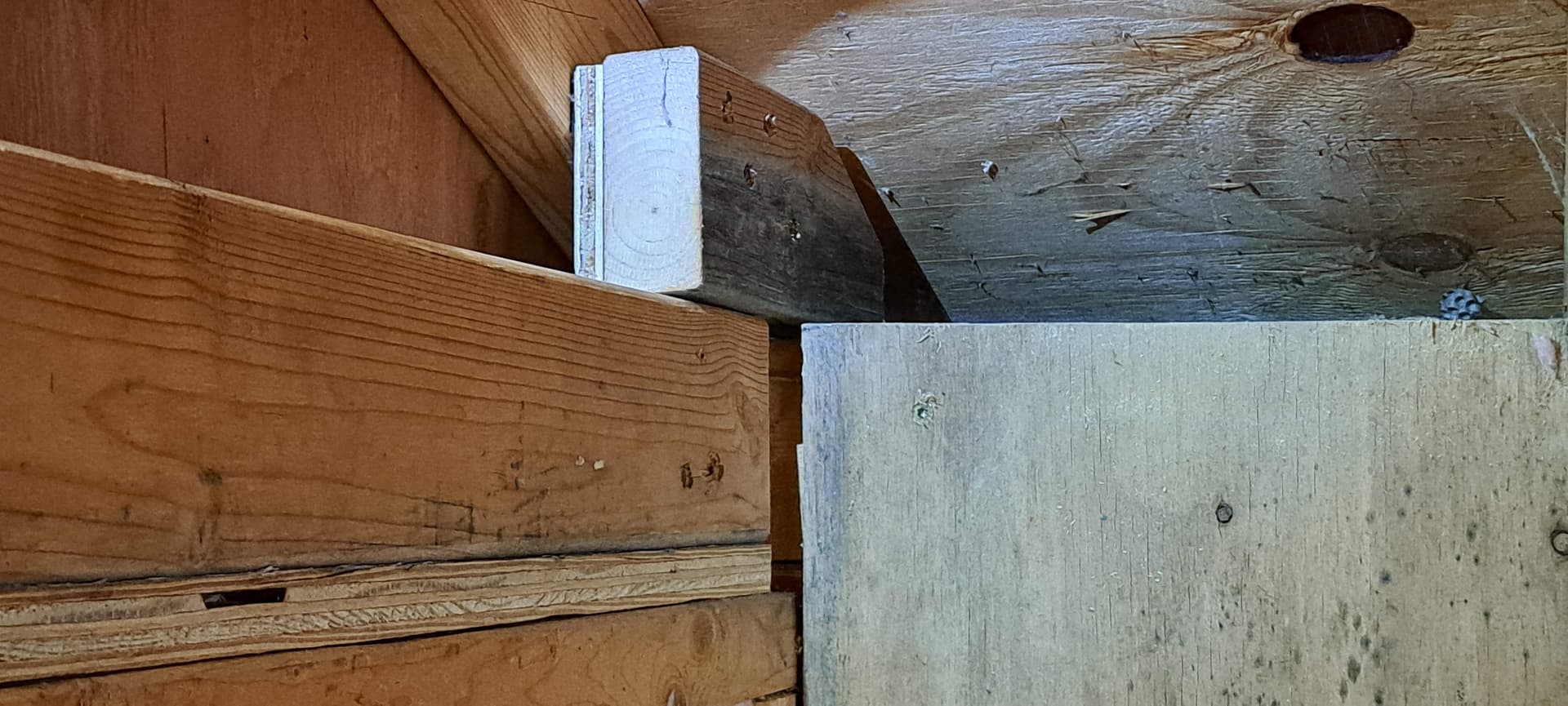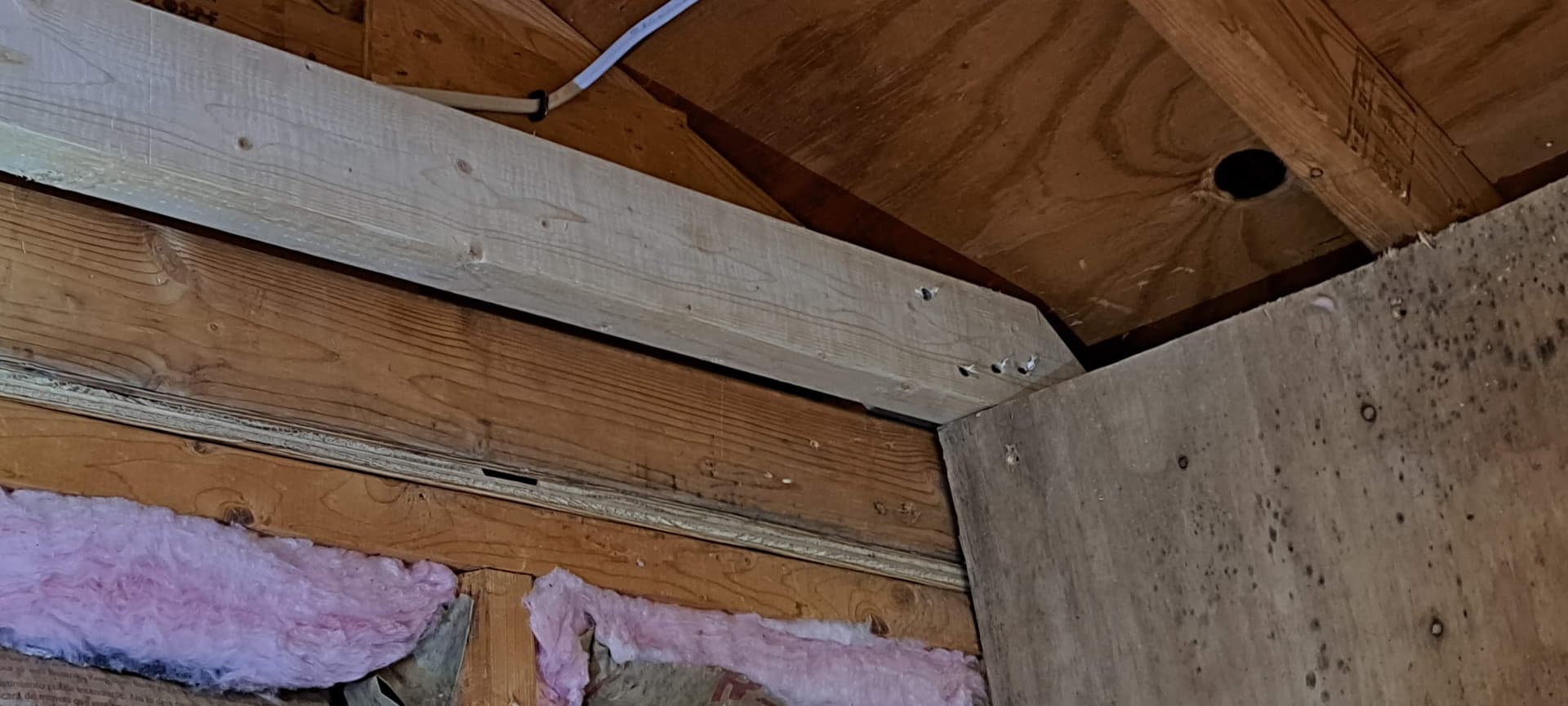 Every time I take down an old plywood wall panel I find surprises. Today I needed to remove a wall panel that was cut too tall for my cieling joists to sit on the top plate. Fortunately they all are installed with star drive screws, so removal is quick.