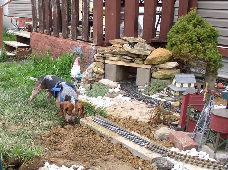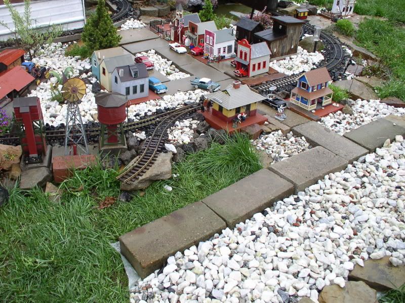 While looking for the boiler for the Westinghouse project, I found a LH LGB r-1 turnout that I’d forgotten I had. And Kim decided she wanted more space for her herbs. Sooooooooo, whatever day it quits raining I get to dig out some sod. How long it will be and what it will serve has yet to be determined. The patio block edging between the layout and the path she’s having me build (we’ll set red stepping stones yet) is going to be a road. So I need to scrounge even MORE buildings and a few cars… Wheeeee!