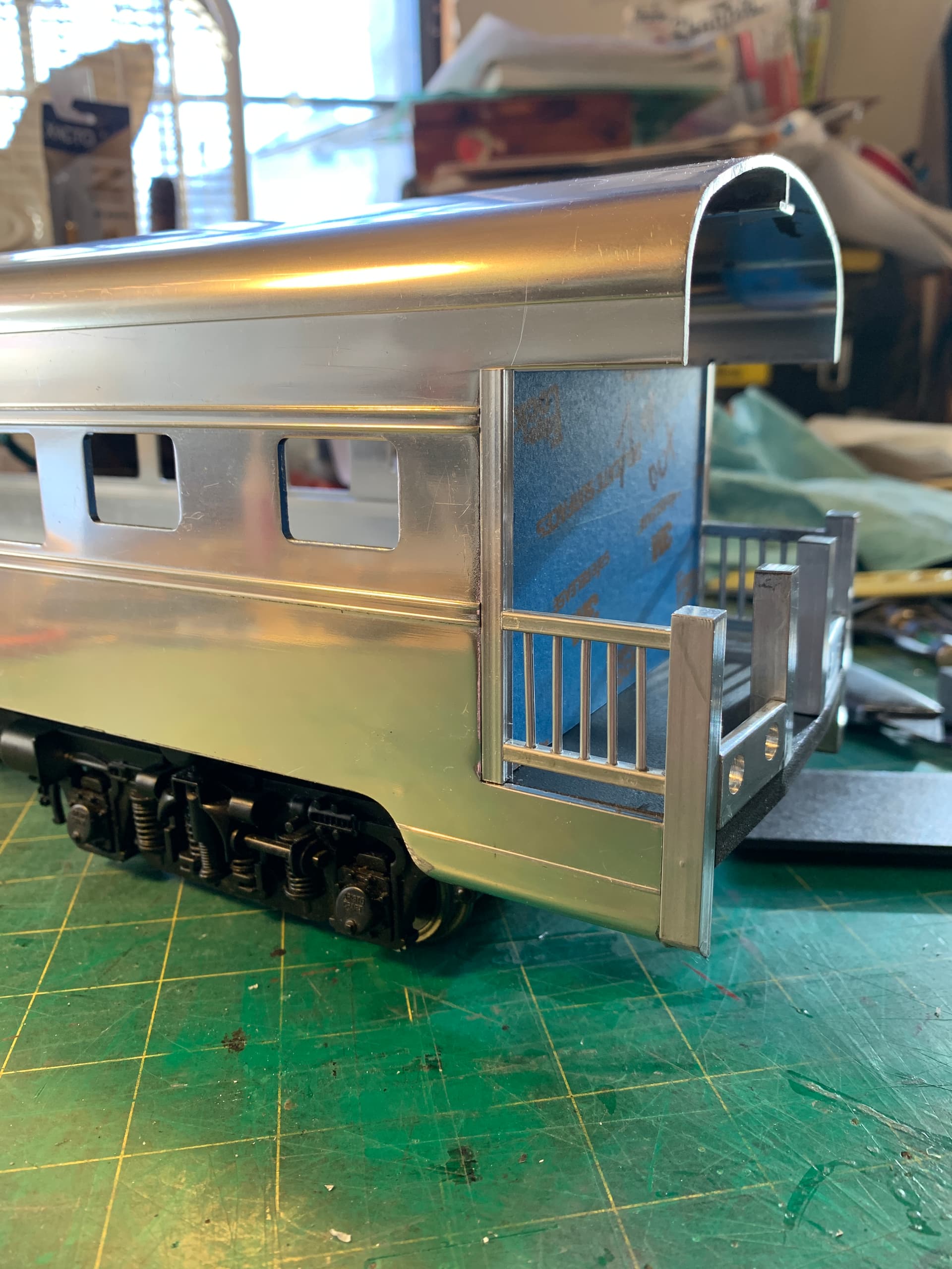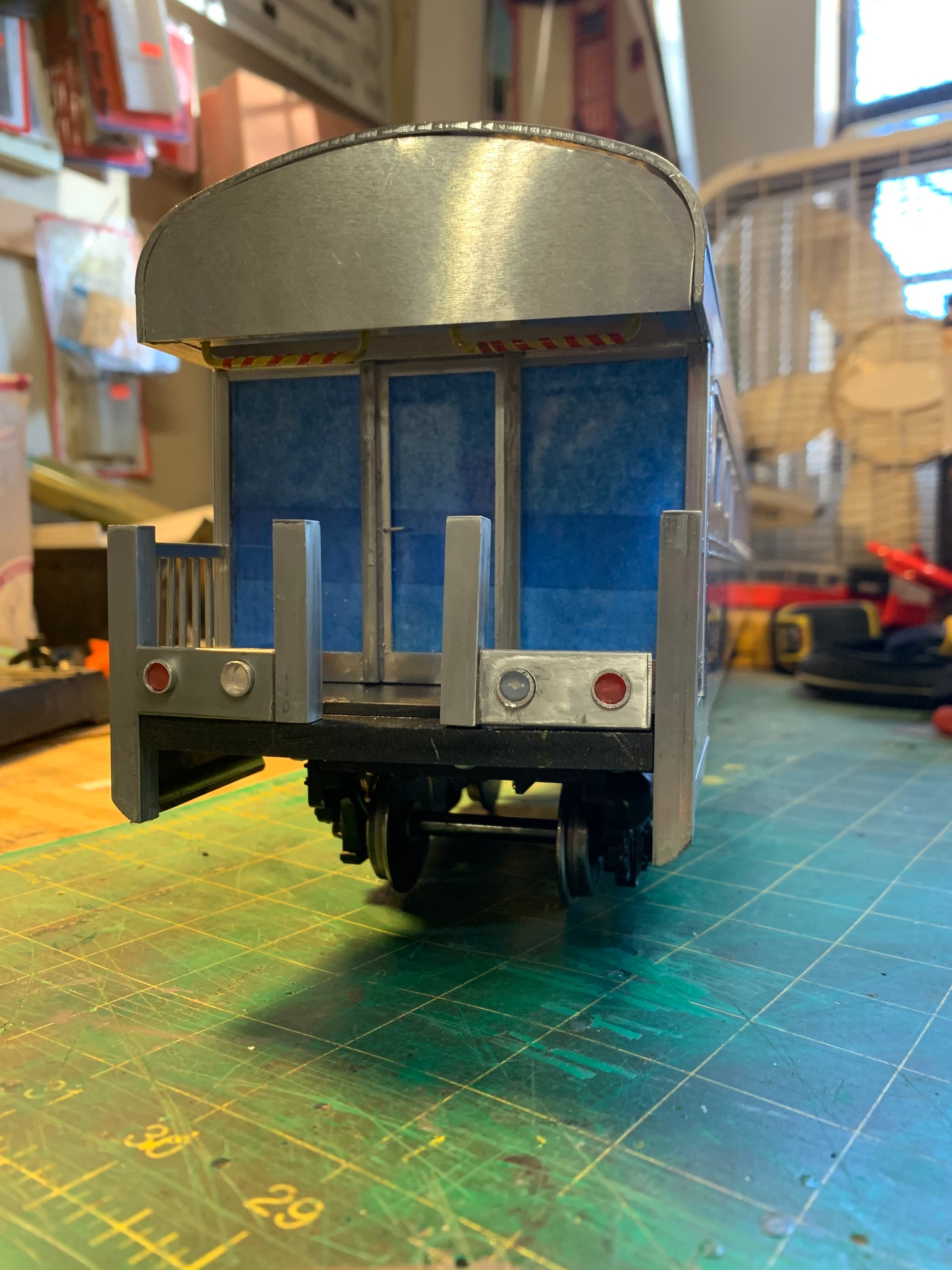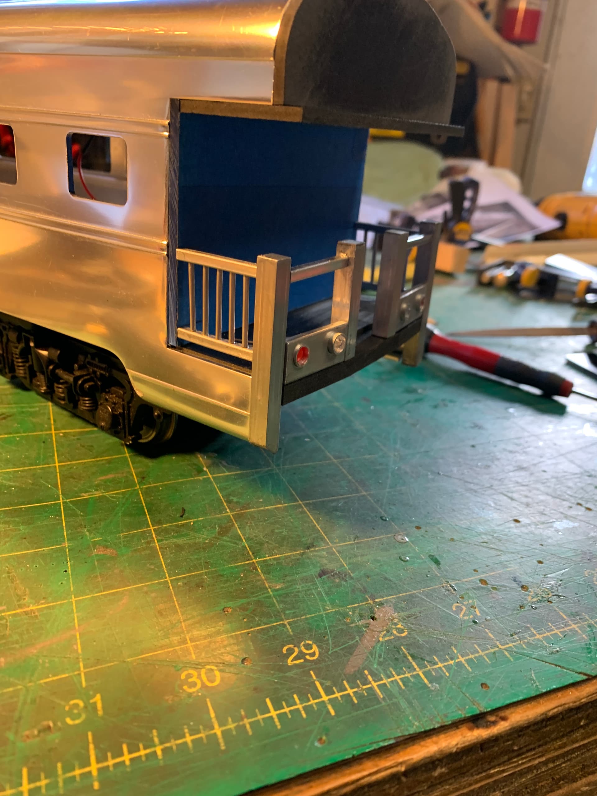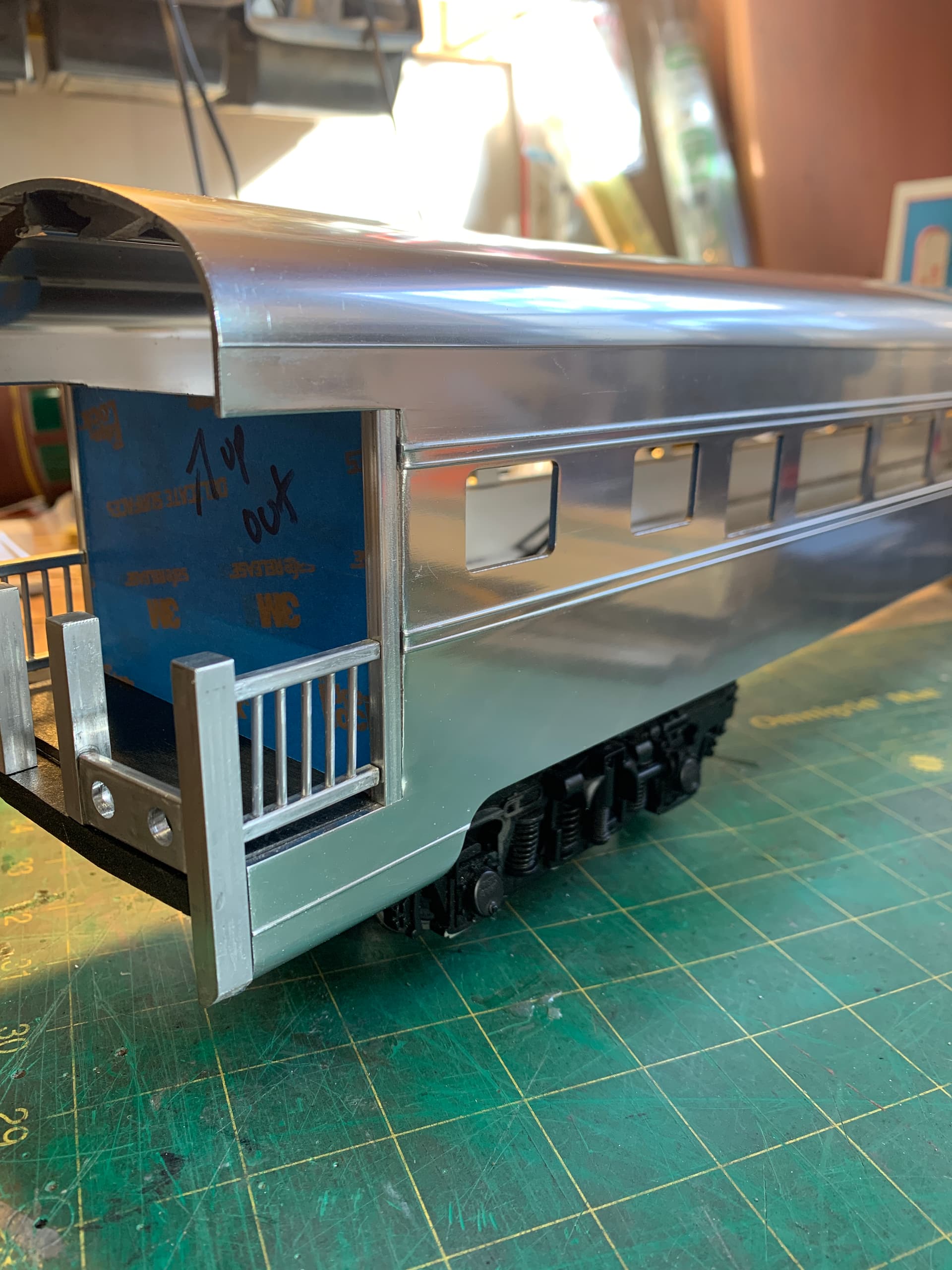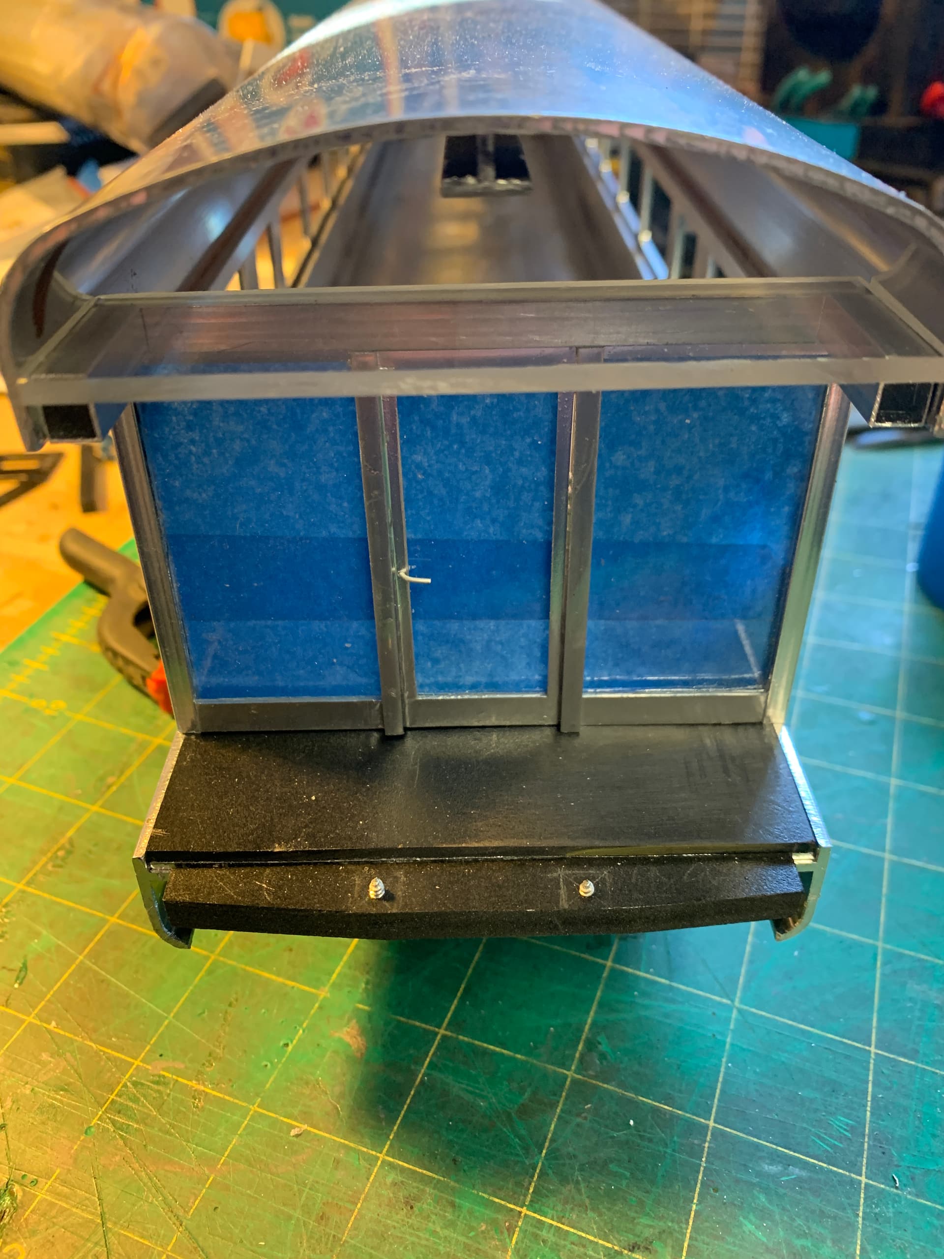 I removed the mocked up end wall, scribed (best I could) and set it back into the car as it should be. Then added the 5/32 aluminum side caps to the acrylic with my favorite glue. Included both sides for Hollywood cause he always asks about the other side of the car.