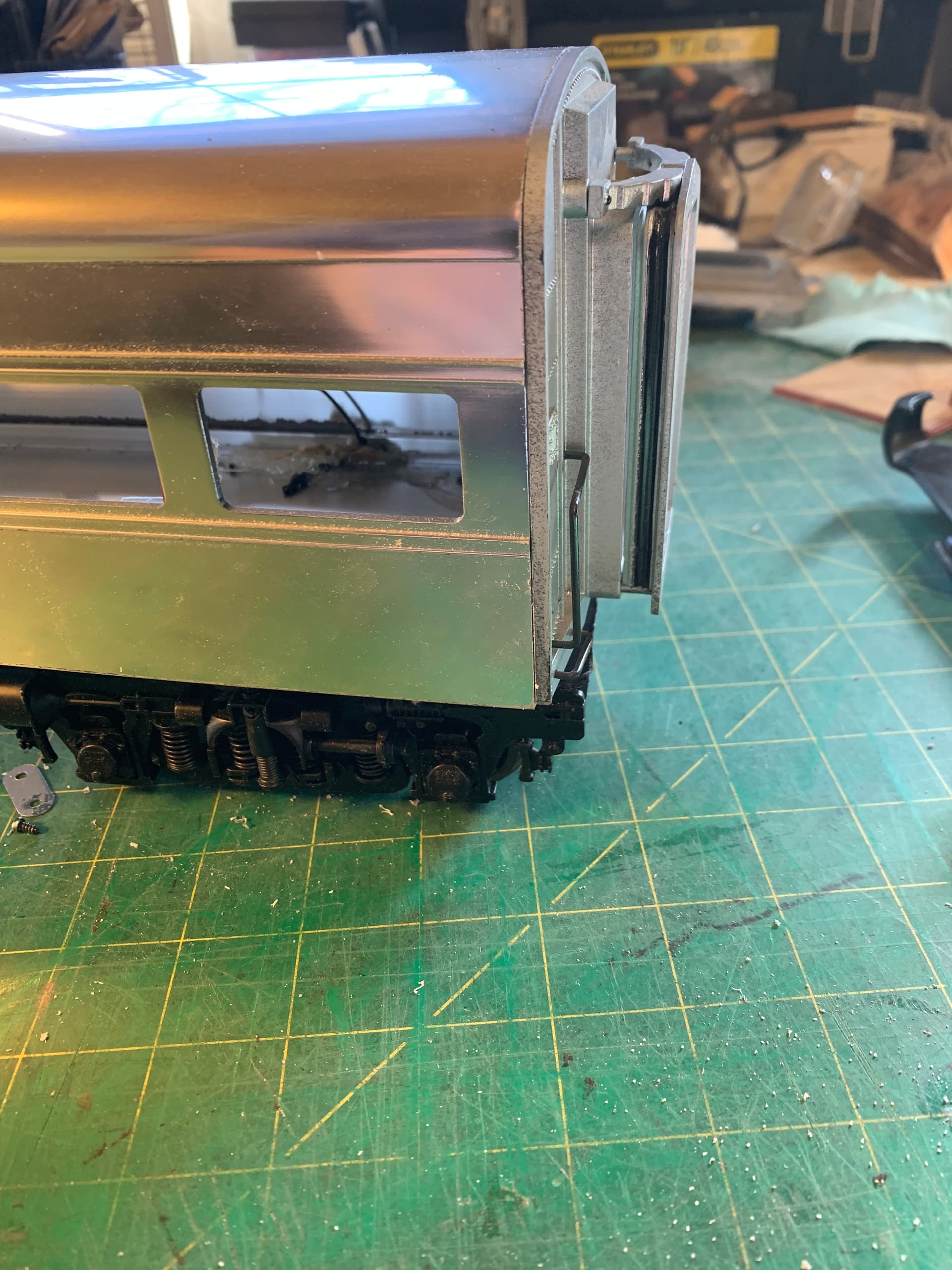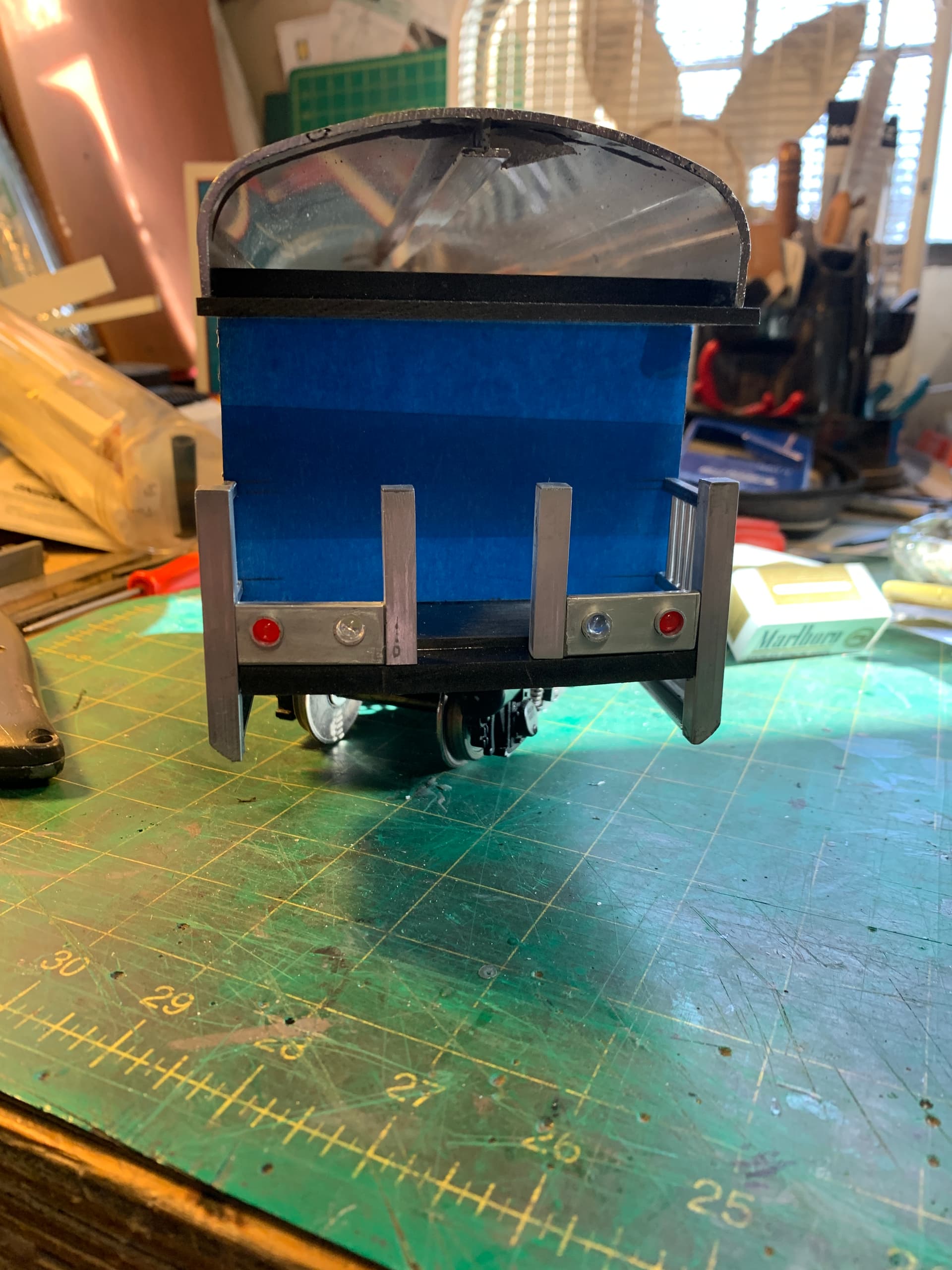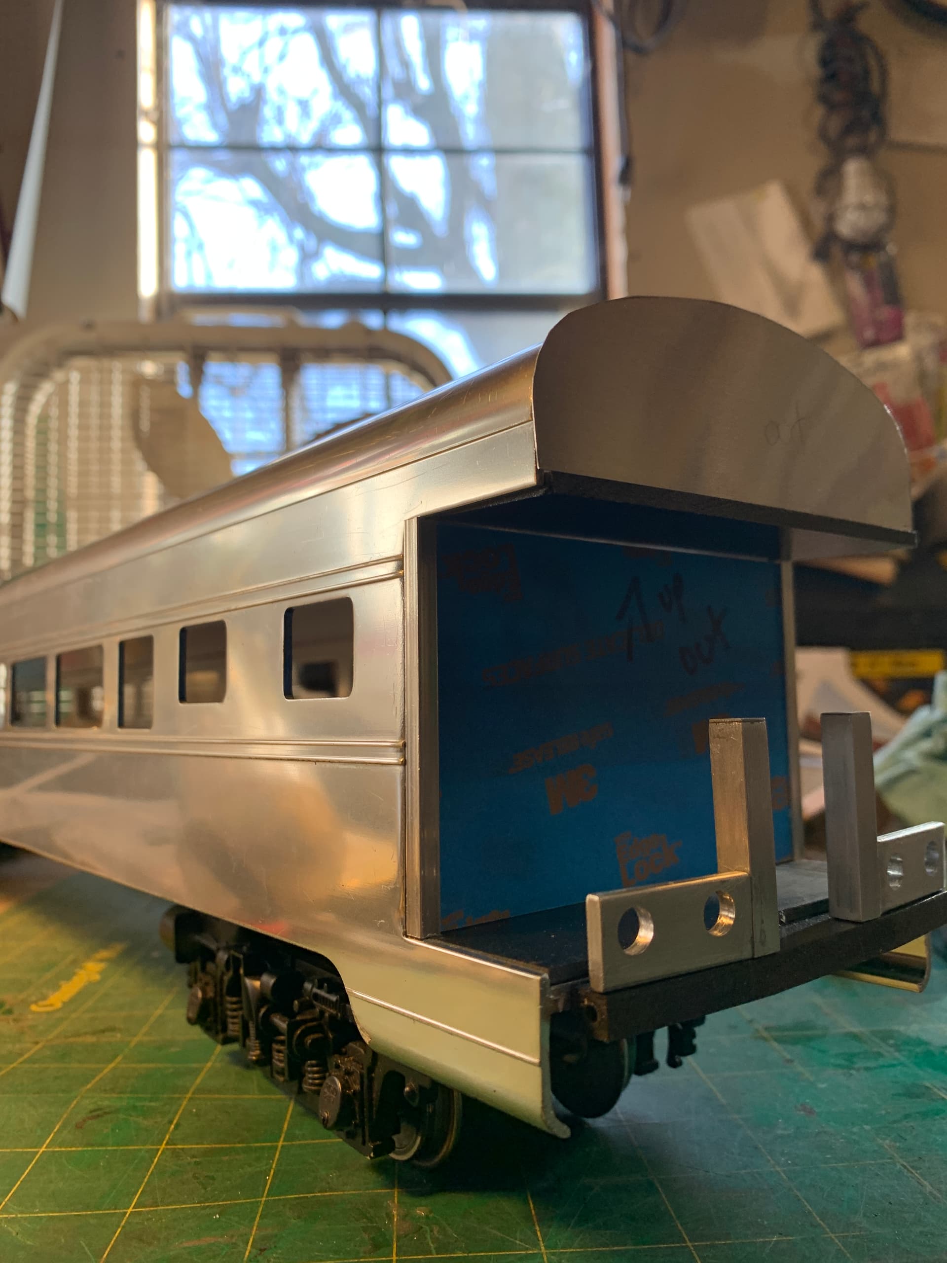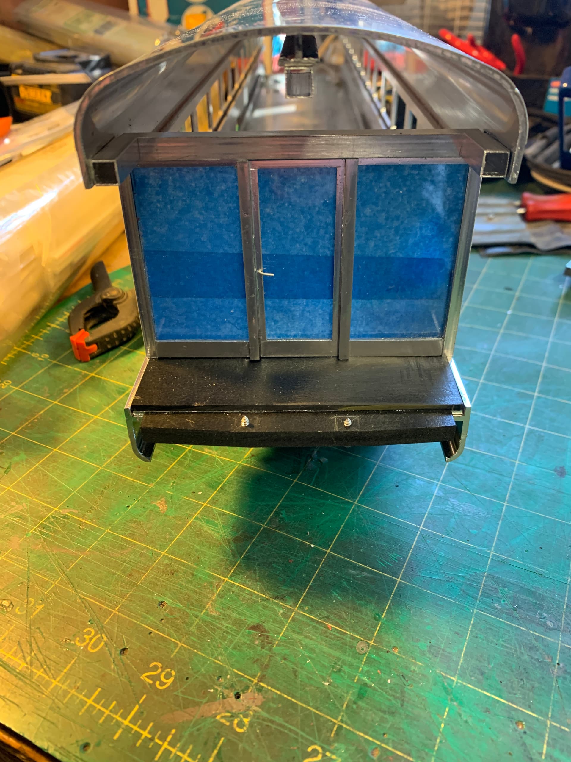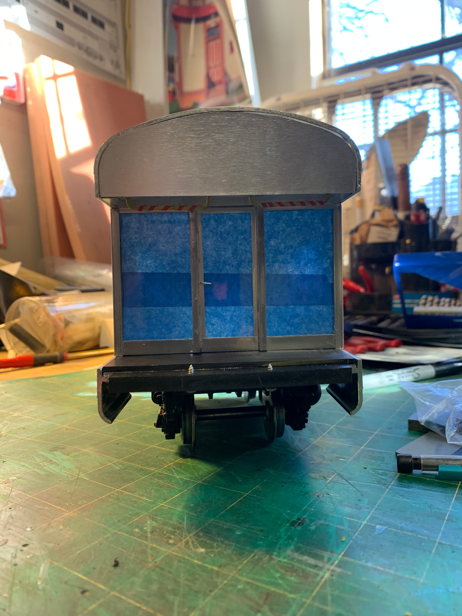 I removed the mocked up end wall, scribed (best I could) and set it back into the car as it should be. Then added the 5/32 aluminum side caps to the acrylic with my favorite glue. Included both sides for Hollywood cause he always asks about the other side of the car.