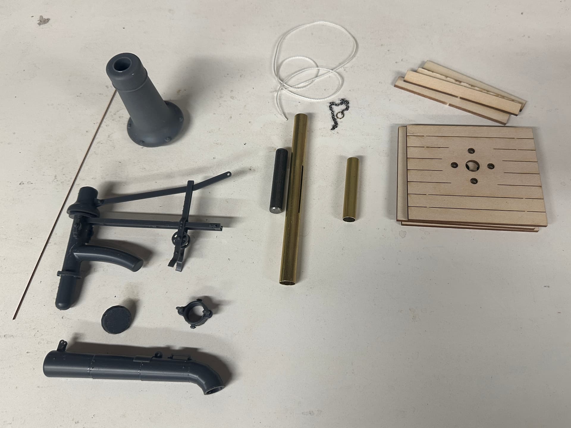 The kit consists of 5 resin printed parts, some laser cut wood, some brass tube, and a handful of other bits and bobs.