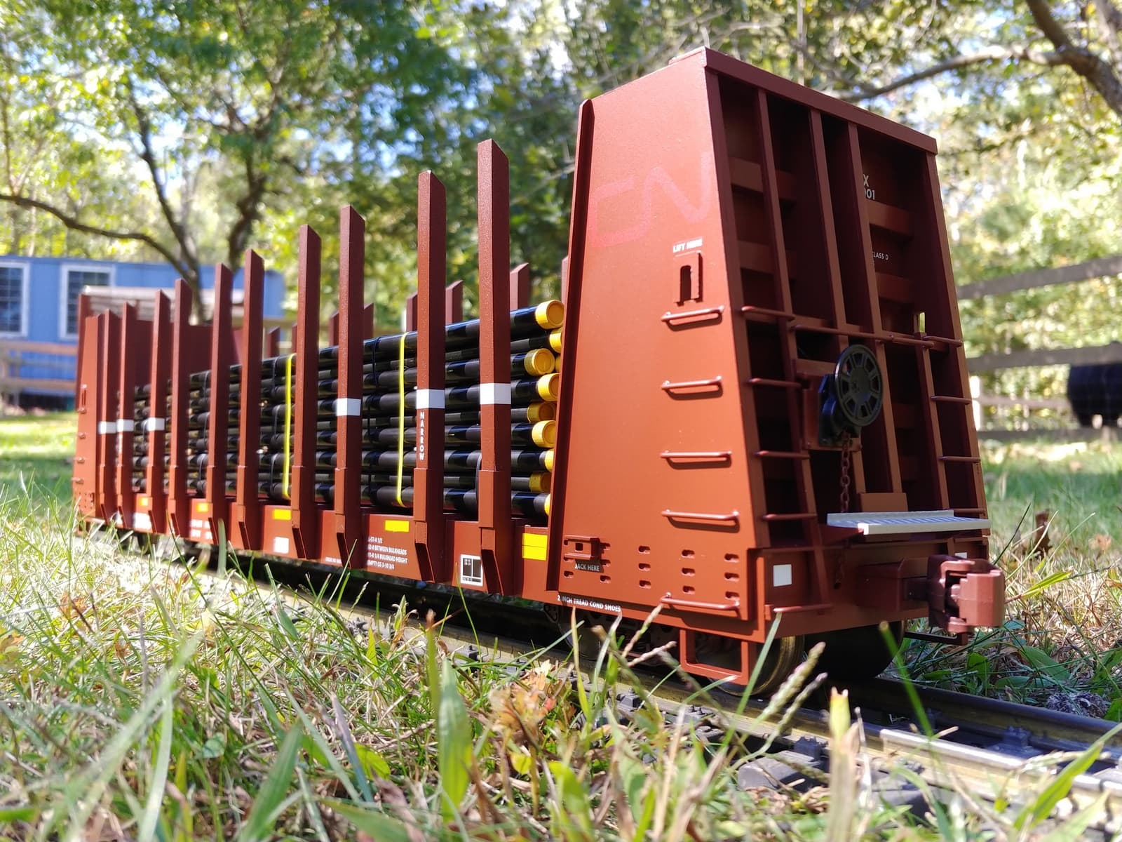 As I understand it, CN purchased 150 of these cars built by Freightcar America in 2013 (DWC 200000-200149) to move bundles of fracking pipe and subsequently replace the ageing pulpwood cars used by their subsidiary Wisconsin Central. However, even though most (if not all) of the car have been re-lettered for CWLX, I have yet to find a picture of one loaded with logs.