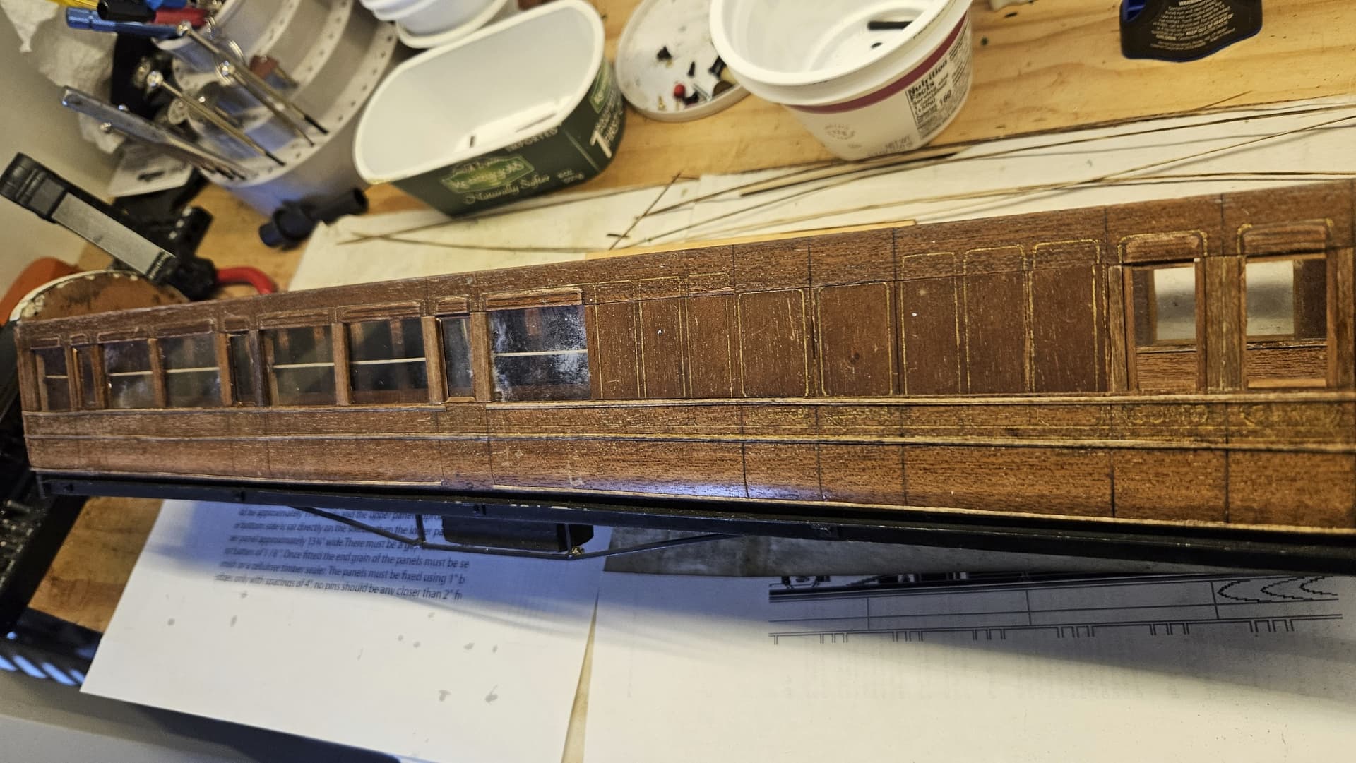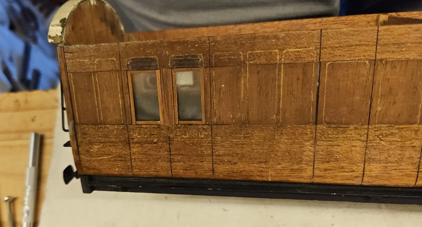 And finally the current project, a 1st/brake guards coach. Beautiful work on the ends but maybe it got dropped. The ‘glass’ in the windows is real glass, 3mm thick!