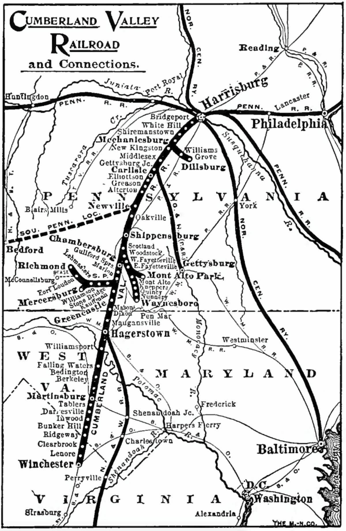 The Cumberland Valley Railroad (CVRR) began operations between Chambersburg and Harrisburg, Pennsylvania in 1837. At this time, travel between Pittsburgh and Chambersburg by stagecoach took 36 hours. To get to Harrisburg, travelers would have to arrive in Chambersburg at midnight to catch the CVRR train east at 1 a.m. Then, after arriving in Harrisburg around 5 a.m., a traveler could take the Harrisburg, Portsmouth, Mount Joy and Lancaster Railroad to travel another six hours to Philadelphia.
