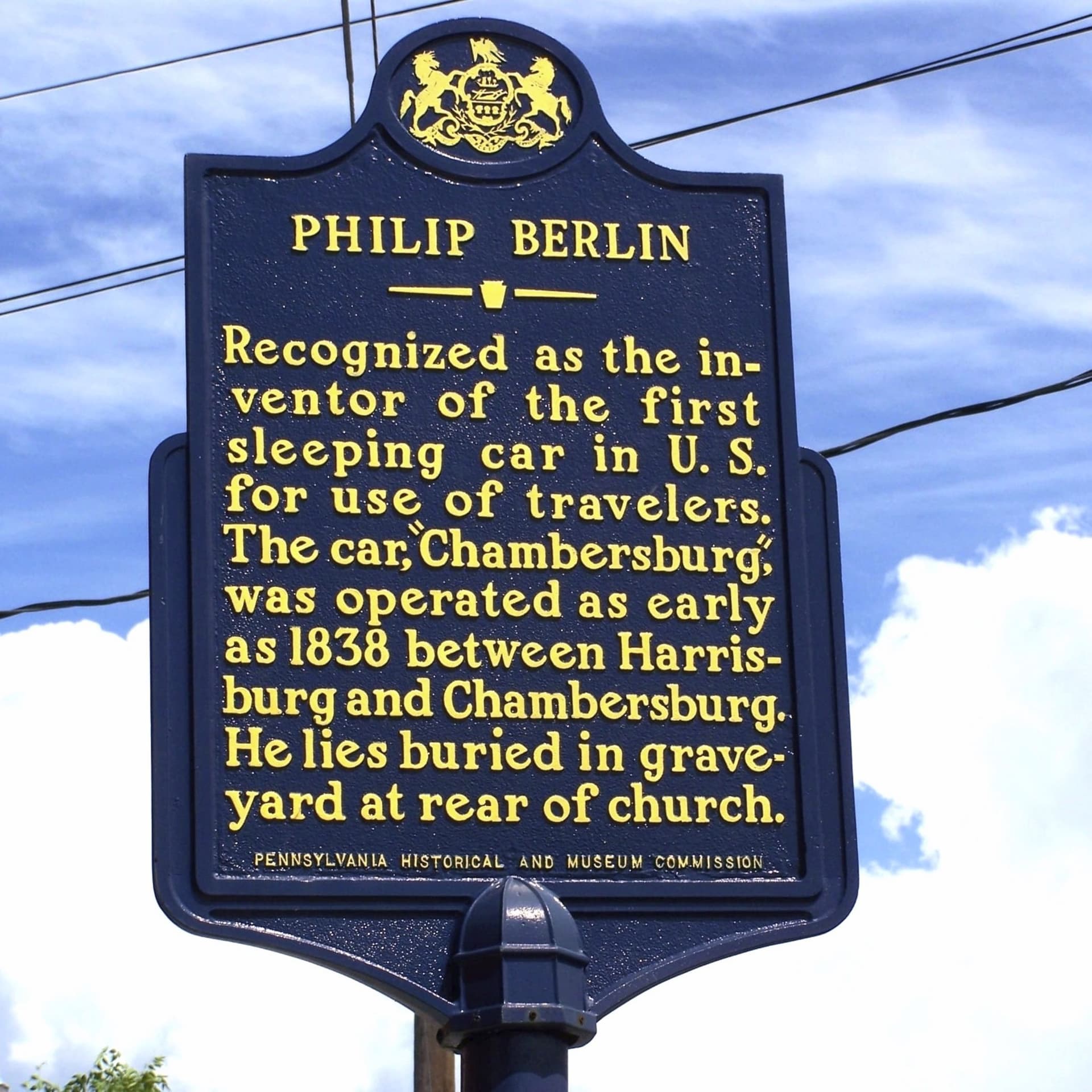 Historic marker recognizing Philip Berlin for inventing the first sleeping car in the U.S.