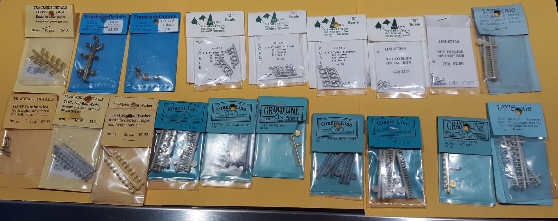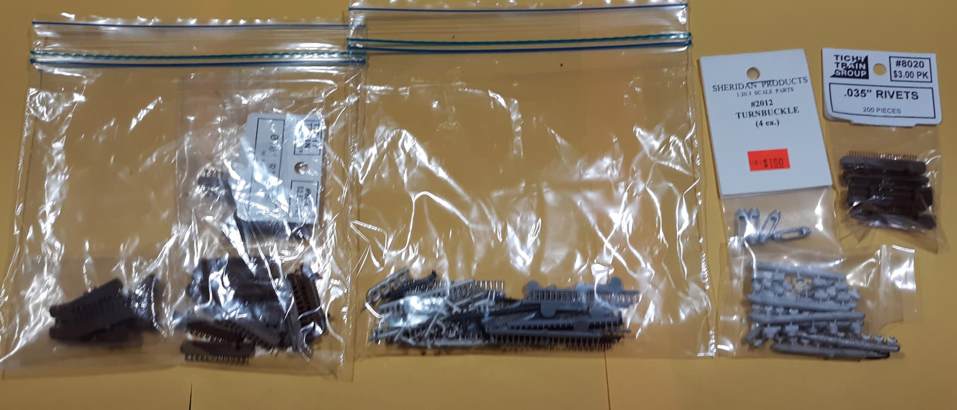The second photo has a bag of misc nbw’s and pipe fittings, a bunch of open Tichy train rivets and nbw’s and a couple of other misc. items.