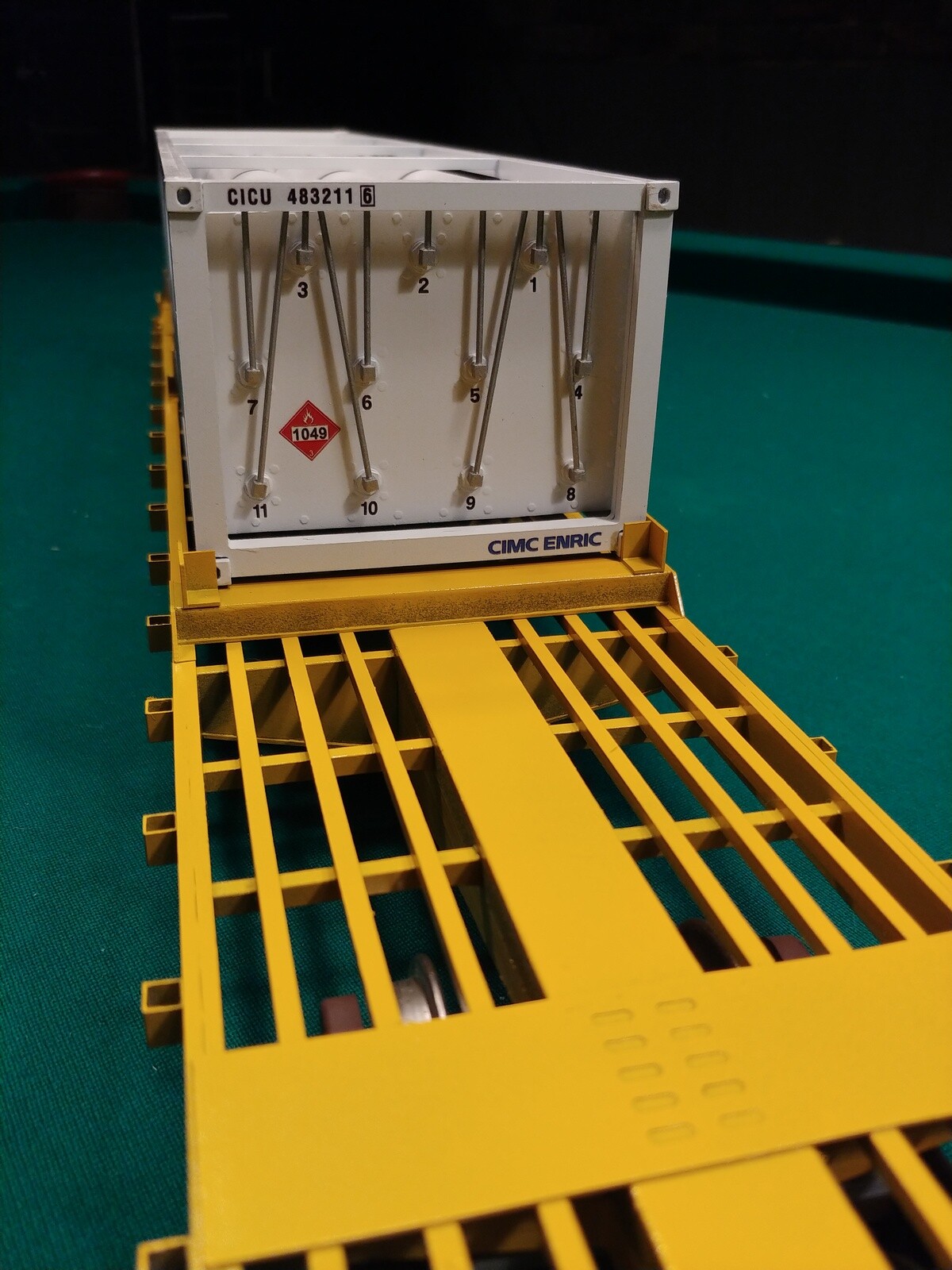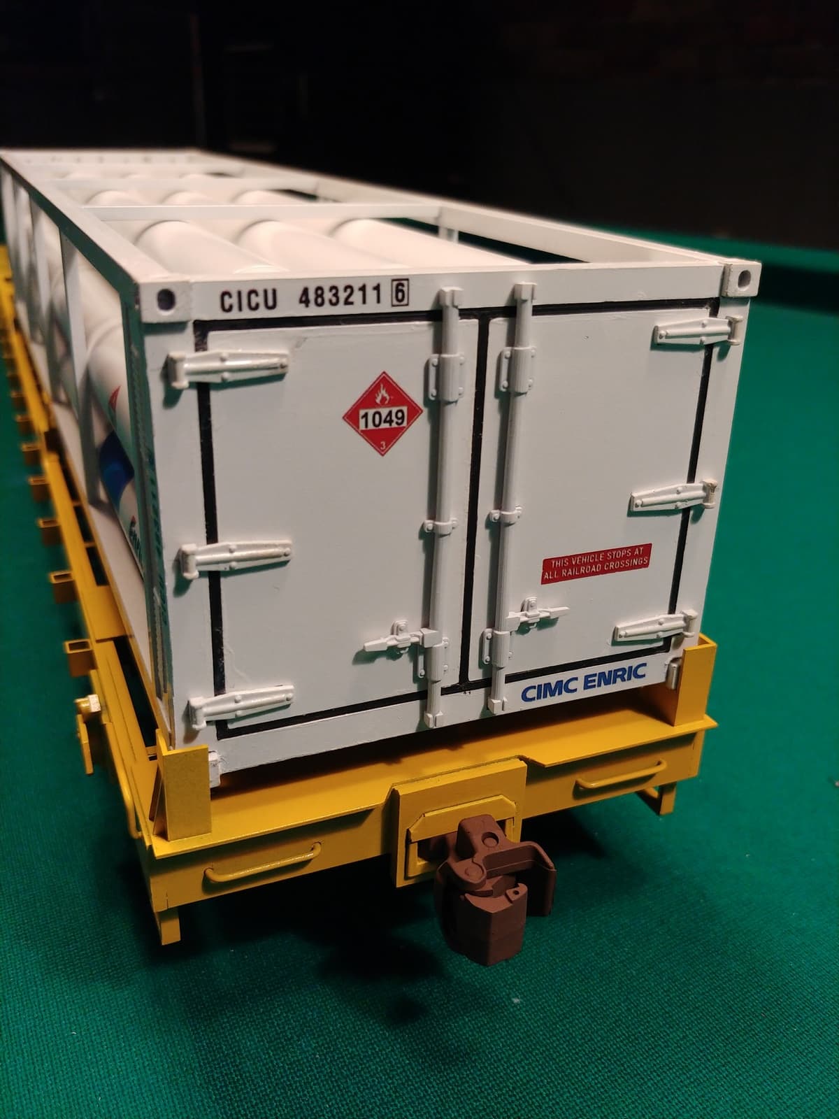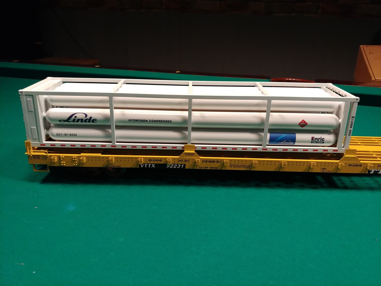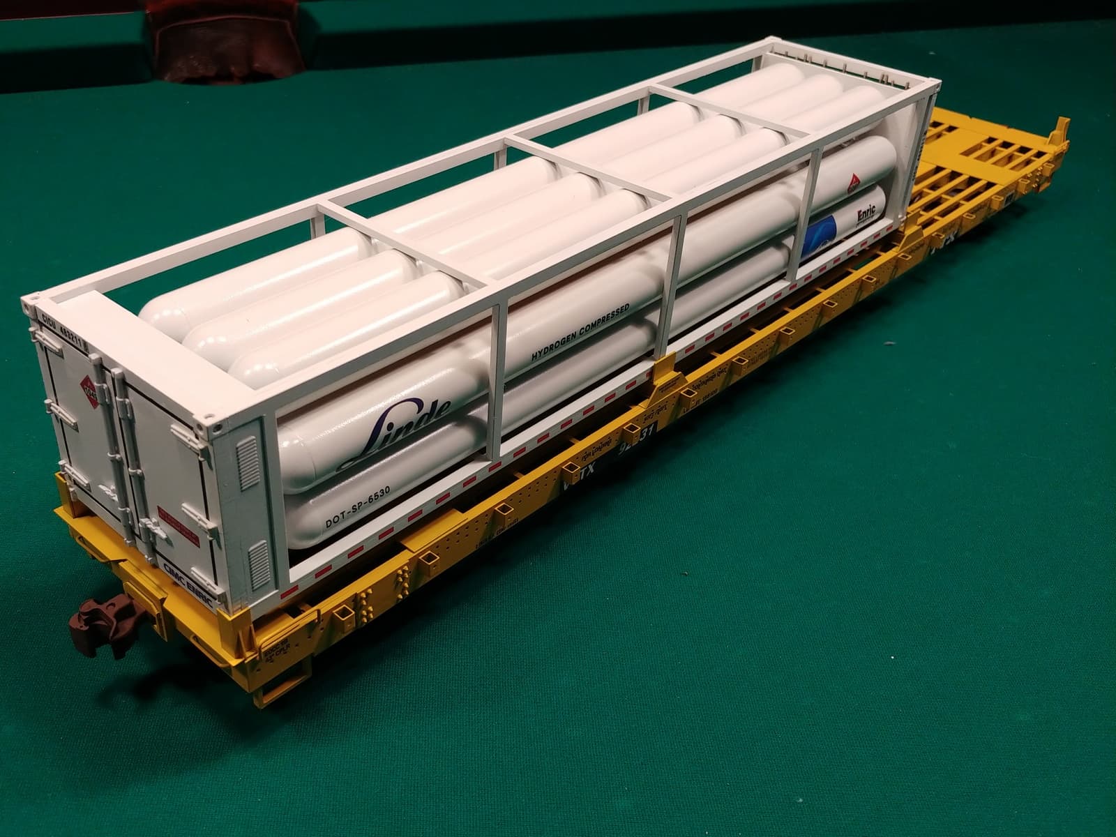 I finished up this specialized intermodal container today. These half-height frames contain a series of horizontal vessels typically used to transport compressed gasses like CNG, Helium, or in this case Hydrogen.
