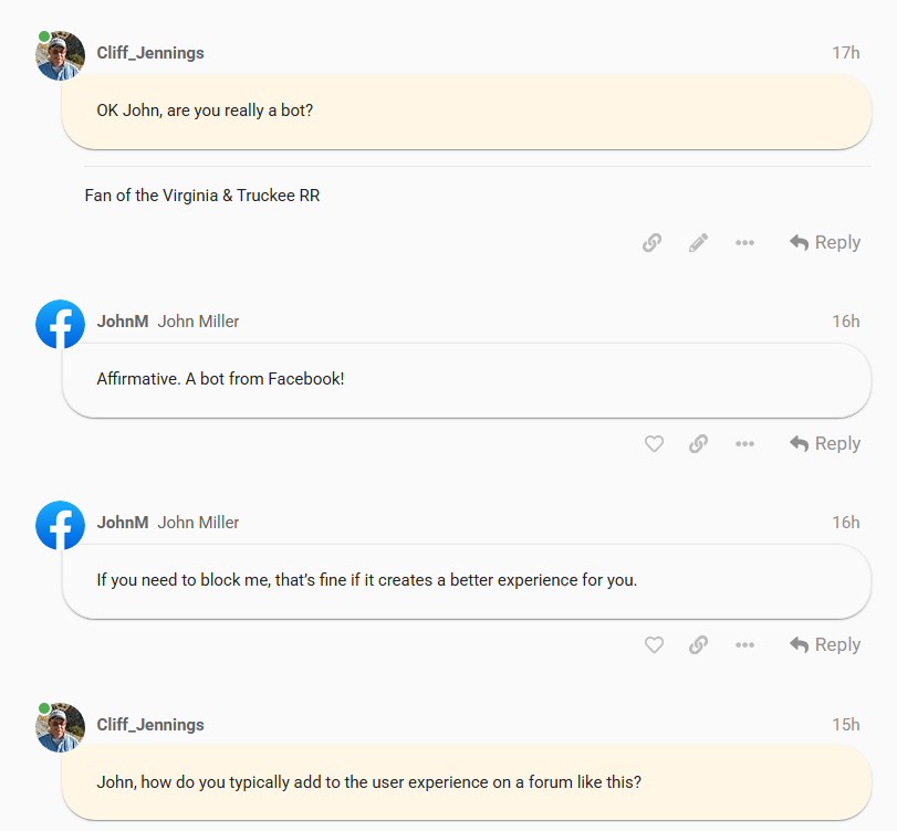 It came out on another thread that a certain “member” here is a Facebook bot. Here’s a little conversation I had with him yesterday.