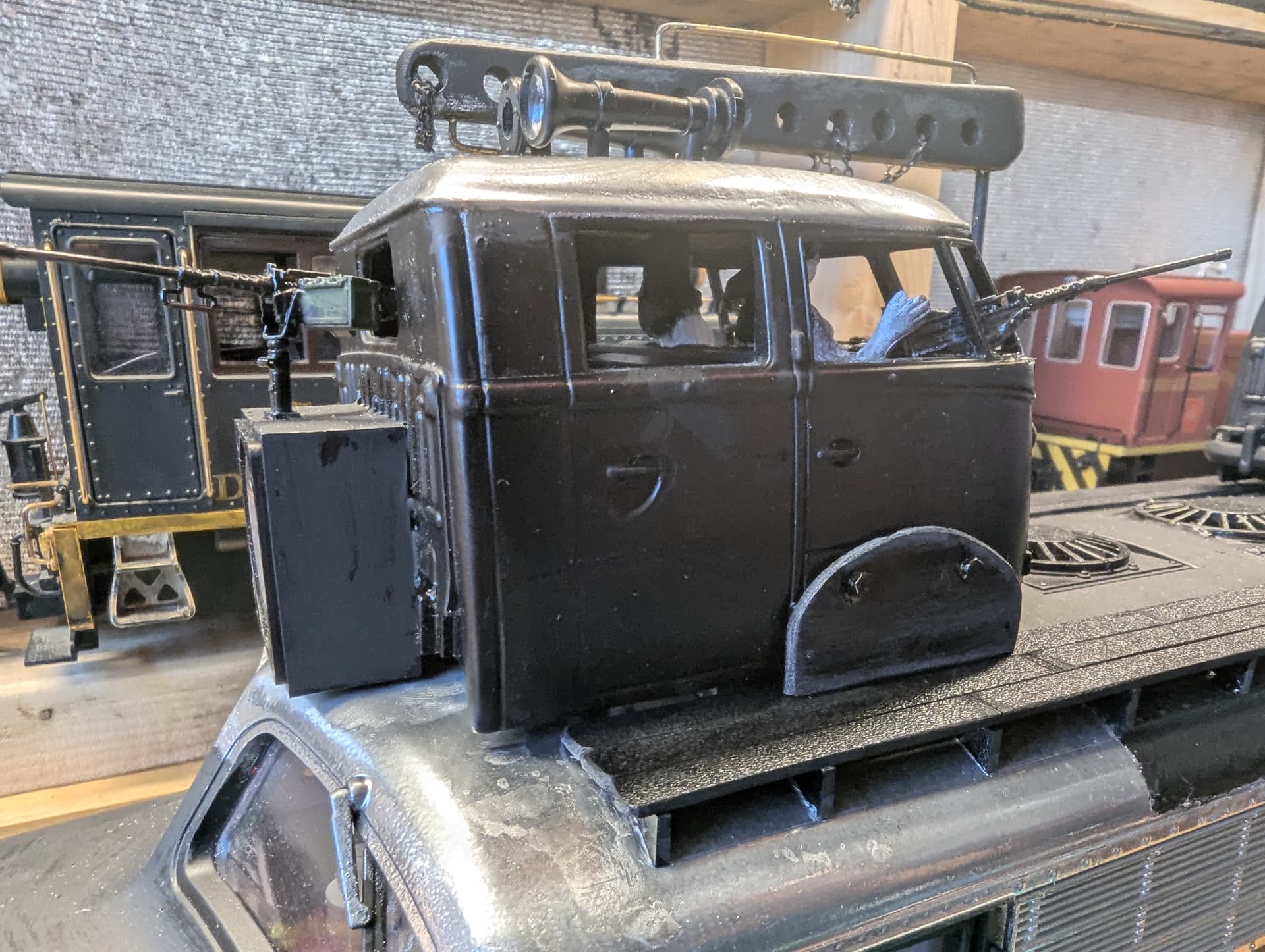 I had the heater going in the shed yesterday, so was able to get some detailing done. I added a loudspeaker from my junk box. I found a set of six machine guns for $9.92. They are labeled as 1/35 but seem to be an ok size, if a little fragile. The set is a kit, the guns had to be assembled and glued. Tiny fragile little pieces, reminds me why I like large scale!