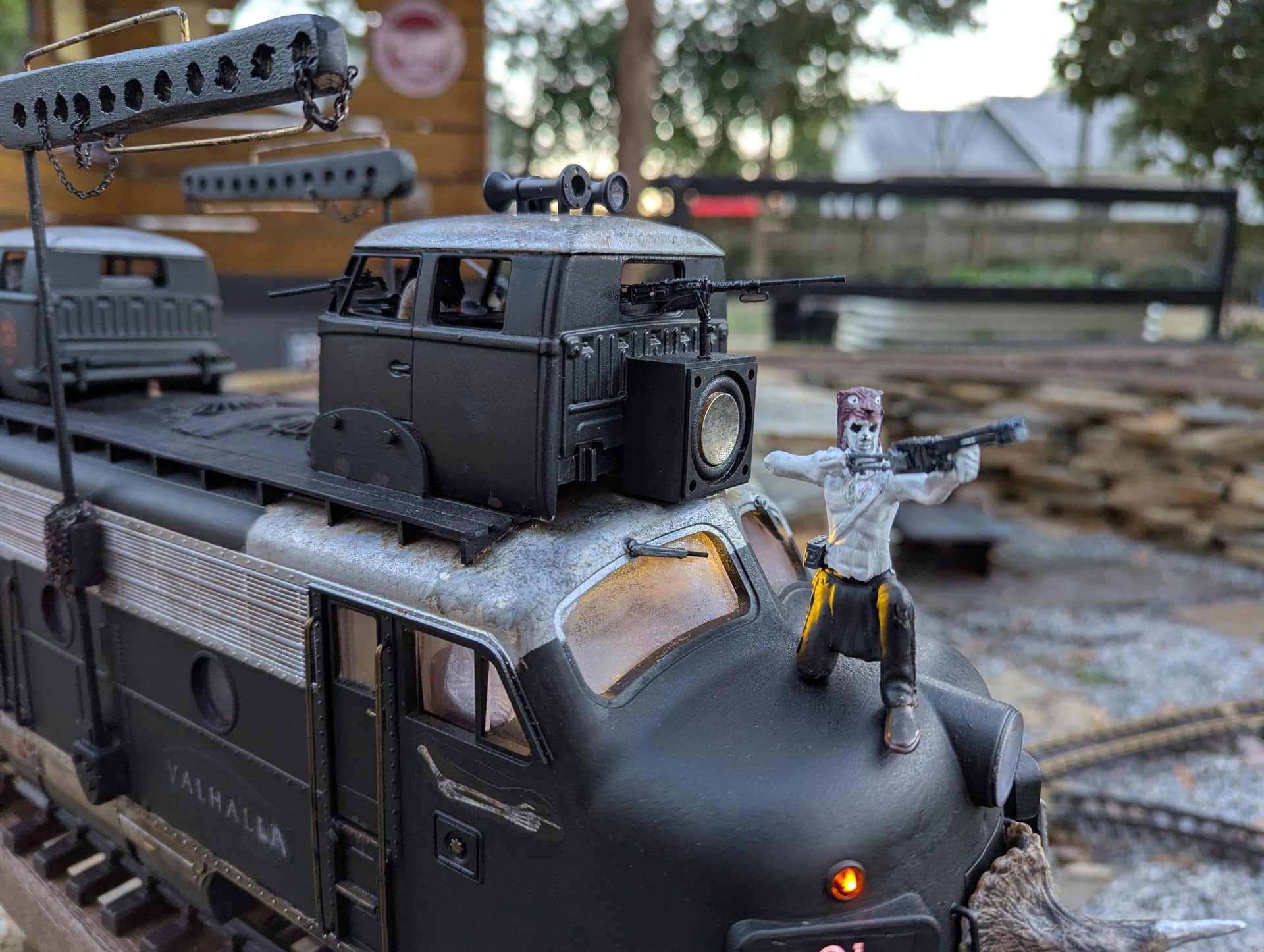 While he’s at it, might as well tack on a prison car or two, alternate weapons cars (acid tank, pump and fire hose come to mind; flame throwers…), flatcar with “EVA” vehicles…