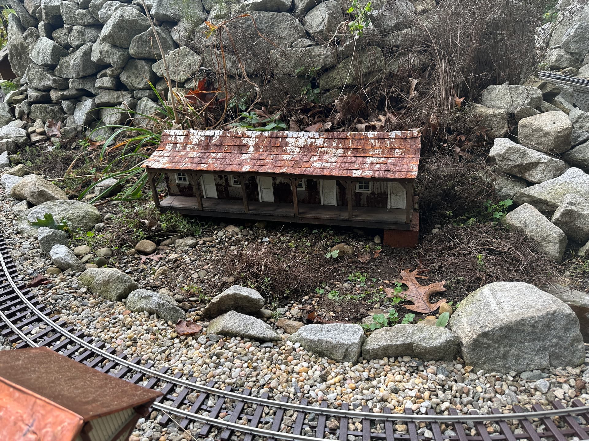 I never really had a good place for the bunkhouse, but with the new wye down at Majestic , this will work nicely. Temporary bricks as a foundation until I get the final gardening done around here.