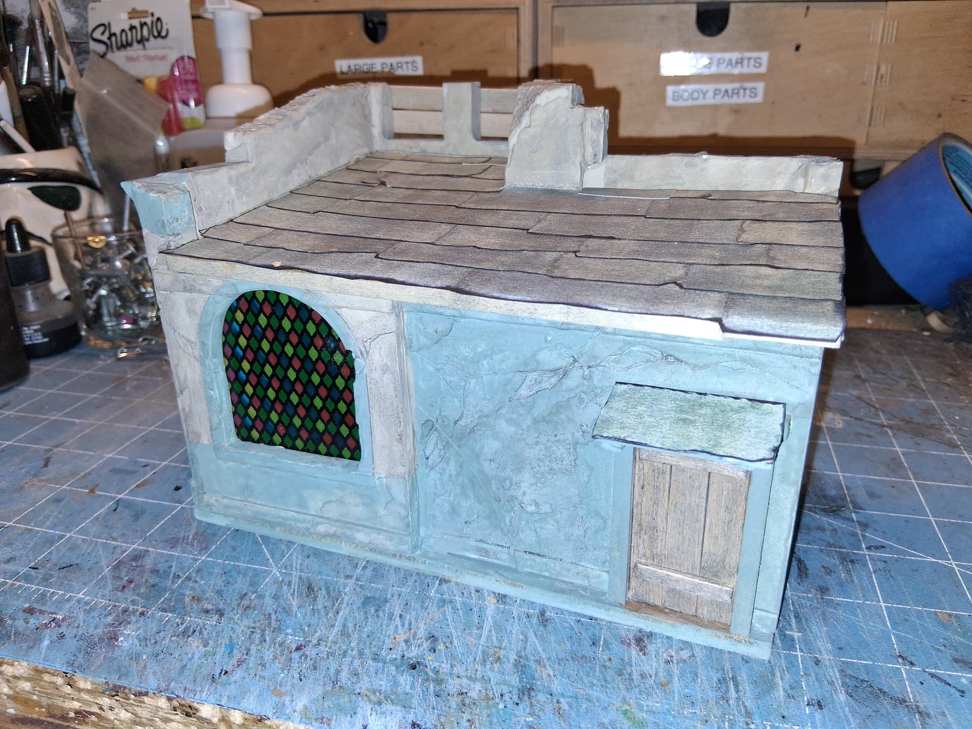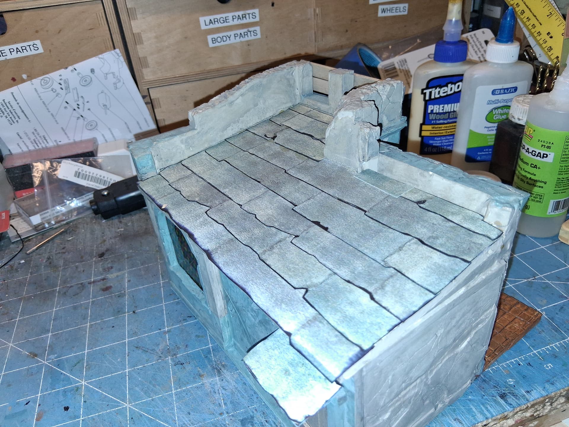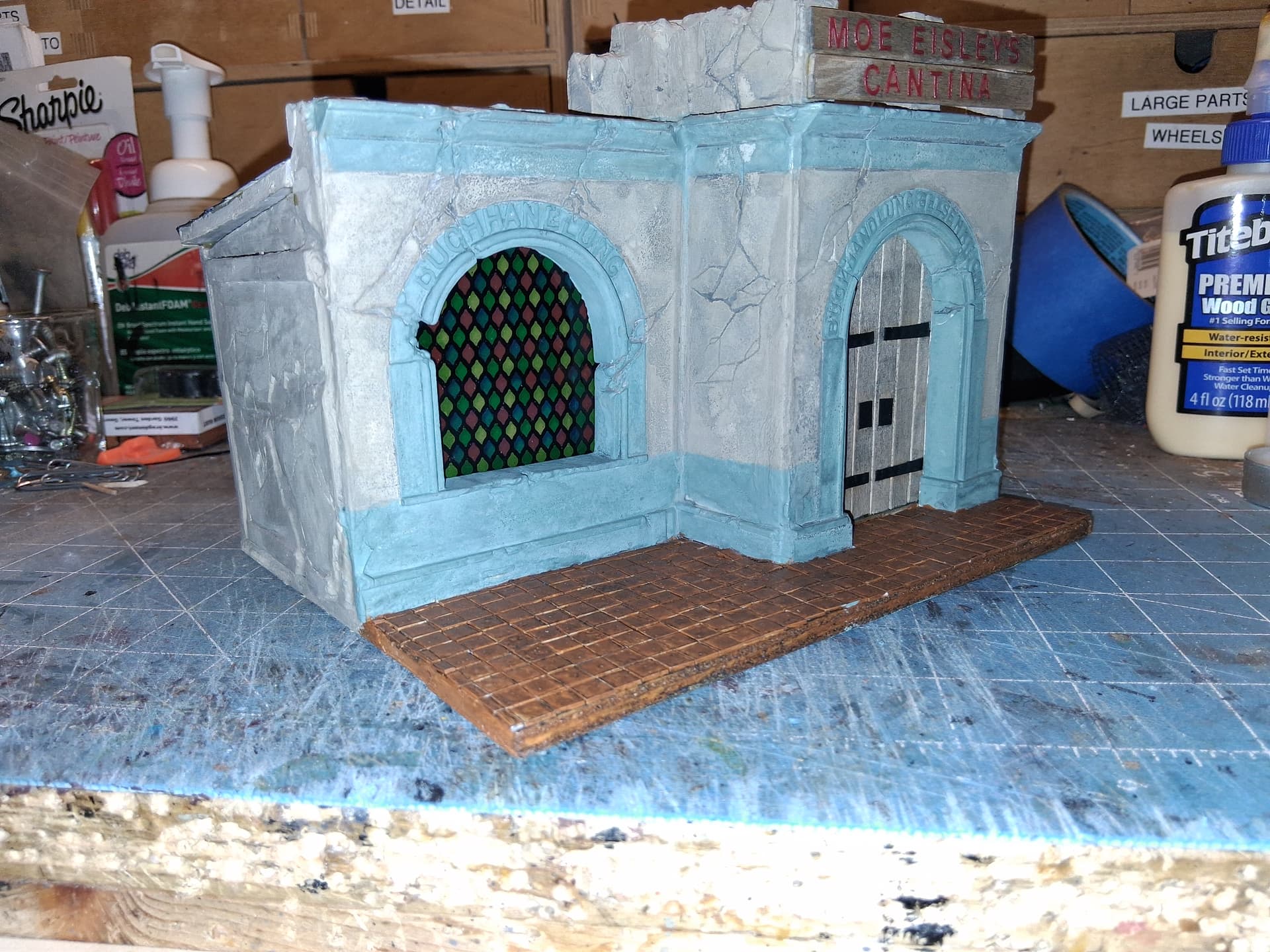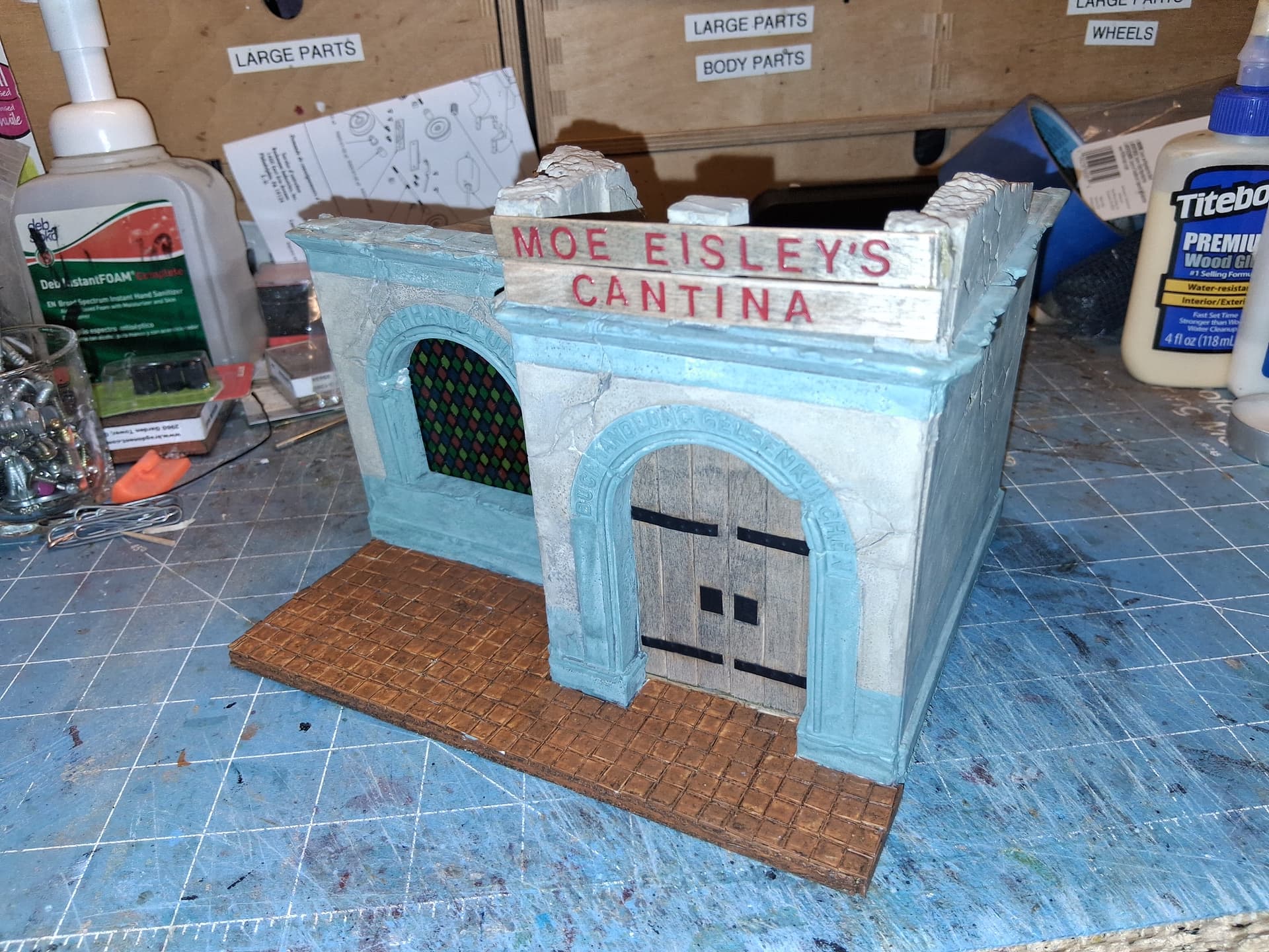 Before the start of this years Mik, I needed to finish this. Its a 1/35 diorama that instead of having a tank parked inside, i was able to build it out as a enclosed cantina. This will eventually go onto the expansion of the layout. Its hydrocal construction and makes for an interesting run down business in what will be a run down little town.