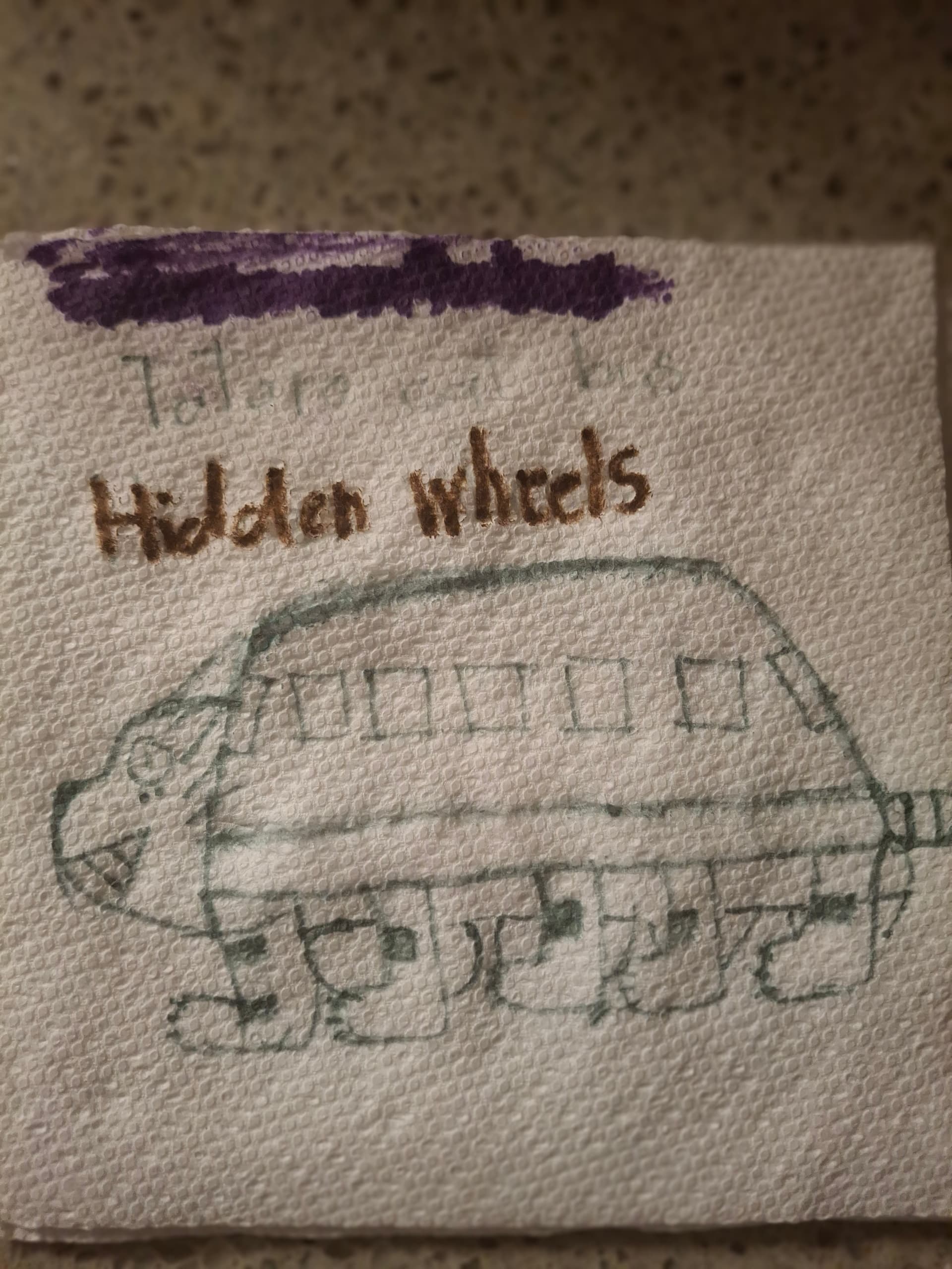 He runs on roads, treetops, and powerlines, leaving only a wind to mark his passing. Kid-zilla provided our obligatory napkin drawing.