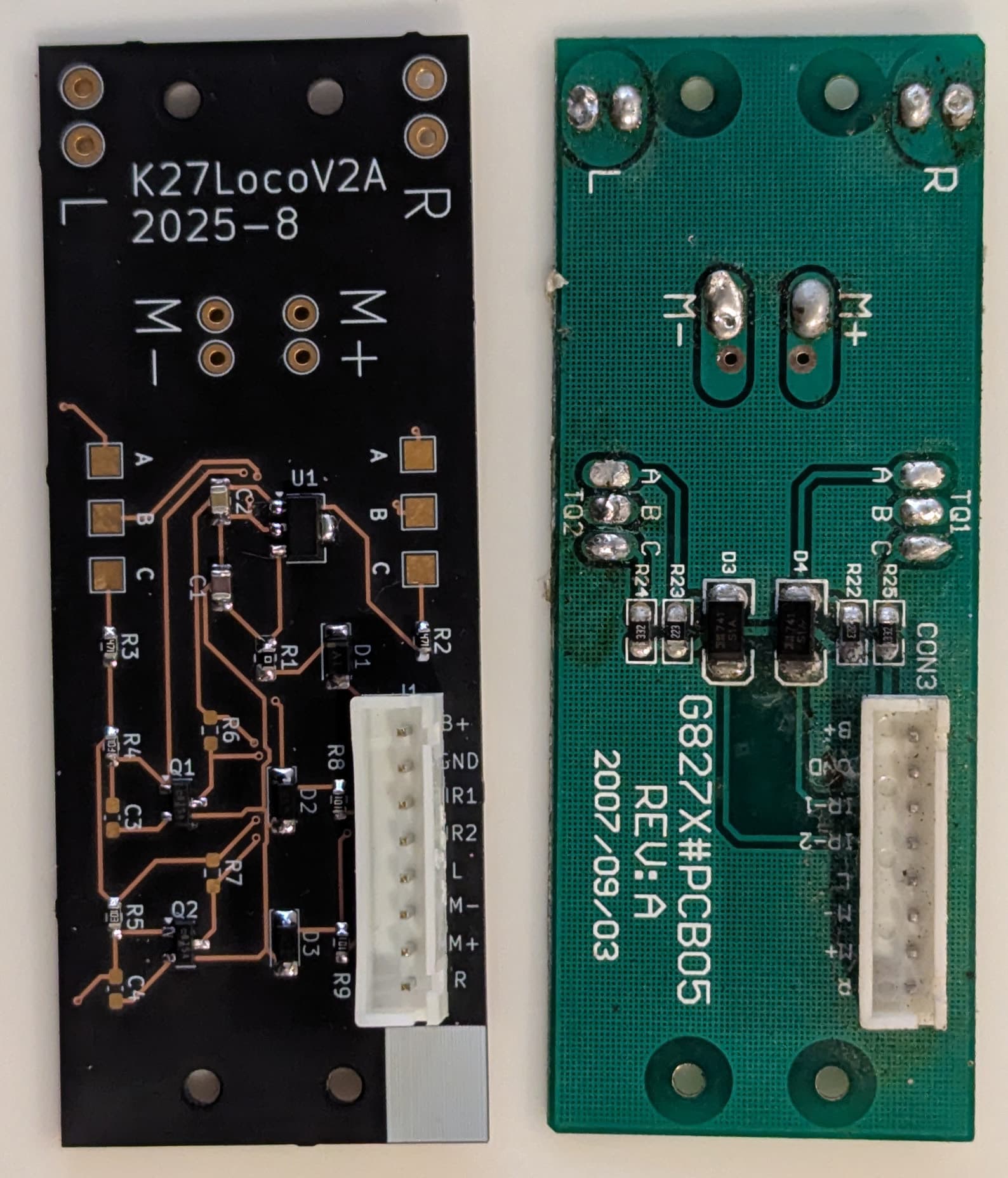 In the above photo, the board on right is the origional Bachmann PCB-5 circuit board. The board on the left is the newly designed K-27 PCB-5 circuit board.