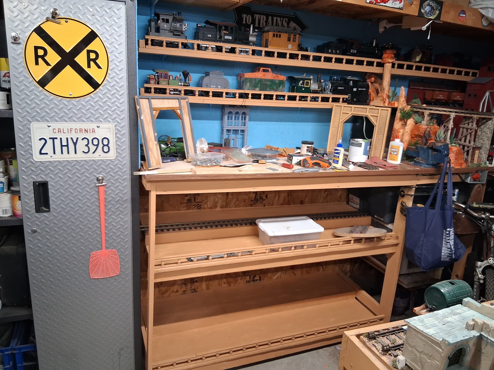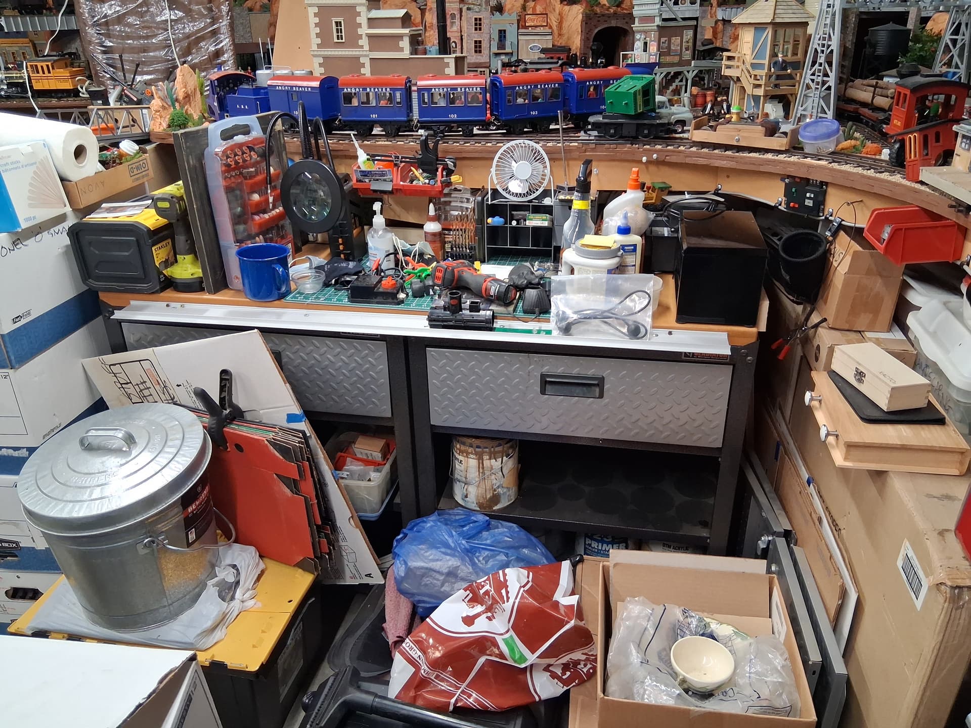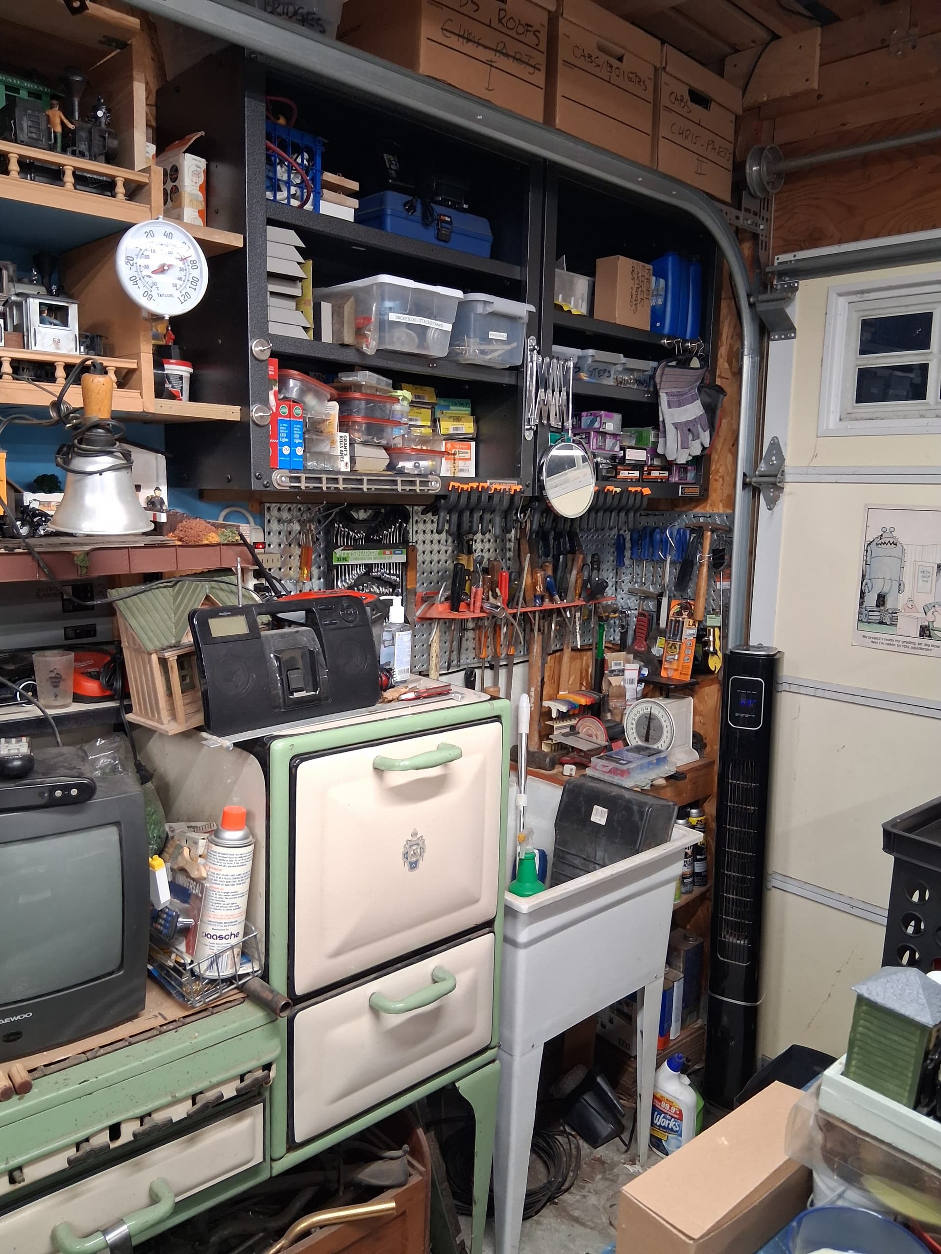 Spent this week carting old cans of paint to Ace for disposal. Probably 20 cans, large to small. Only a couple are the types they won’t take so that’s a trip to the hazardous disposal site this weekend. Organizing is painfully slow but it is progressing. Hopefully this weekend I can clear the area next to the workbench to begin the expansion on that side, which eventually will nest the pizza layout. I will try to post a drawing this weekend.