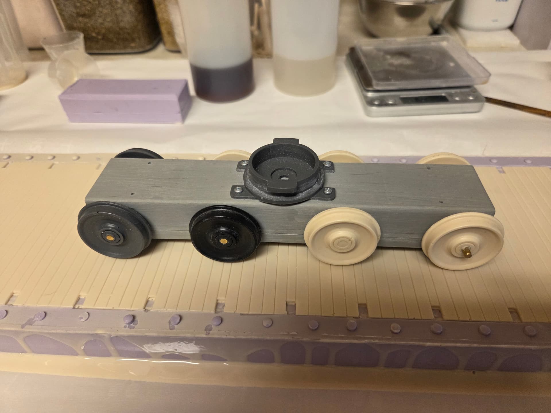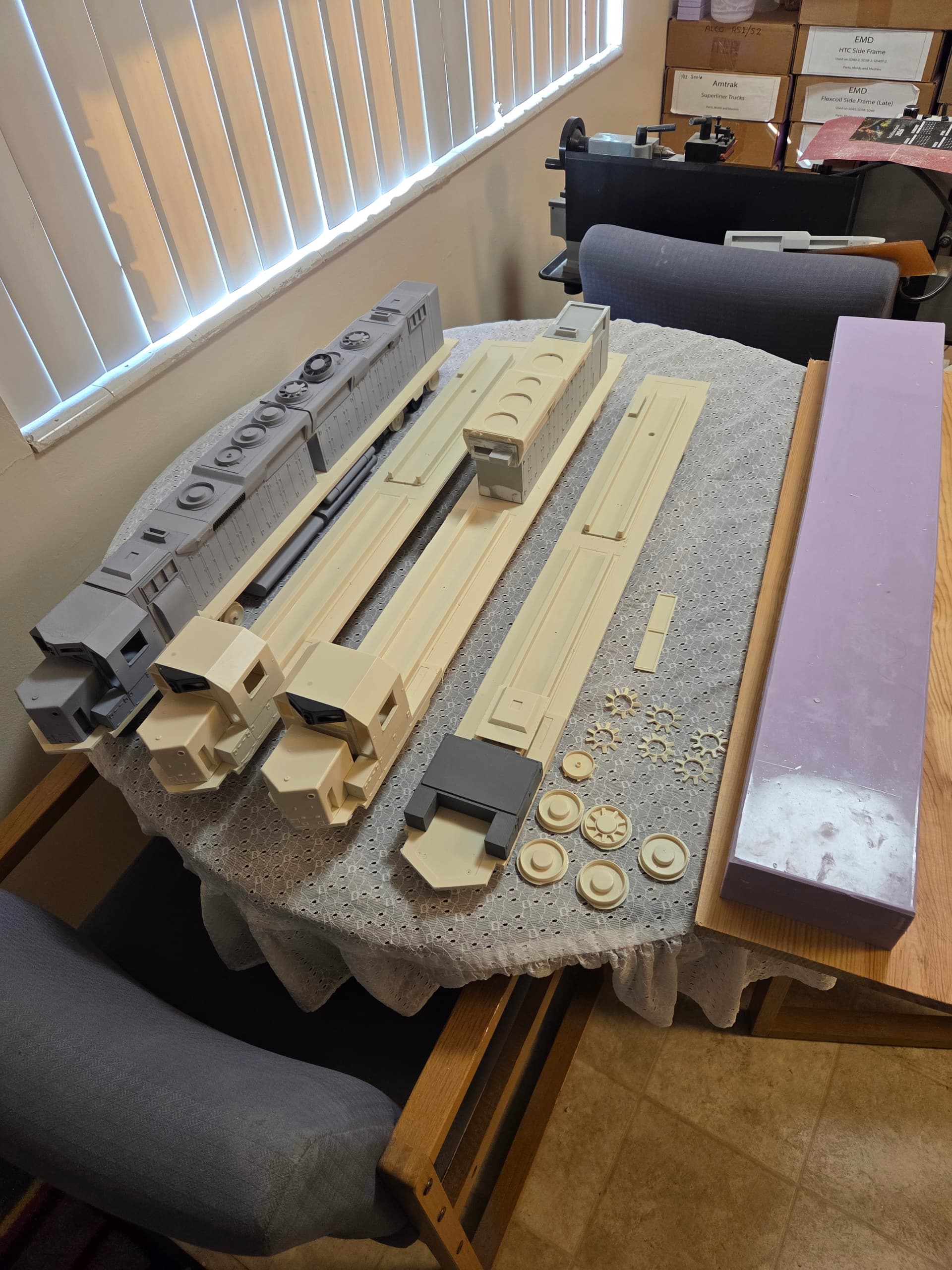 My name is James and I have been custom making models professionally for over thirty years. I joined recently because Ken Mathews posted about one of my GP40-2 locomotives that he picked up on ebay and needed help referbishing it. We took care of that and now I’ve decided to share my newest locomotive build and let folks know it will be available later this year. So here is the debut on LSC of my 1/32 scale DD35A. The large lavender block of rubber on the right is the huge mold for the frame/deck Original masters for all part were hand formed from sheet and tube styrene from which silicone rubber molds are made. Detail parts such as handrail stanchions, handrails, grabirons and grills will be brass. I do not 3D print