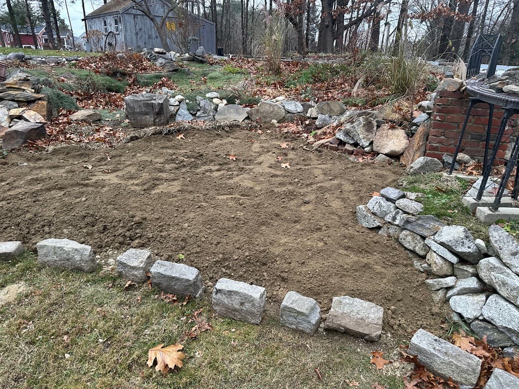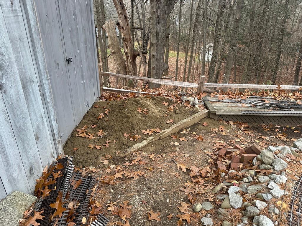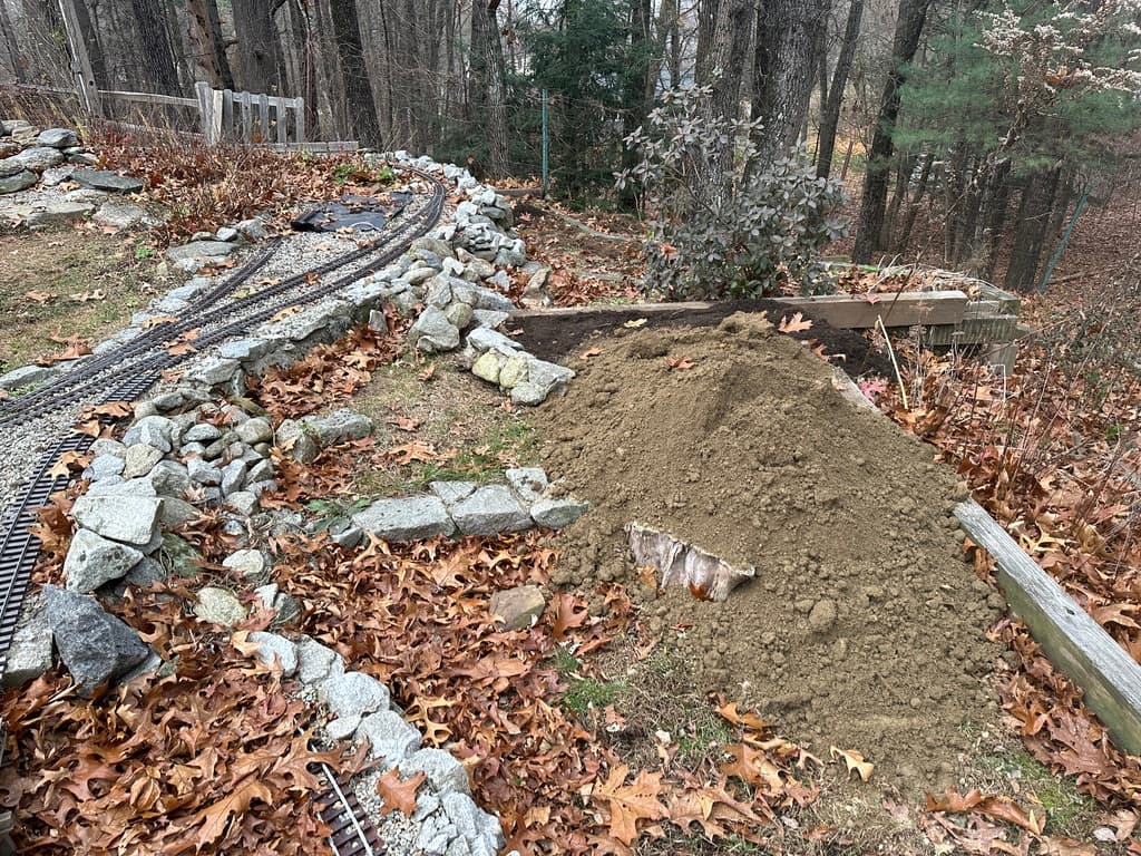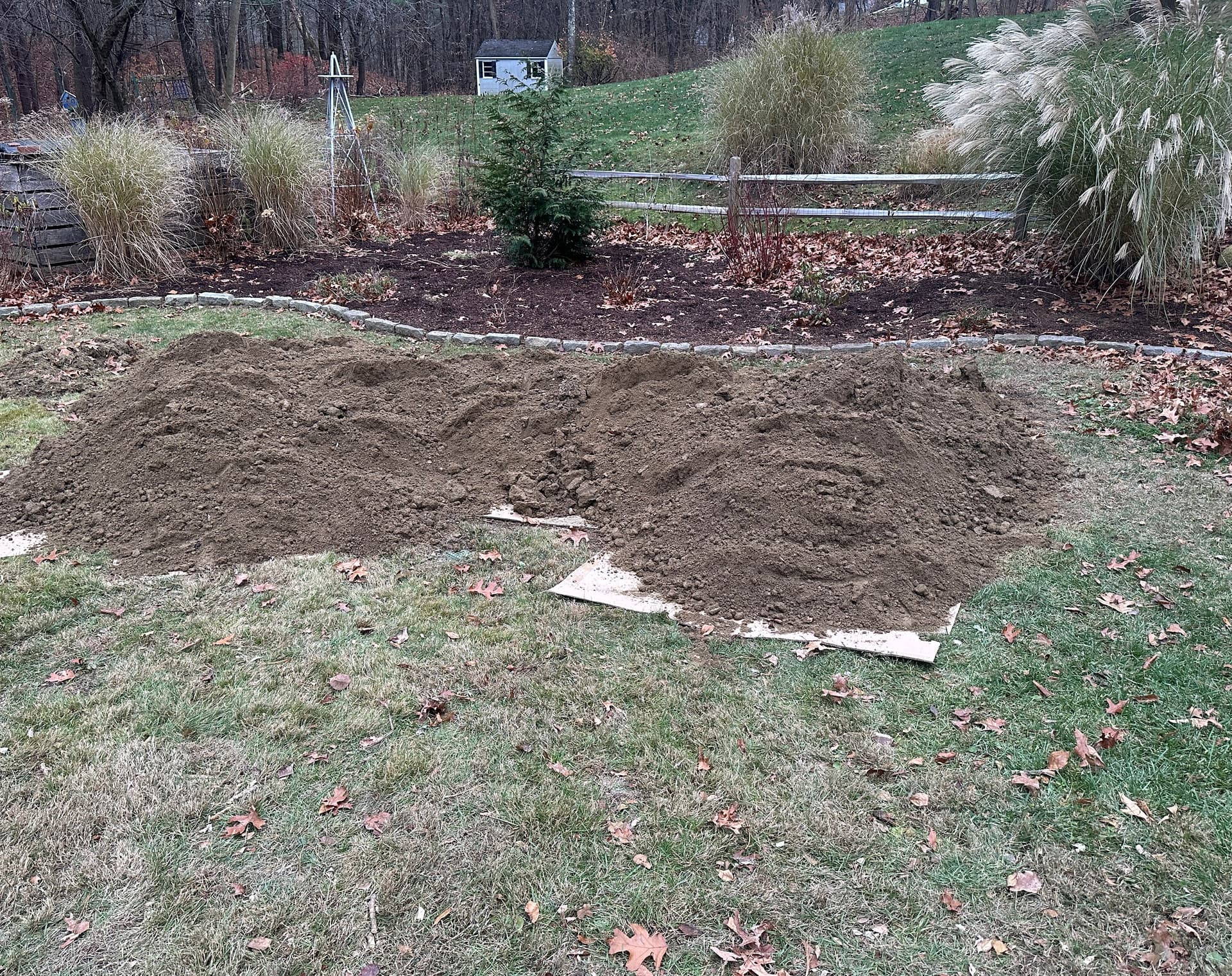 There is considerable leftover, so we dumped it here. Will re-grade this area of the yard, and turn it into more garden, instead of grass. And any extra will go back into the RR area in the spring once we see where certain plants come up.