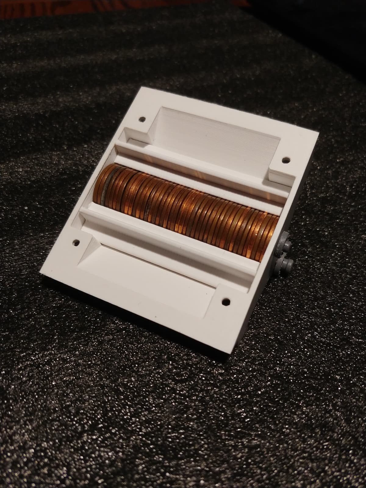For added weight, I made inserts for the hopper outlets to hold a stack of pennies.