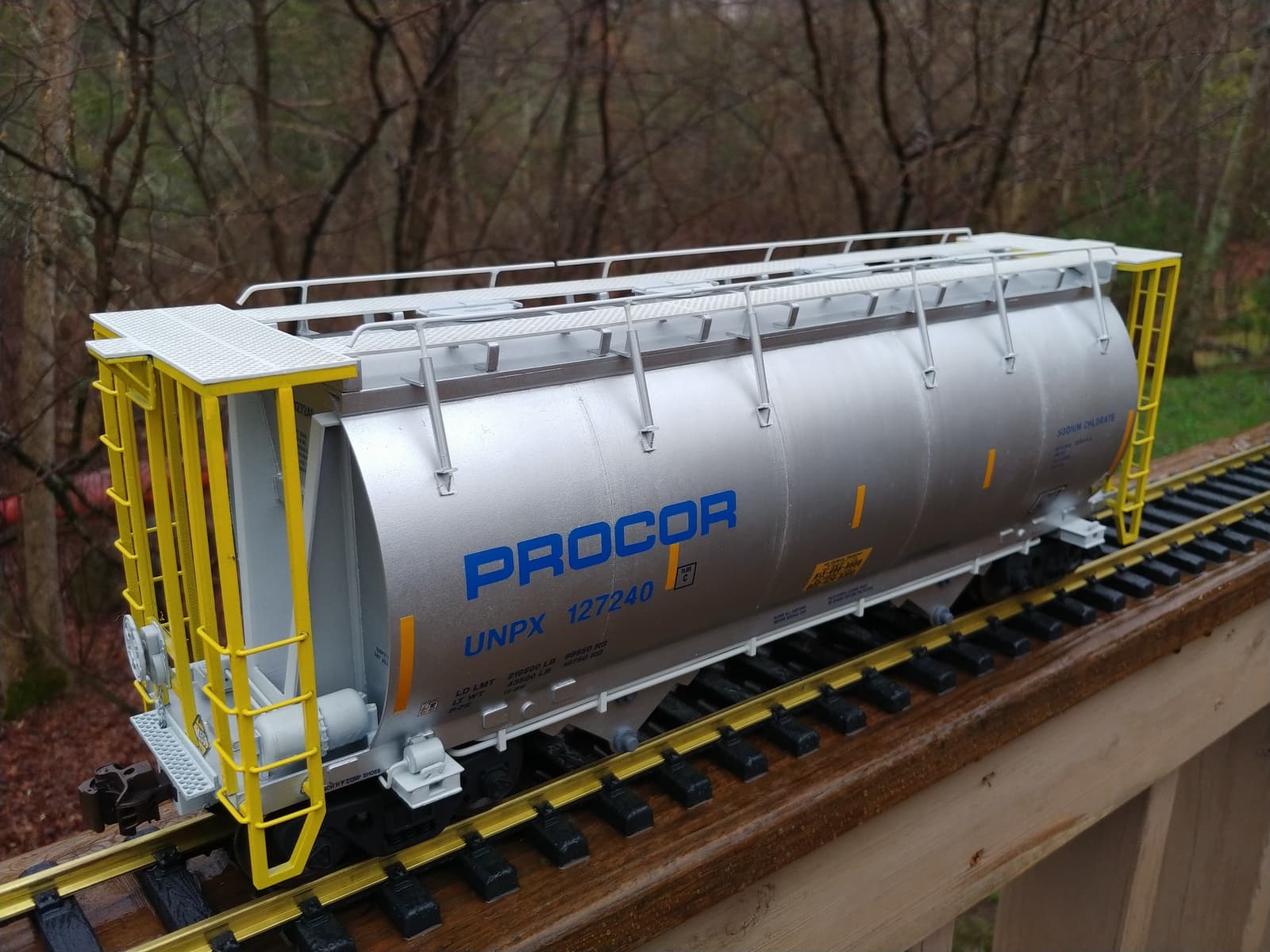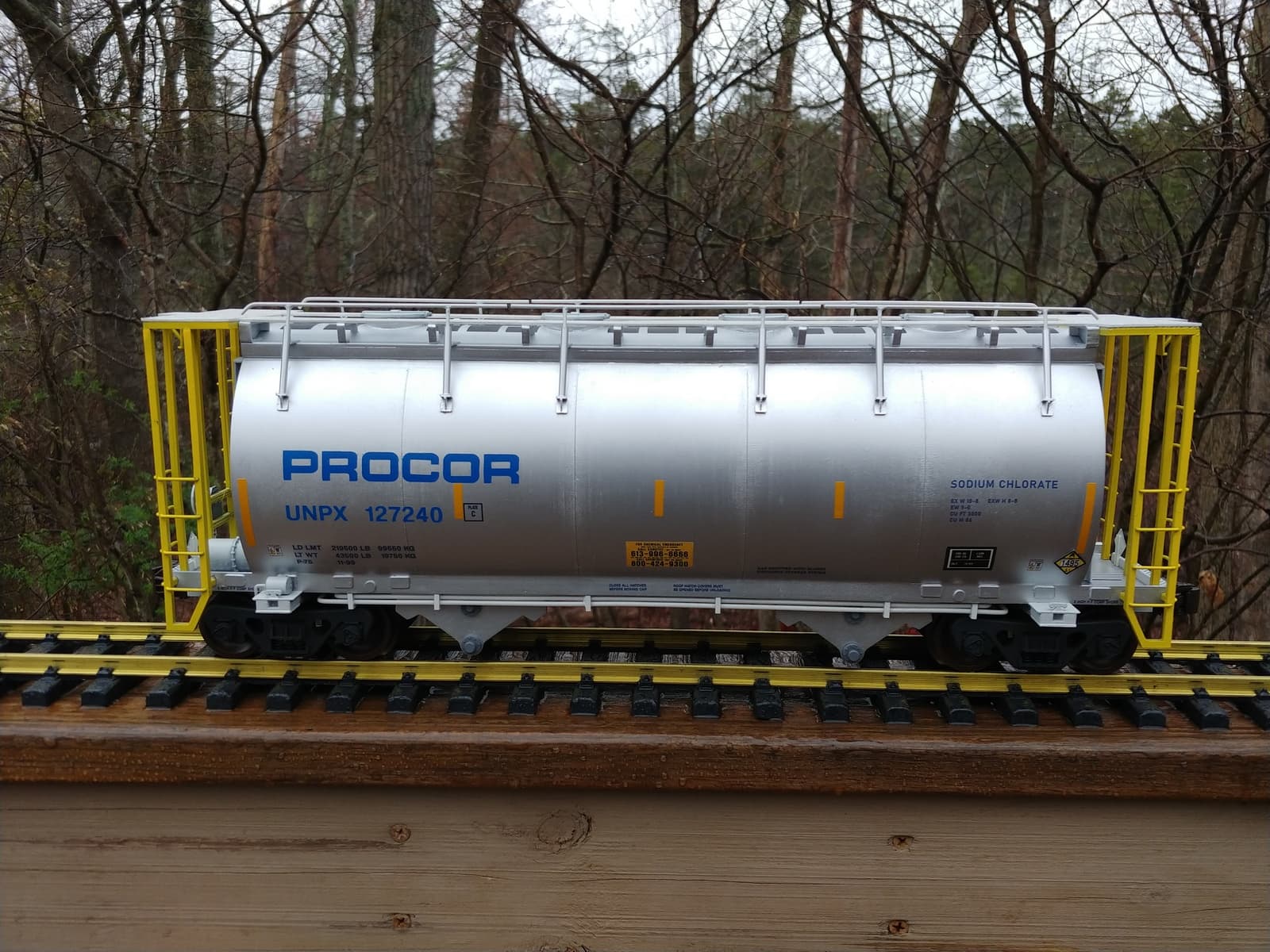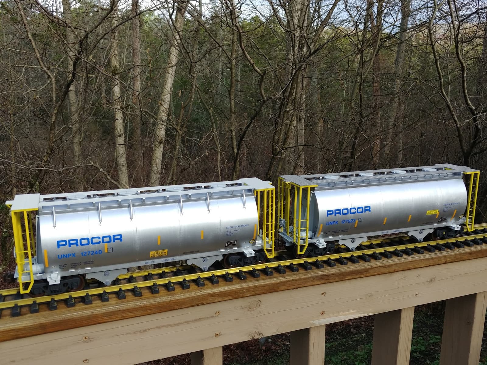 Procor built more than 1,300 aluminum covered hoppers for hauling sodium chlorate dry crystals. Over 95% are used in paper manufacturing (bleaching agent). The remainder are mostly sent to beverage facilities for sanitizing equipment. Both industries I plan to add to my RR.