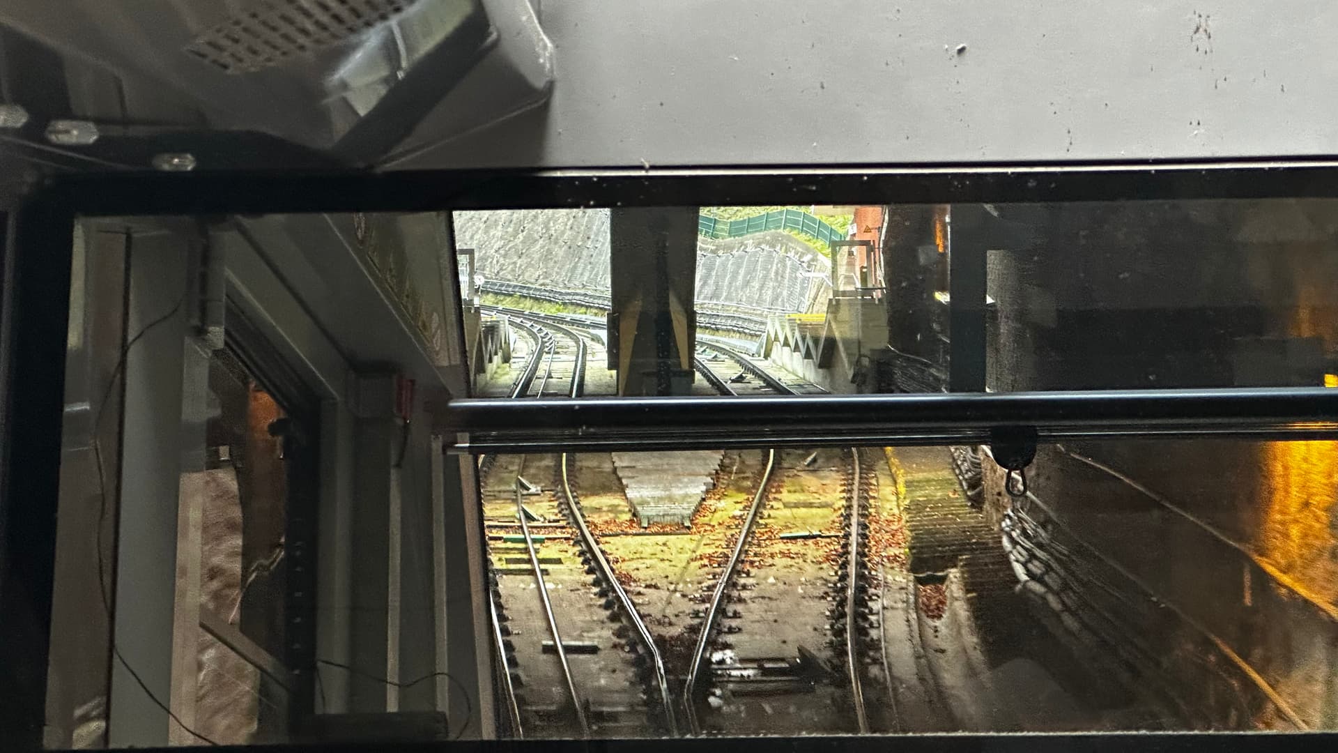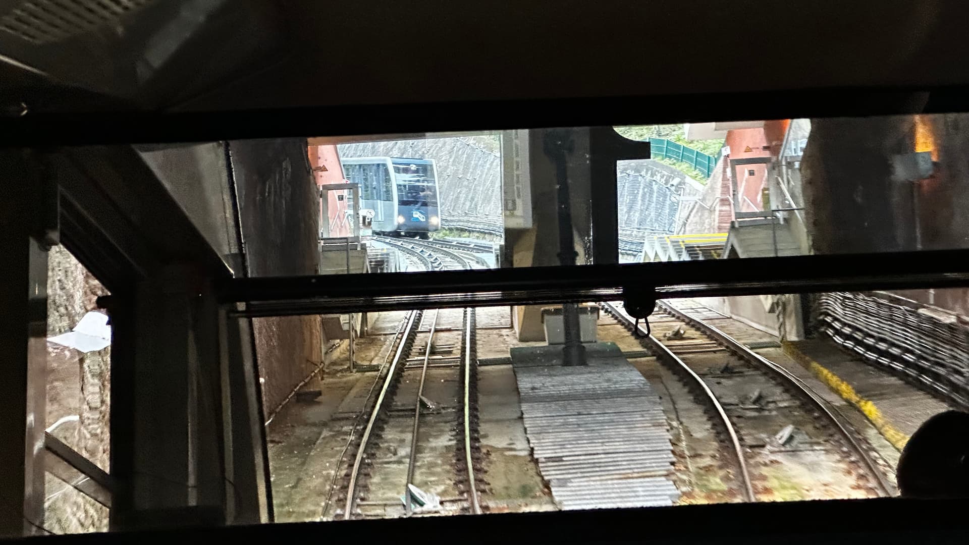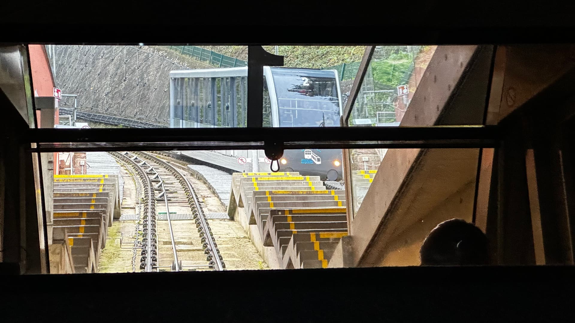 The funicular section uses two different vehicles: a passenger carriage with a stepped interior, and a freight platform. The latter can carry railway wagons with a standard gauge and total mass of 27 tonnes.
