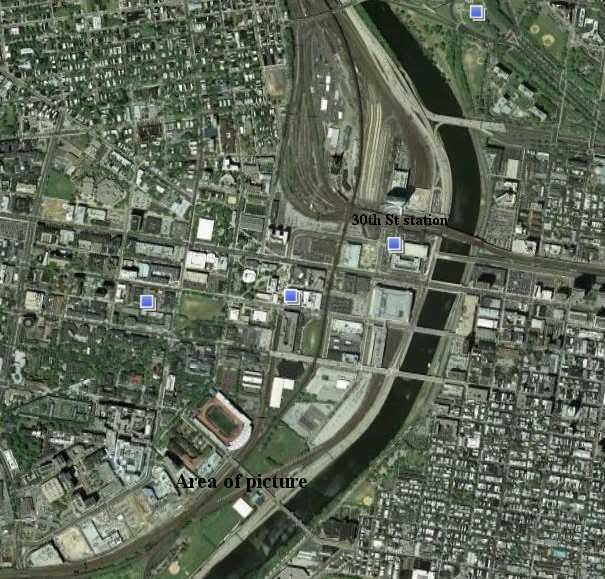 Almost forgot. Here’s a Google Earth shot of the 30th Street station area. On GE you can zoom in on it and follow the tracks.