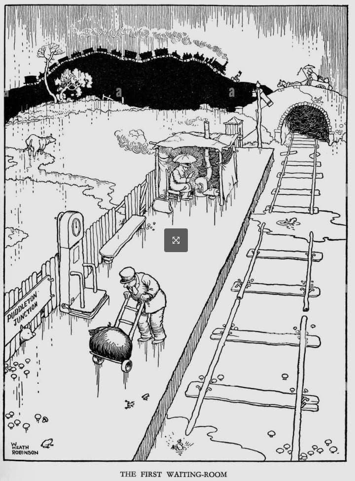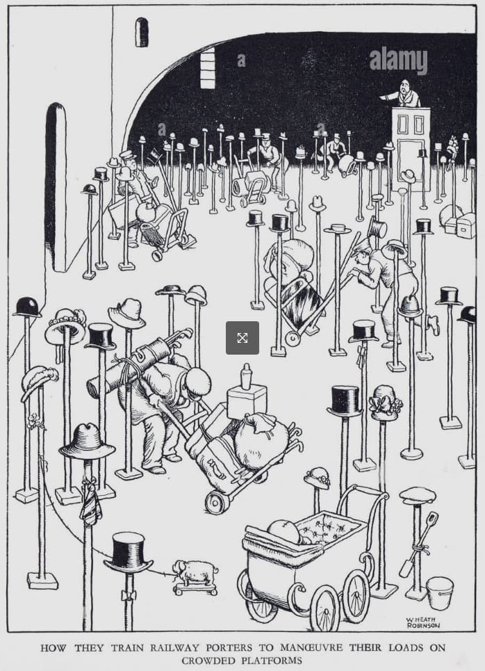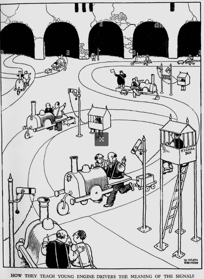 Also do a search on Rowland Emett. His Far Twittering and Oyster Creek Railway cartoons are a joy to peruse.