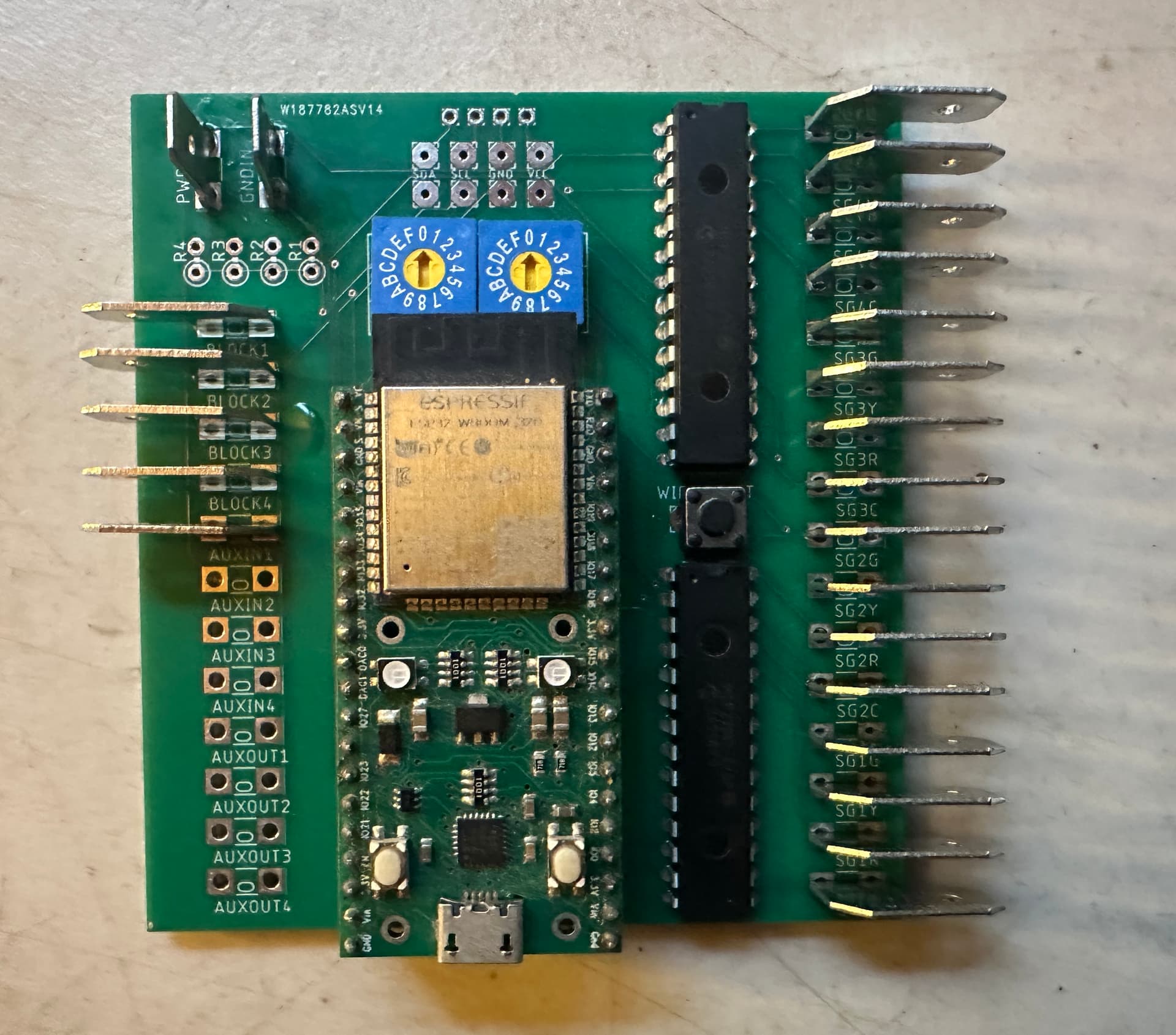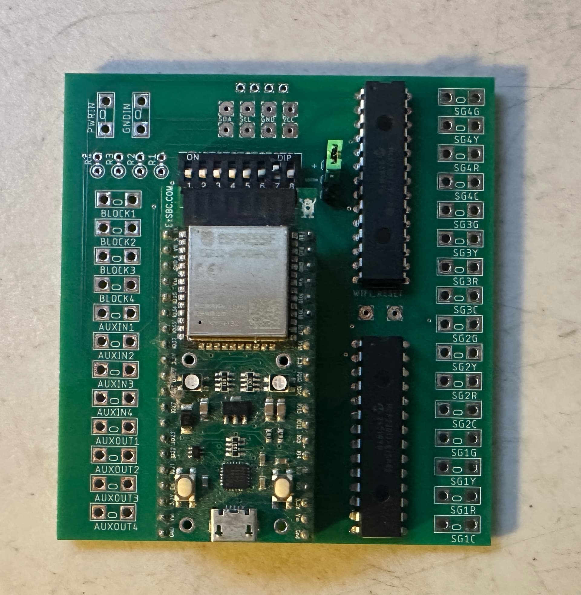 The initial code works like it should, but the hardware on the nodes changed somewhat, so I redesigned the board. Still controls four three-light signal heads, plus has two auxiliary outputs. Four block inputs plus two auxiliary inputs as well. And I added output buffers to increase current sinking capability.