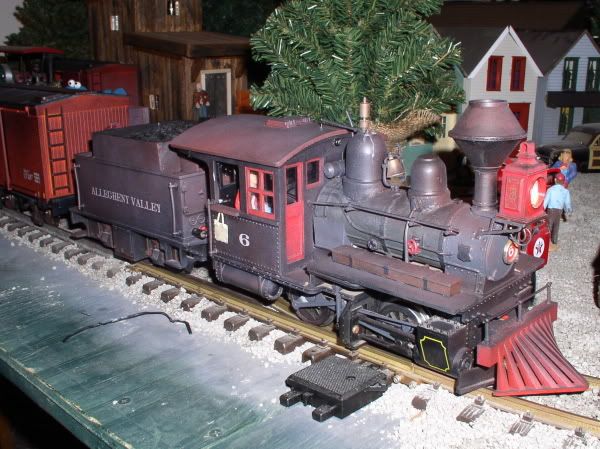 The basic layout is a simple R-1 loop with a short siding taking up about 5 feet by 8 feet, sitting on top of an old diningroom table. It is in 3 sections, so it can be broken down and moved. I had a bit more room after the last move, so I added a short spur line. For those coming up from smaller scales it might look a bit lacking is some details, the AV was started outside, and hopes to be again…eventually. This is very much a garden railroad moved indoors. Bare board (taken as I was breaking it down to move last time) track is held in place only by the ballast. Ballast is cheapy cat litter kept where it belongs with good old diluted white glue.
