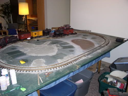 scratchbuilt oil well (no derrick) helps hid the fact that the table just ends in empty space behind it.
