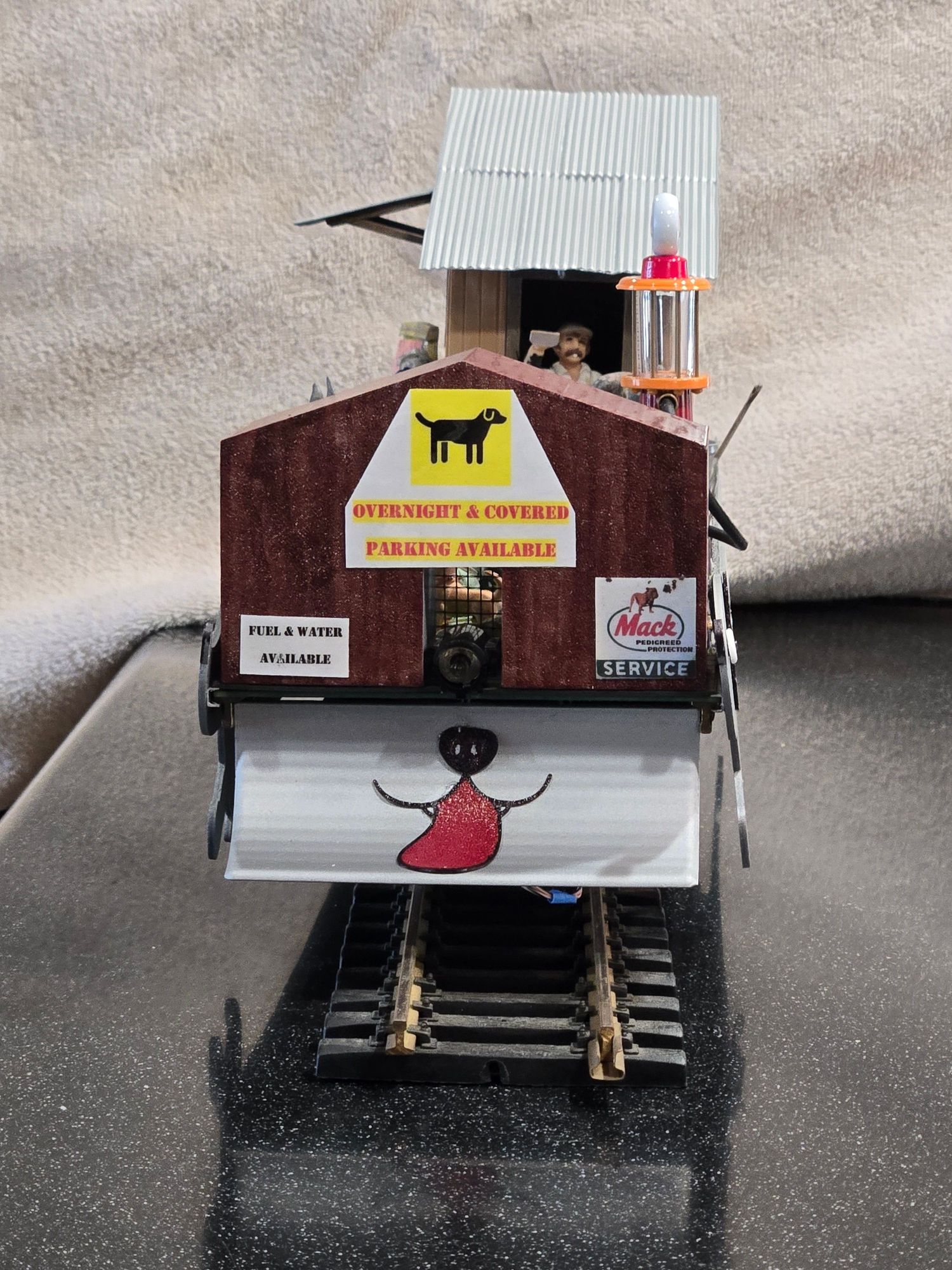 The railcar is currently occupied by 19 dogs and five people. People come to park their dog for the day while mulling about town or just going about their business. Some opt for the longer-term or overnight covered parking in the structure. We are a full-service facility, factory trained in servicing Mack Bulldog equipment, and carry the right Purina Chow to fuel even the most fussy of rides.