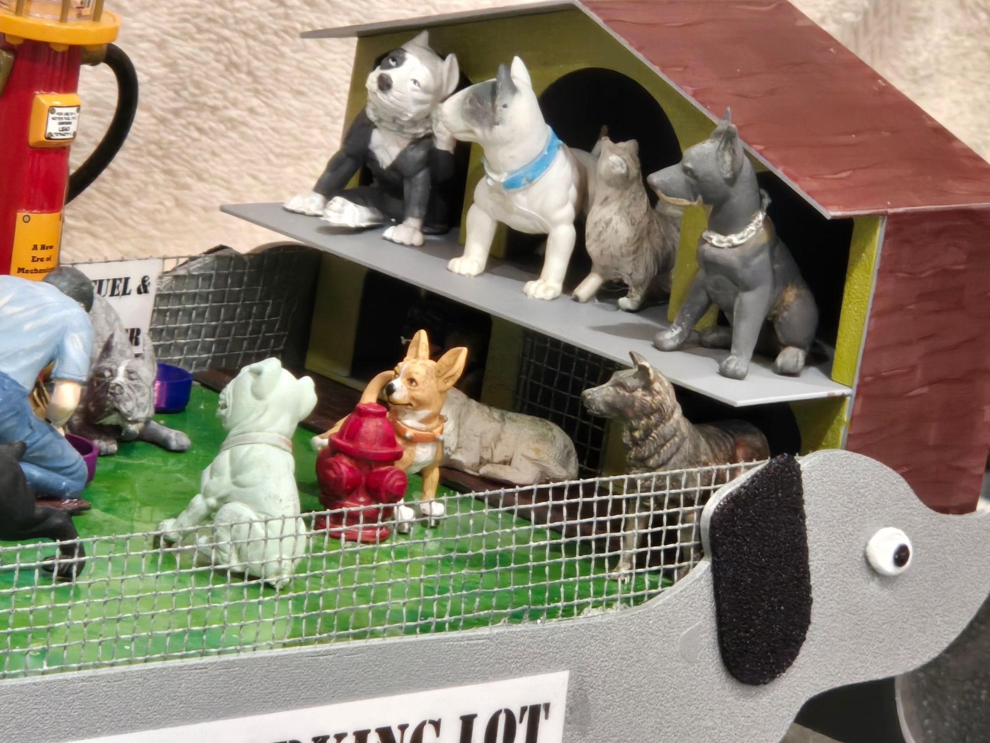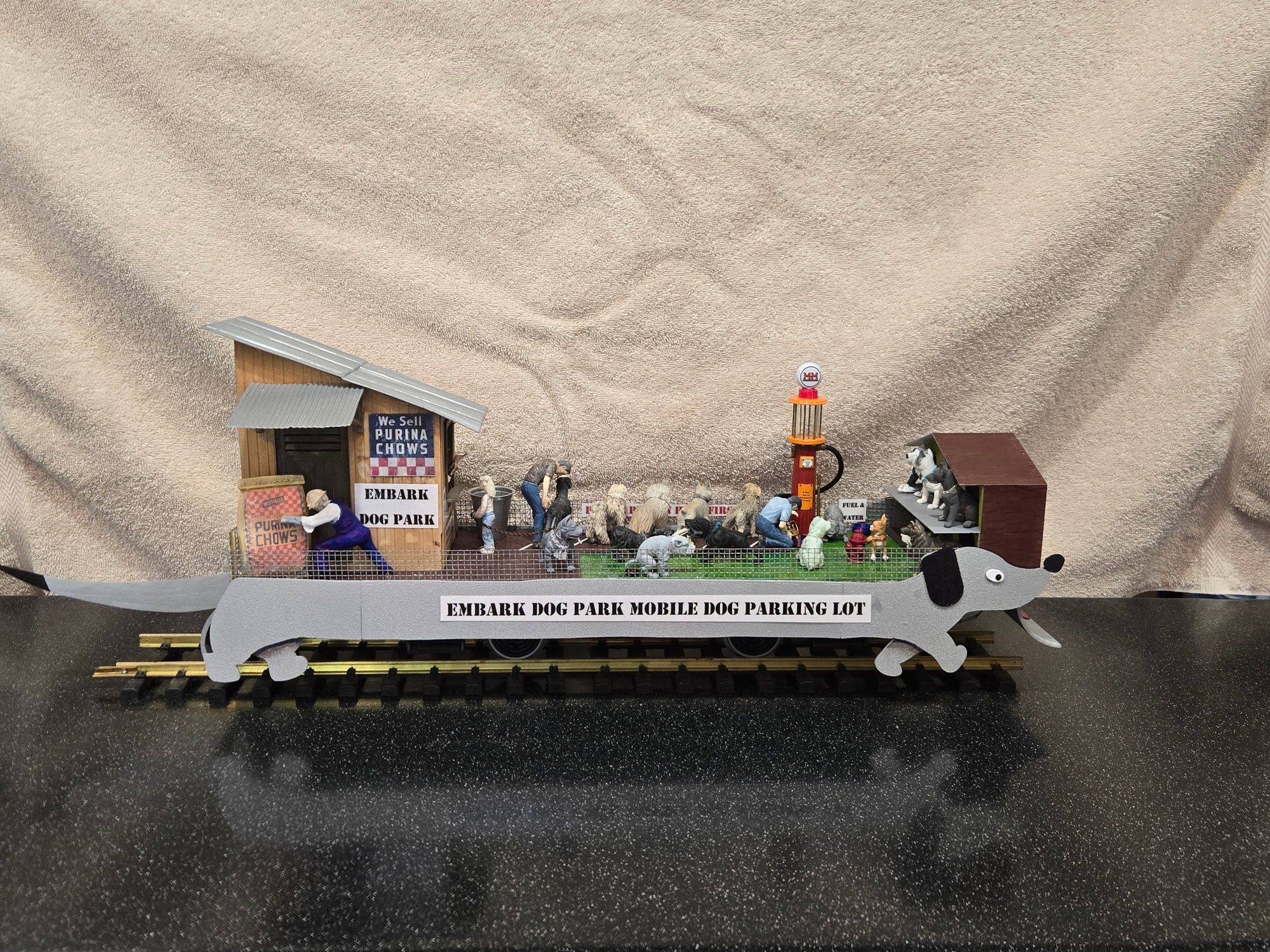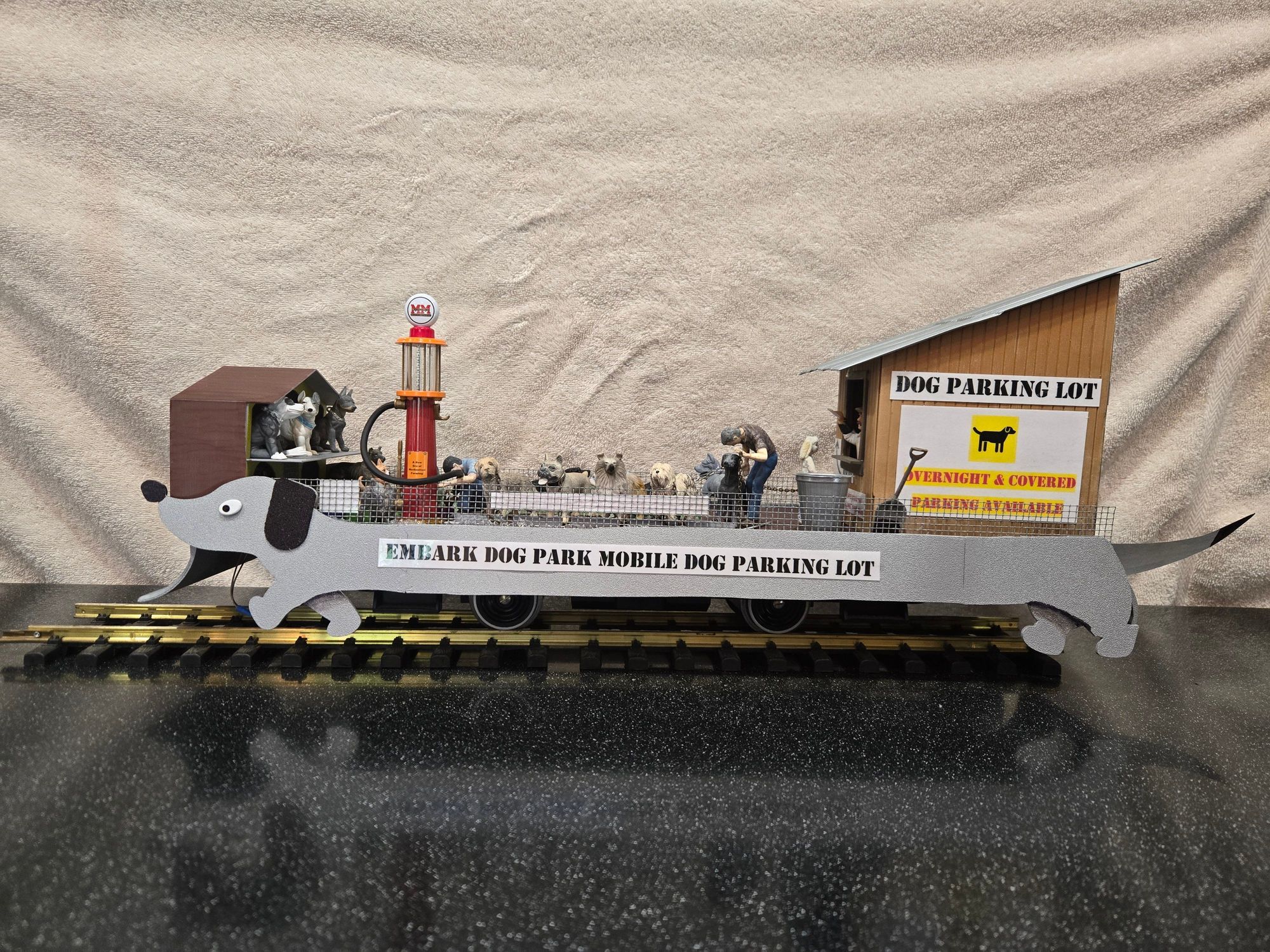 The plan was to have two dogs circle a fire hydrant; one peeing (yellow-colored fishing line) while the other is “scratching” his butt. Additionally, two dogs were to tussle over a bone and I wanted the railcar itself to have some animation. Other dogs would be “parked” like cars, both in lined spaces and, less formally, in the “parking structure.” The railcar itself was to resemble a dog walking along the tracks and a structure would be necessary to conceal the workings.