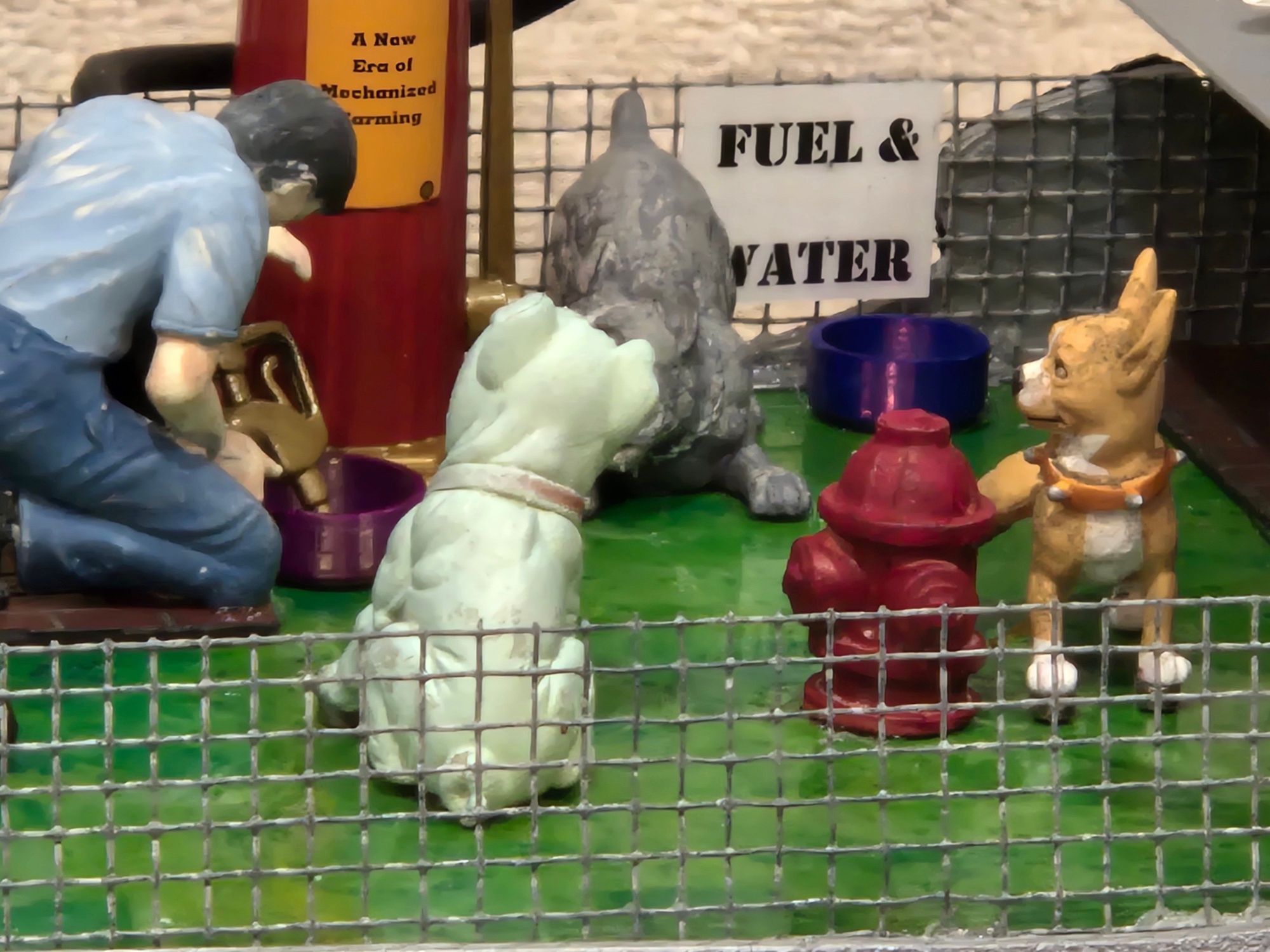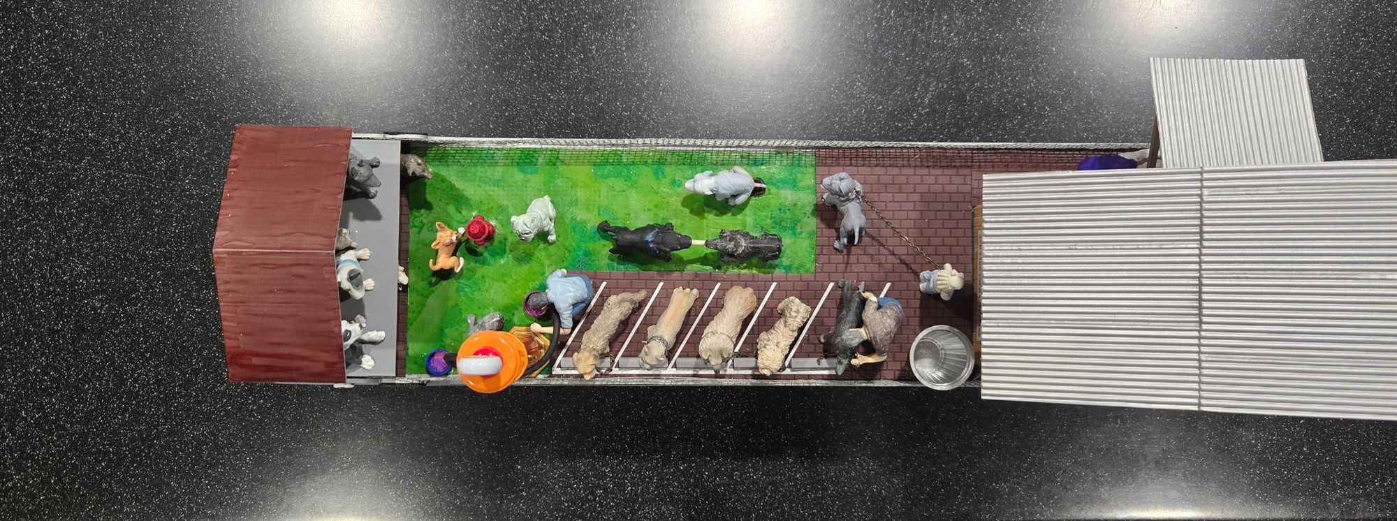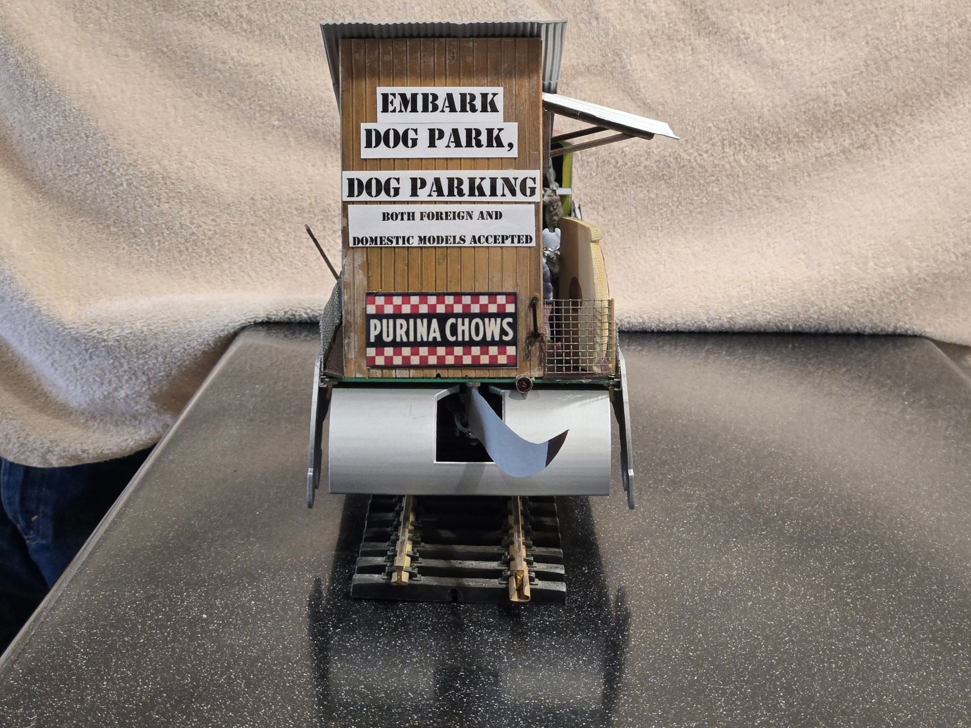 The plan was to have two dogs circle a fire hydrant; one peeing (yellow-colored fishing line) while the other is “scratching” his butt. Additionally, two dogs were to tussle over a bone and I wanted the railcar itself to have some animation. Other dogs would be “parked” like cars, both in lined spaces and, less formally, in the “parking structure.” The railcar itself was to resemble a dog walking along the tracks and a structure would be necessary to conceal the workings.