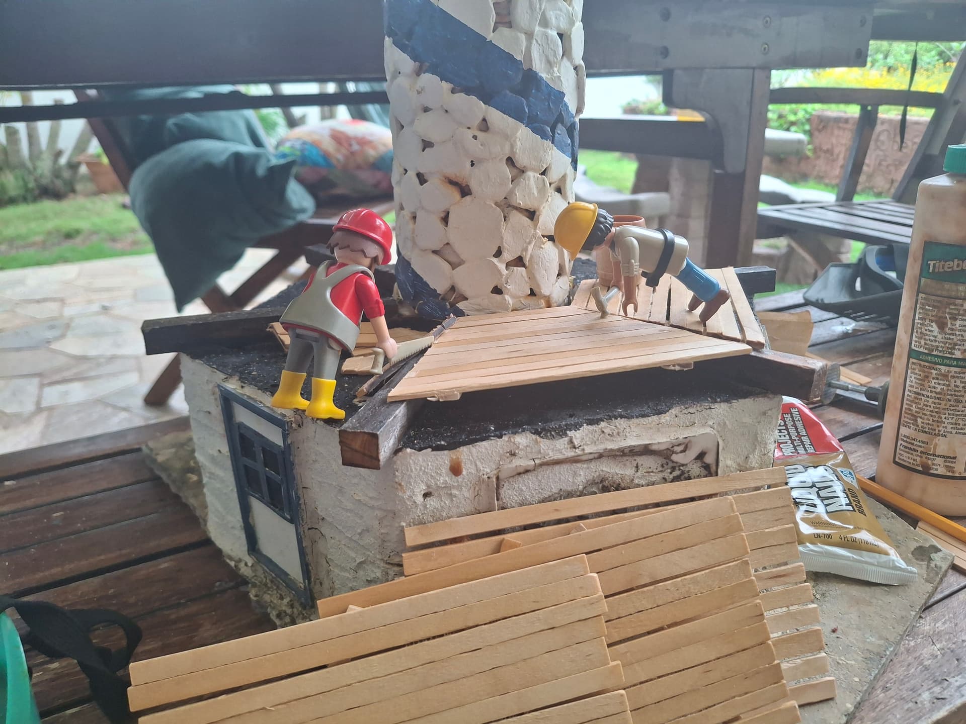 - Make the model moveable. We have learned to accept the knicks and scrapes of moving things on and off the lanai. These are easy to repair. We build to the exacting standars of 1:24-ish PLAYMOBIL scale, anyway, so none of our structures are loaded with fine detail!